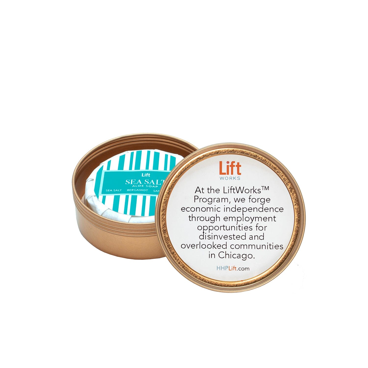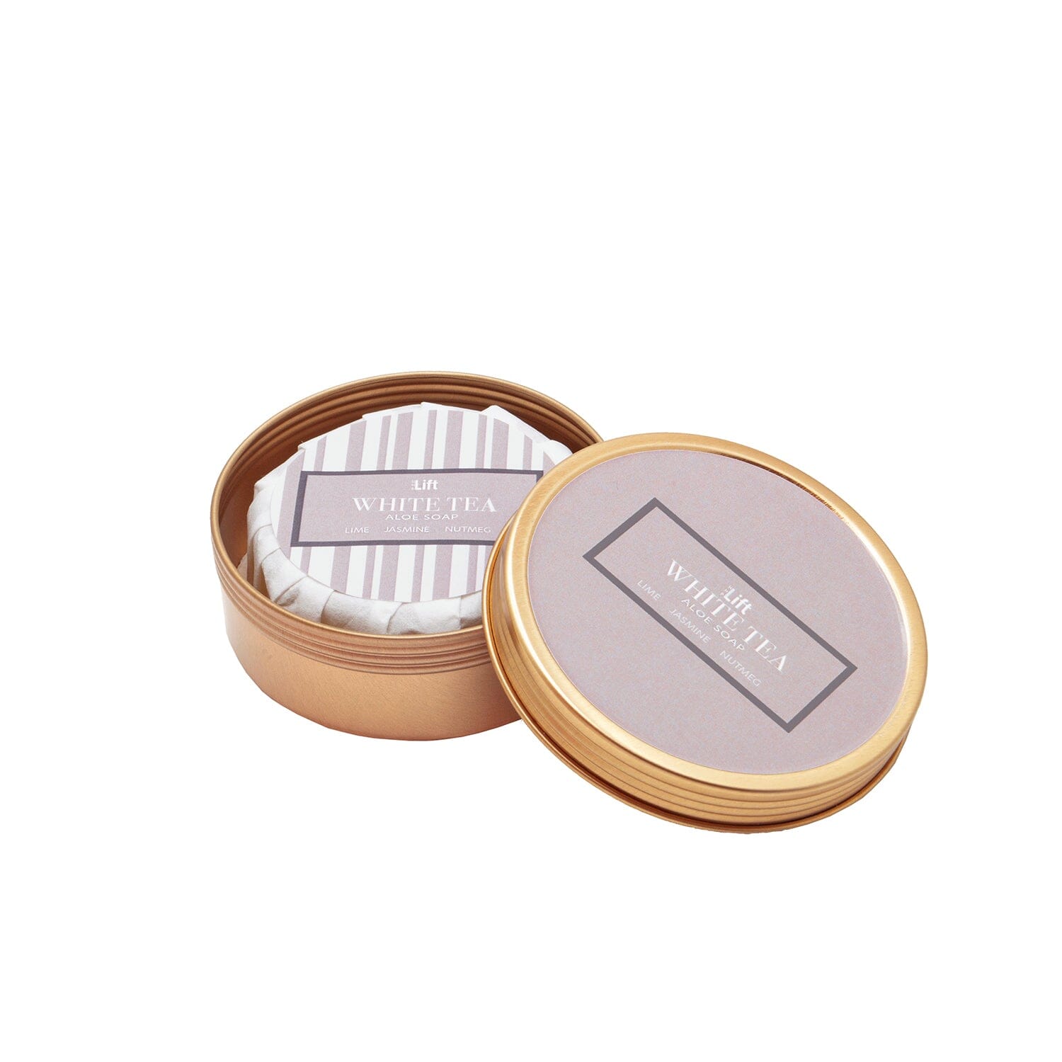 A 3.5 oz. round bar of scented, luxe aloe glycerin soap. Packaged in a 4 oz. reusable gold tin.