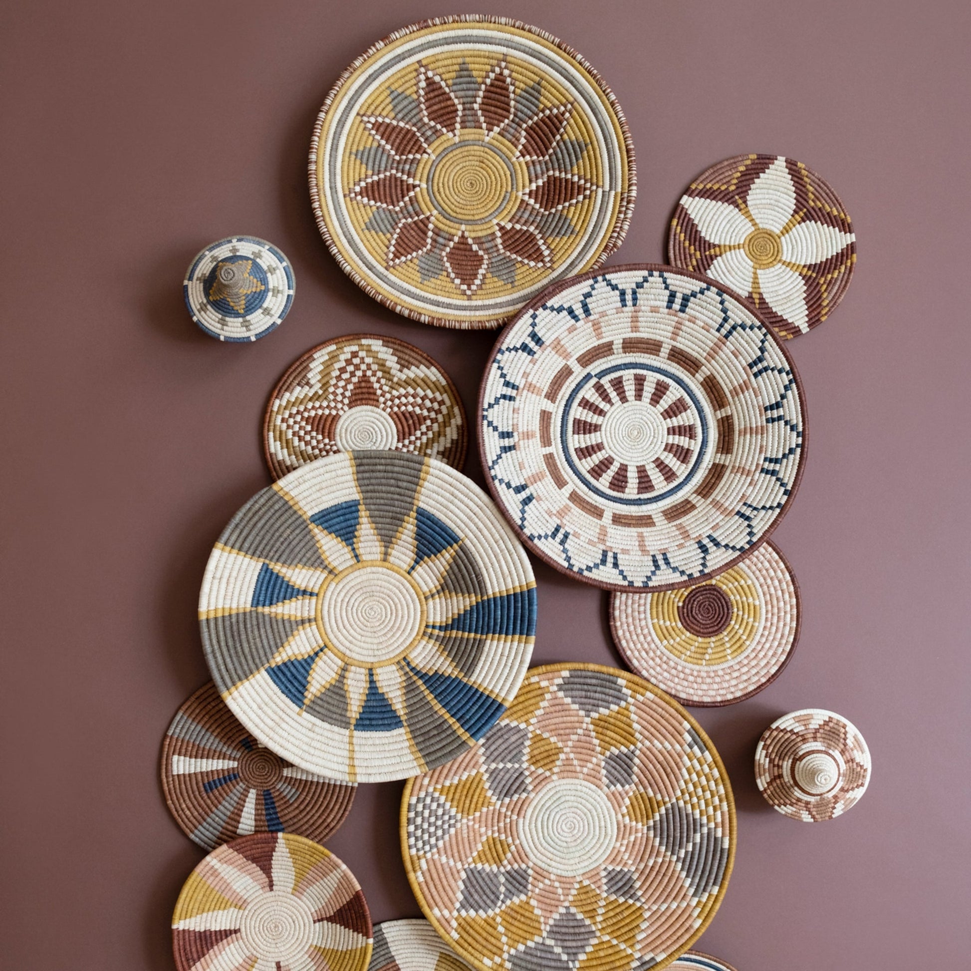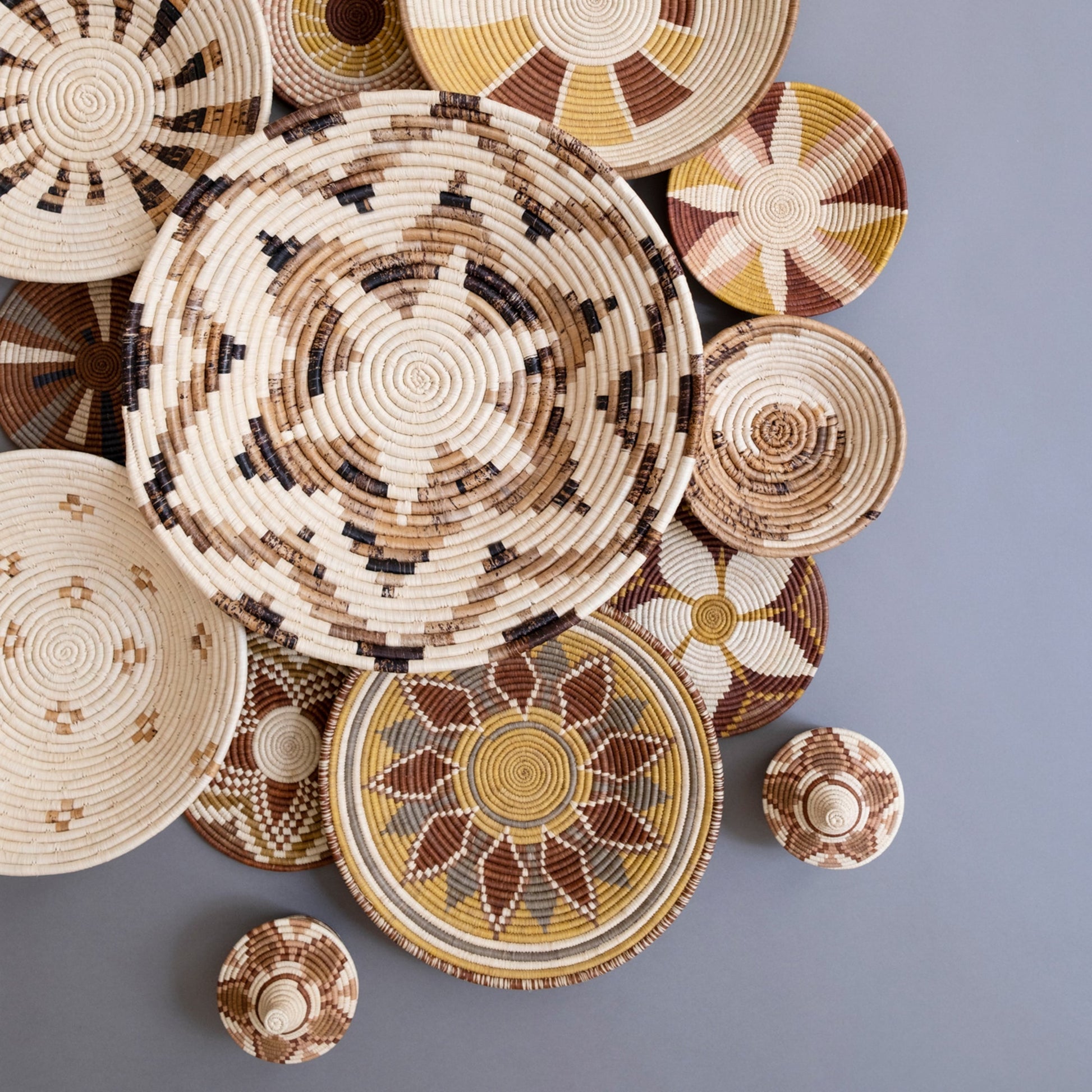 - The hand-dyed raffia is twisted and wrapped around coils of banana fibers, creating structure and intricate designs.