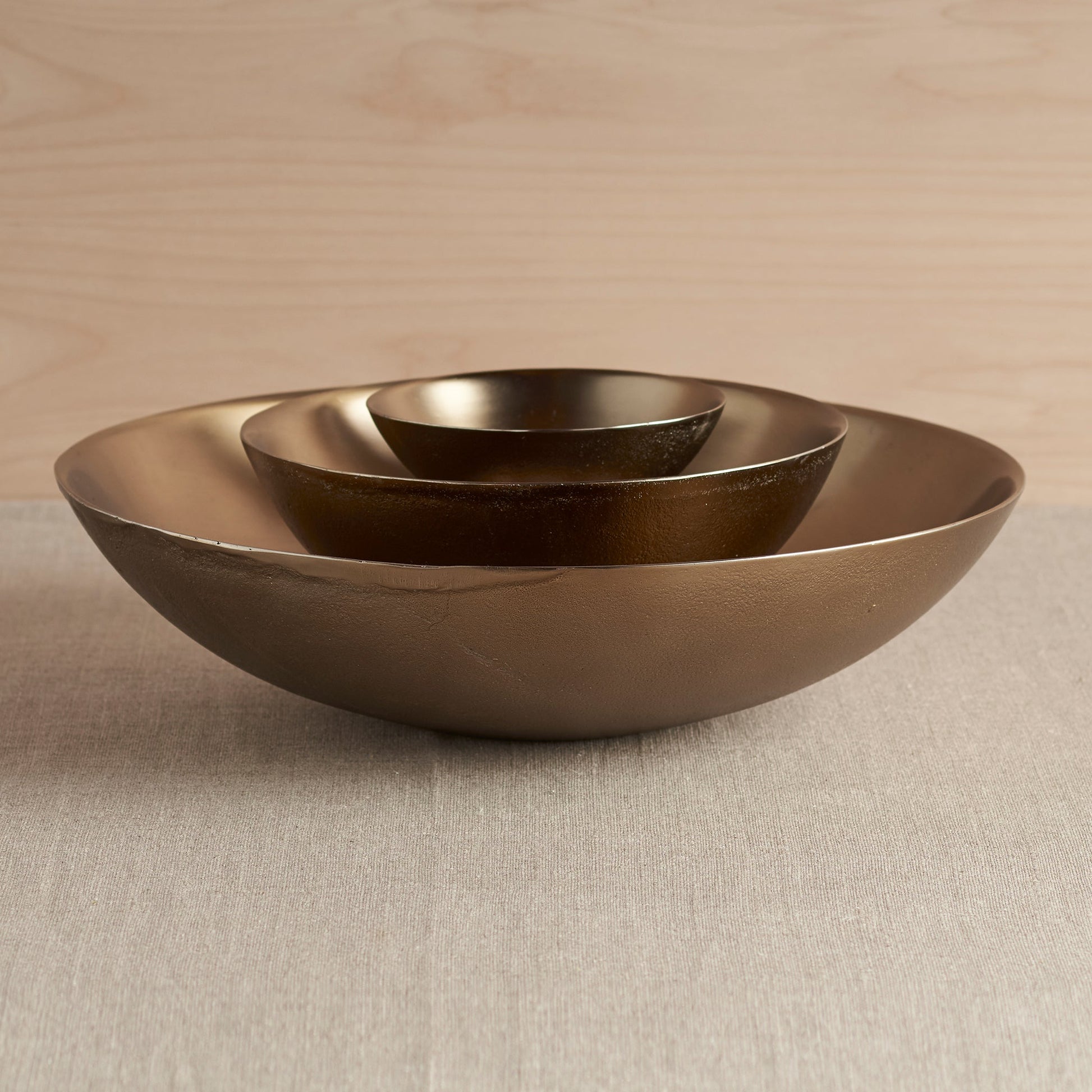 A set of three textured, hand-cast bowls provides options for display and serving with style. The polished antique brass finish adds a subtle metallic sheen that complements both modern and classic decor, making these bowls ideal for everyday use as well as for grand gatherings. Bowls nest for easy storage.