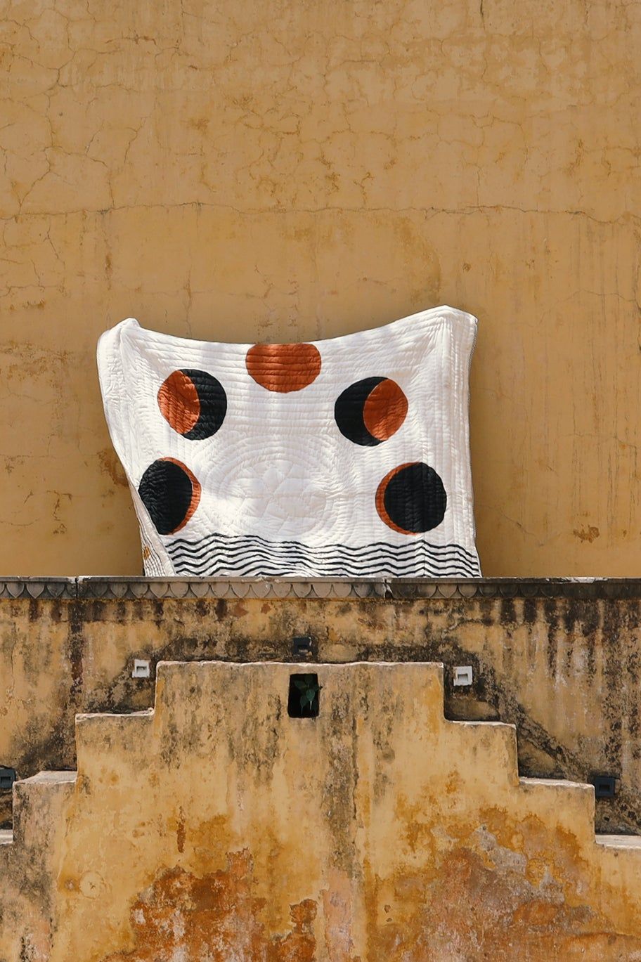 This reversible, hand-printed quilt on a crisp white base presents a modern take on lunar motifs. One side showcases a prominent brown moon, while the flip side features the lunar cycle in shades of black and brown. Each quilt is handmade from 100% cotton and requires attention from four artisans, including wood carvers, block printers, quiltmakers, and dye specialists. The design is hand-pressed onto each quilt using hand-carved wooden blocks dipped in dyes. The printed cotton shells are brought to the homes of quiltmakers, who stuff and stitch the quilts by hand, creating the final product. Our quilts are made in small batches. Due to the handcrafted nature of this item, expect slight variations in the appearance of each unique piece. - 100% cotton voile exterior - 100% cotton stuffing - Made in India - Ships from California - Queen size: 96″ x 96″ - King size: 108″ x 108″ - Sham size: 26″ x 26″