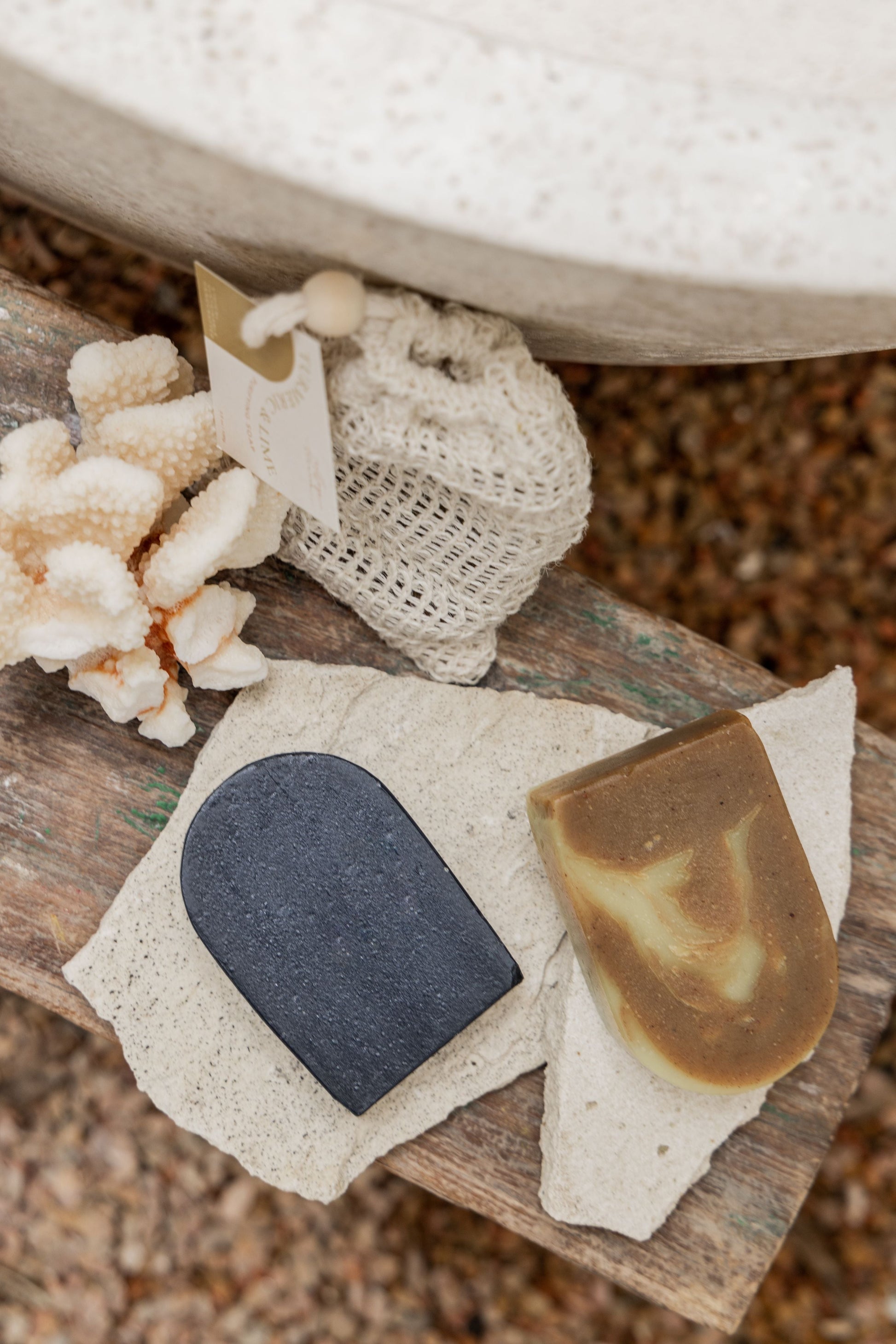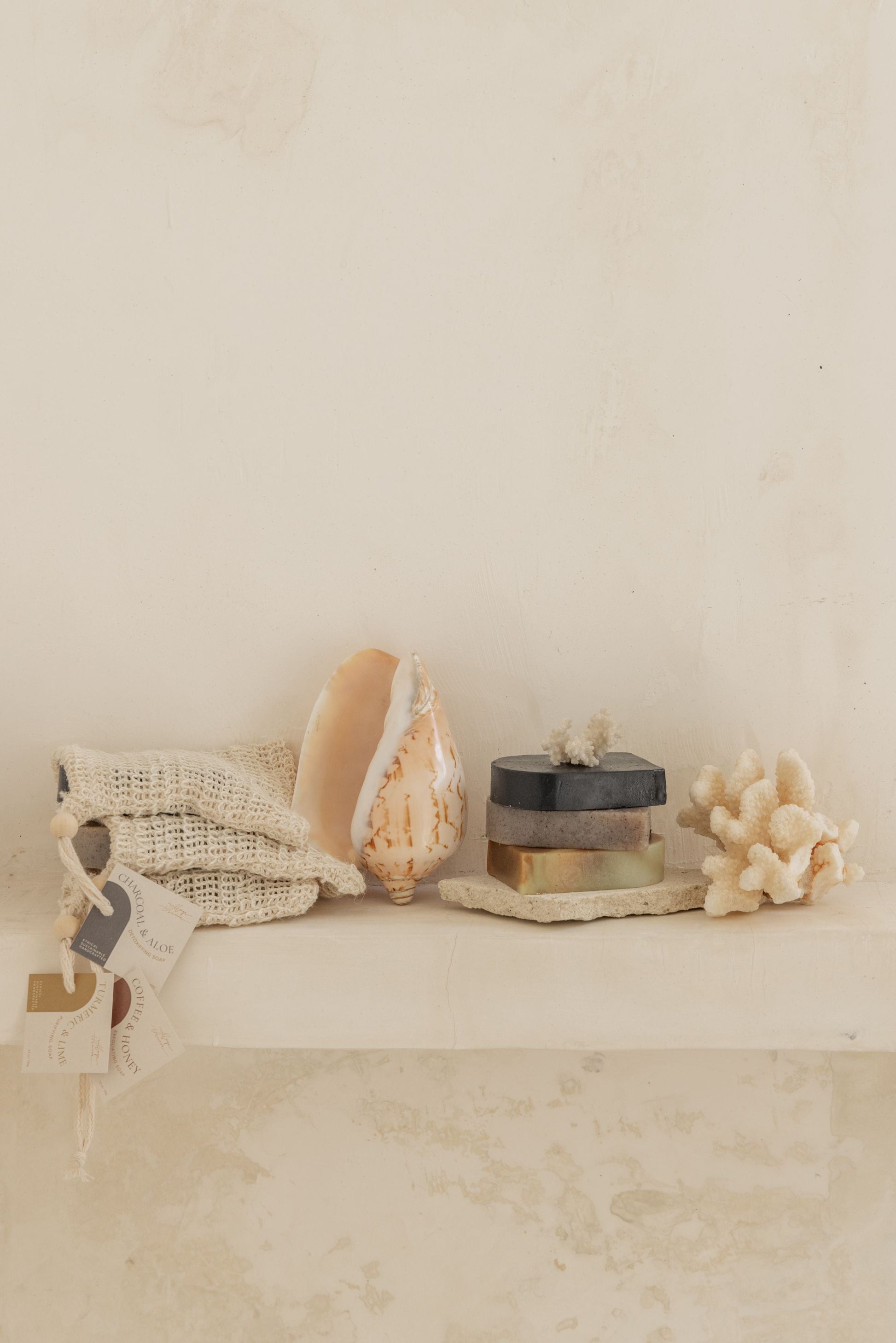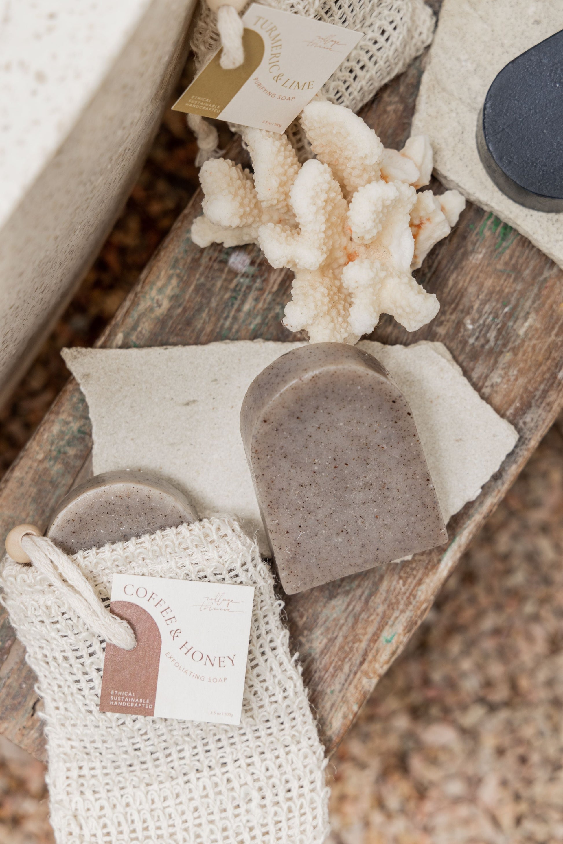 This set comes with one of each soap: Charcoal&Aloe, Turmeric&Lime, and Coffee&Honey and a natural exfoliating sisal drawstring bag for each bar.