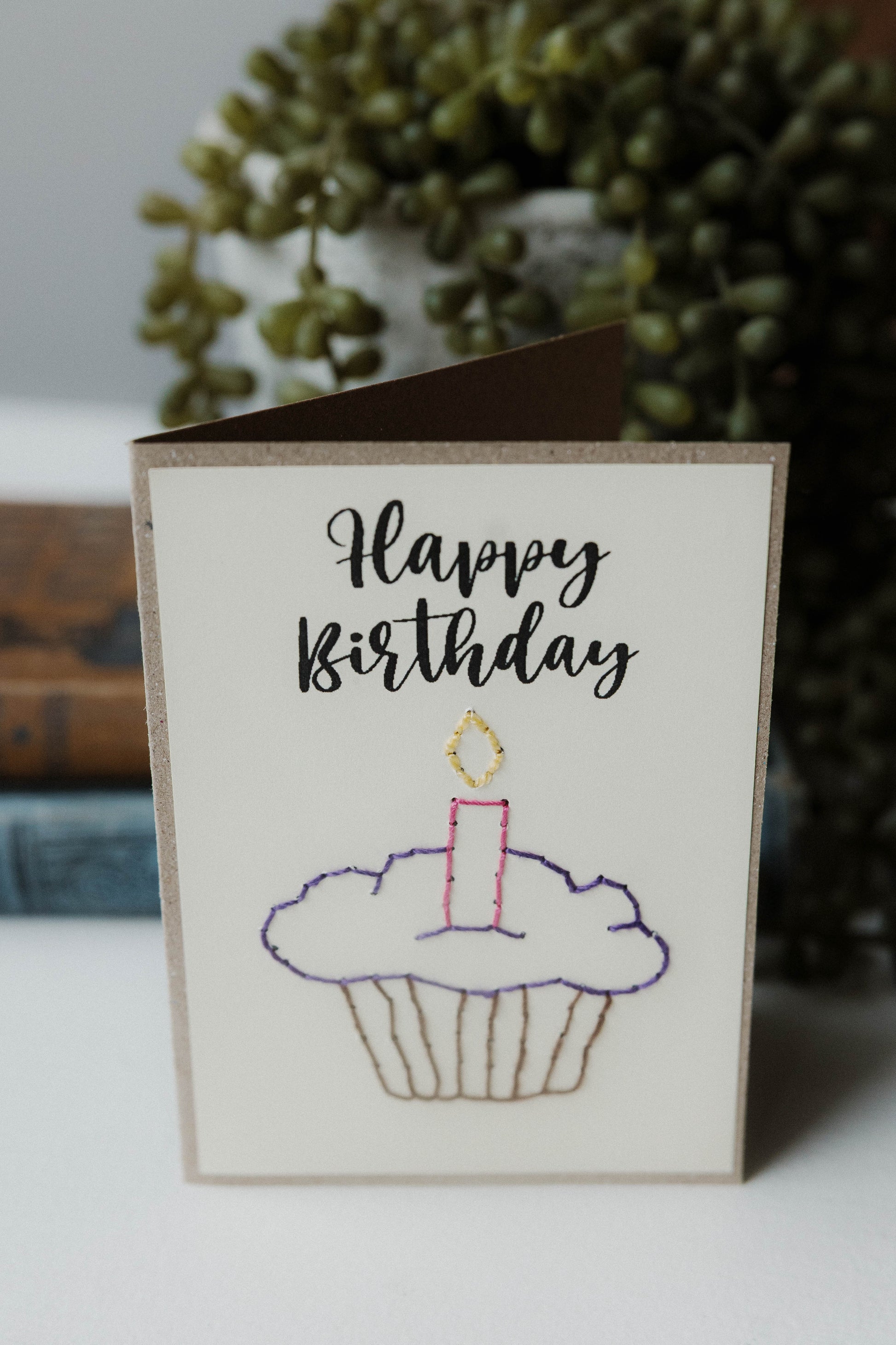 Set of 4 assorted cards with a colorful cupcake stitched pattern and message that reads "Happy Birthday"