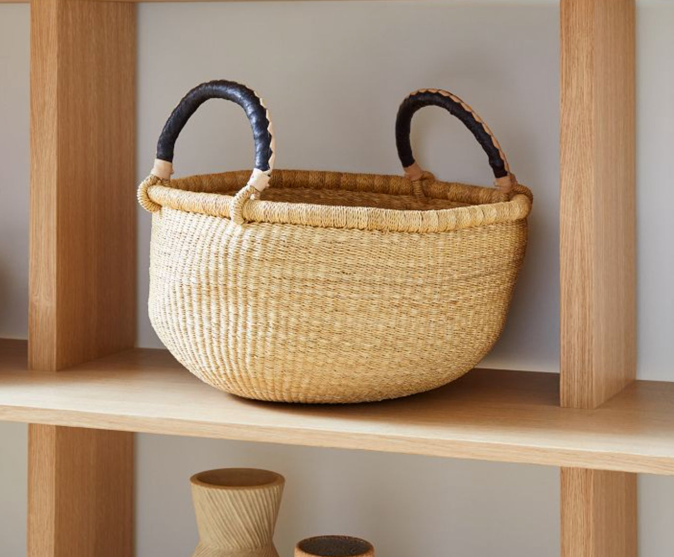 The large round is one of our most popular styles and the two handled version is new for us. Perfect for all your storage and home decor needs, it can also be used as a decorative addition for plant pots. The black and white goat leather handle is the signature of the collective we buy from.