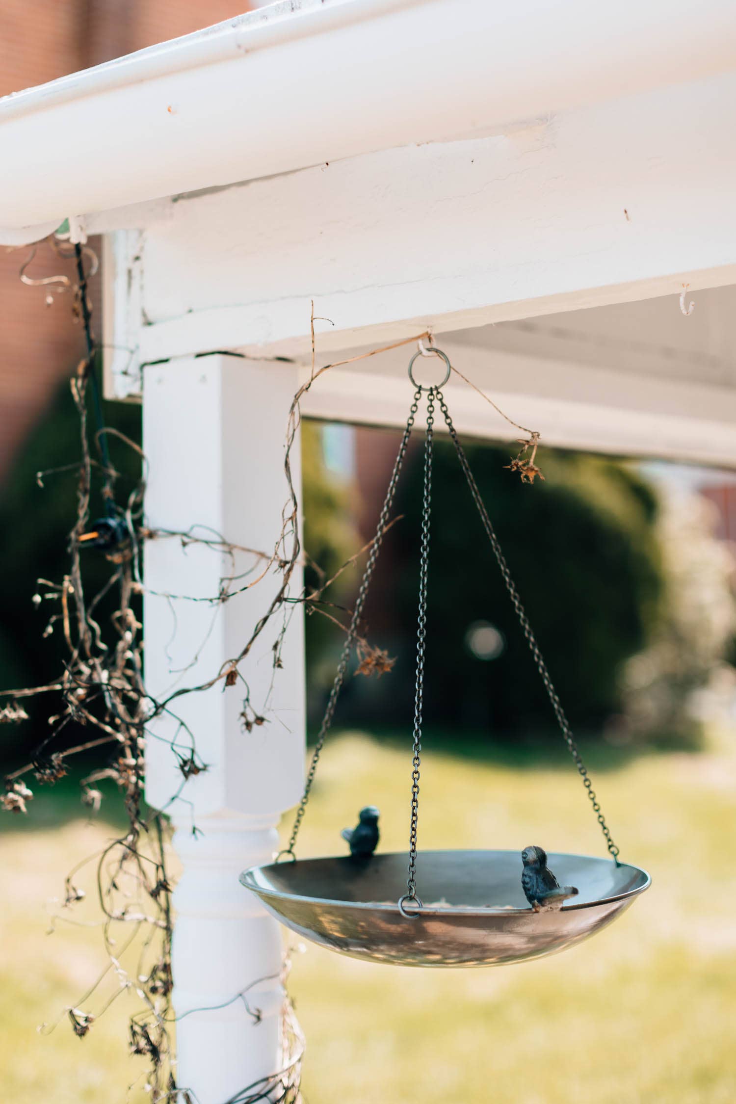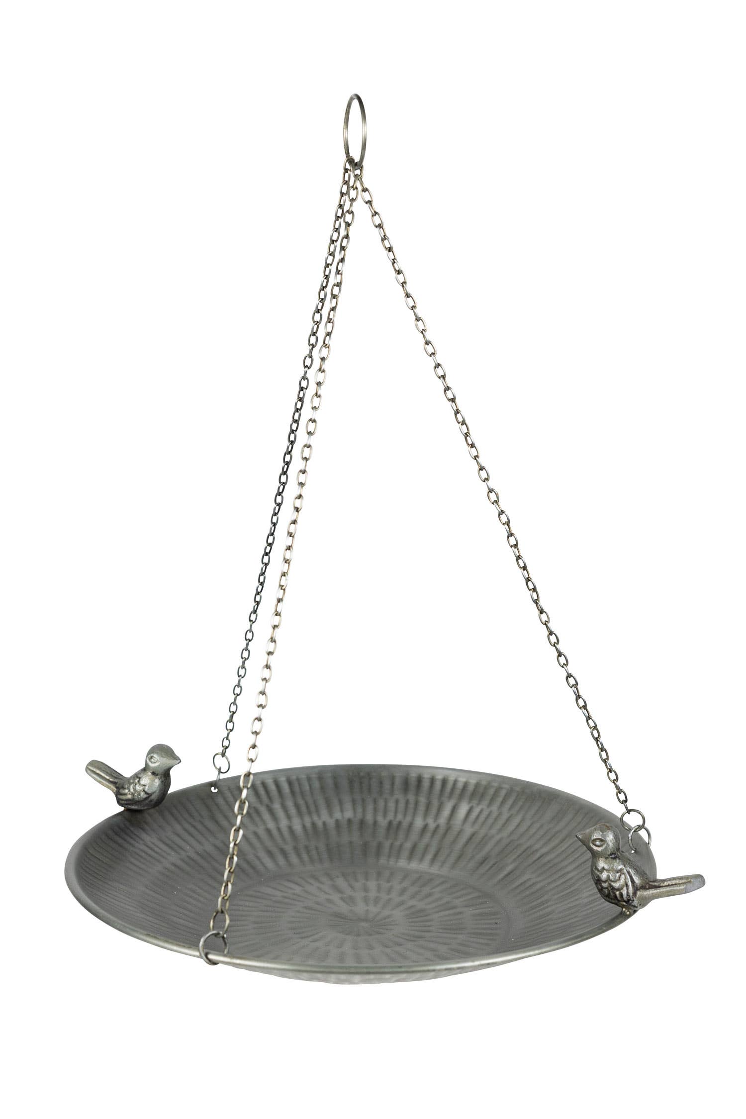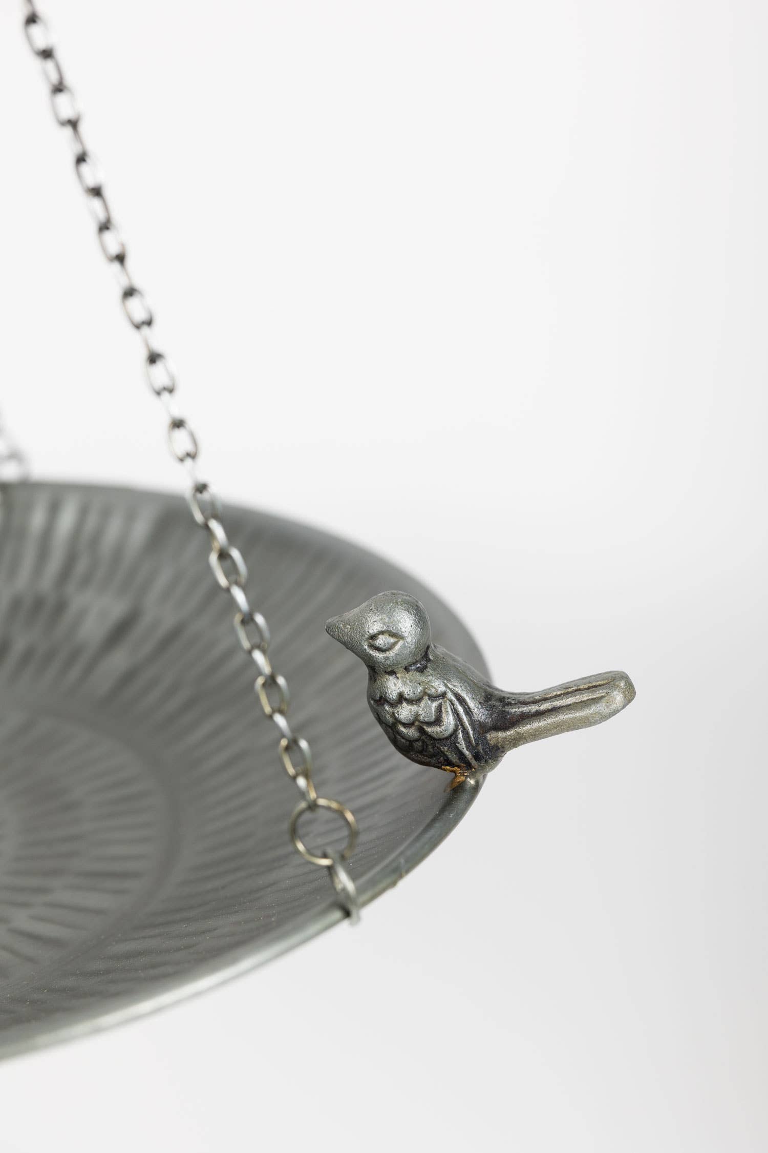 Iron with a black antique finish - Birdbath bowl is 12.75" in diameter and 2" high. The distance between the tail tips of the two birds is is 15.5" - Height is 17.5" to top of hanging ring - Handcrafted in India