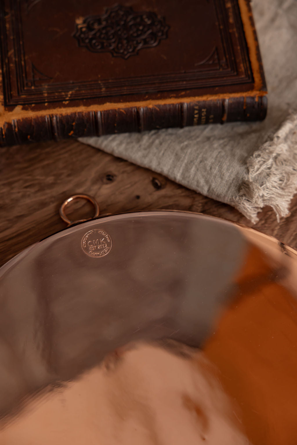 Dimensions: Available in 11" or 12" Diameter | Tin-linedInspired by a set of 4 antique graduated round trays Beth Ann has in her kitchenCrafted from very heavy-gauge copperOur Vintage Copper Round Baking Tray is modeled after a set of antique round trays that hang in Beth Ann’s own kitchen. Crafted from a very heavy gauge of copper and lined with tin for even baking, this tray is as durable as it is beautiful. Whether you’re making rustic flatbreads or baking tarts, its weight, balance, and glow make it a reliable heirloom. Available in two sizes, it functions just as beautifully as it displays. At Coppermill Kitchen, we craft vintage-inspired copper bakeware that honors form, function, and tradition. Hang with a decorative hook for display or serve warm bread straight from the oven. Hand wash and dry well to maintain the tin lining and natural copper finish.
