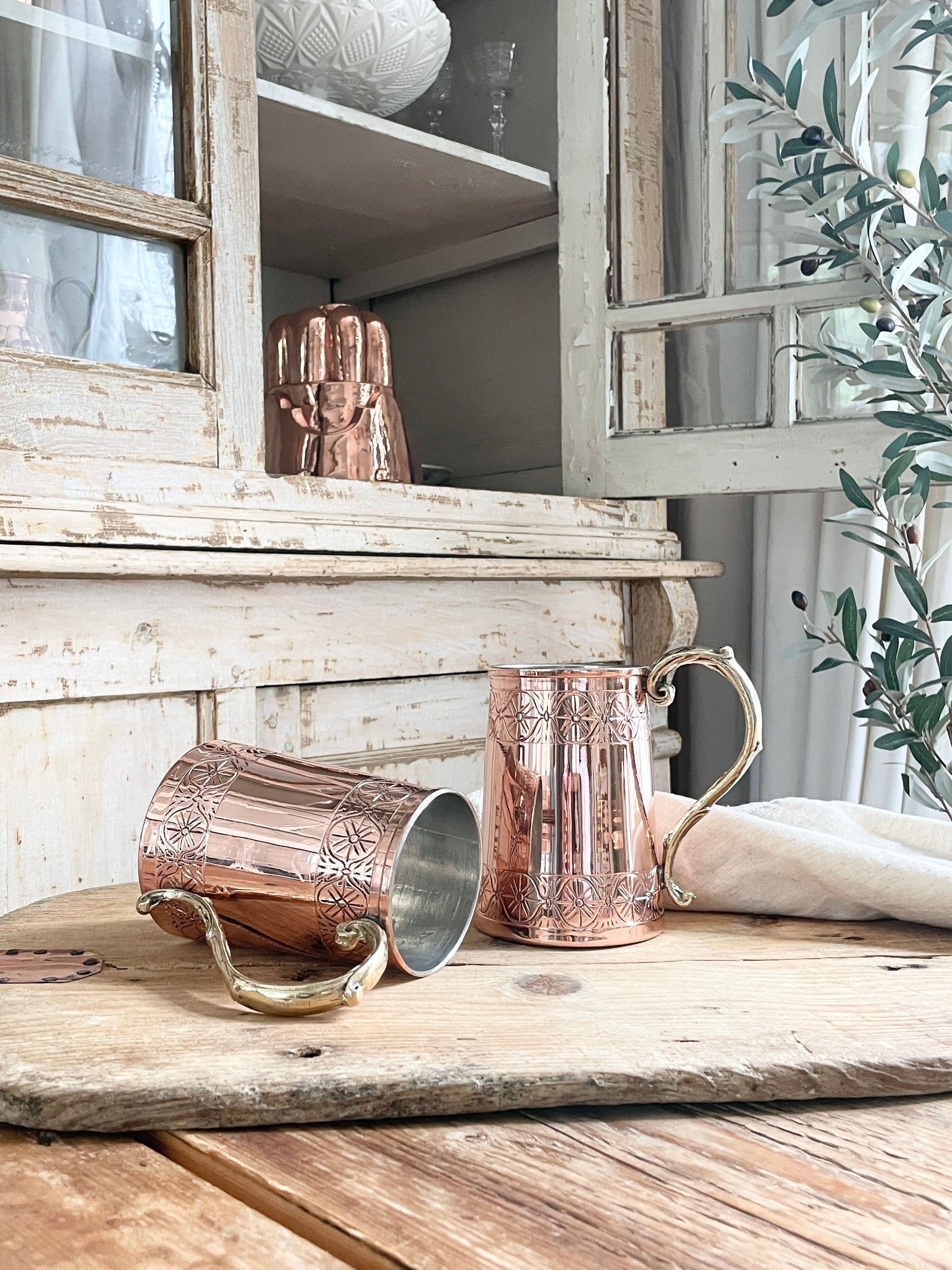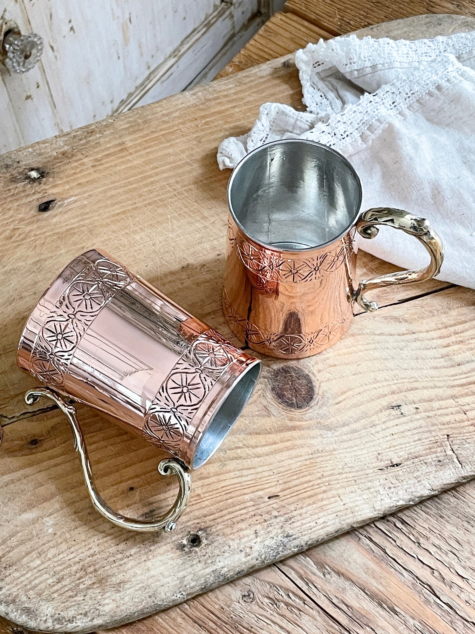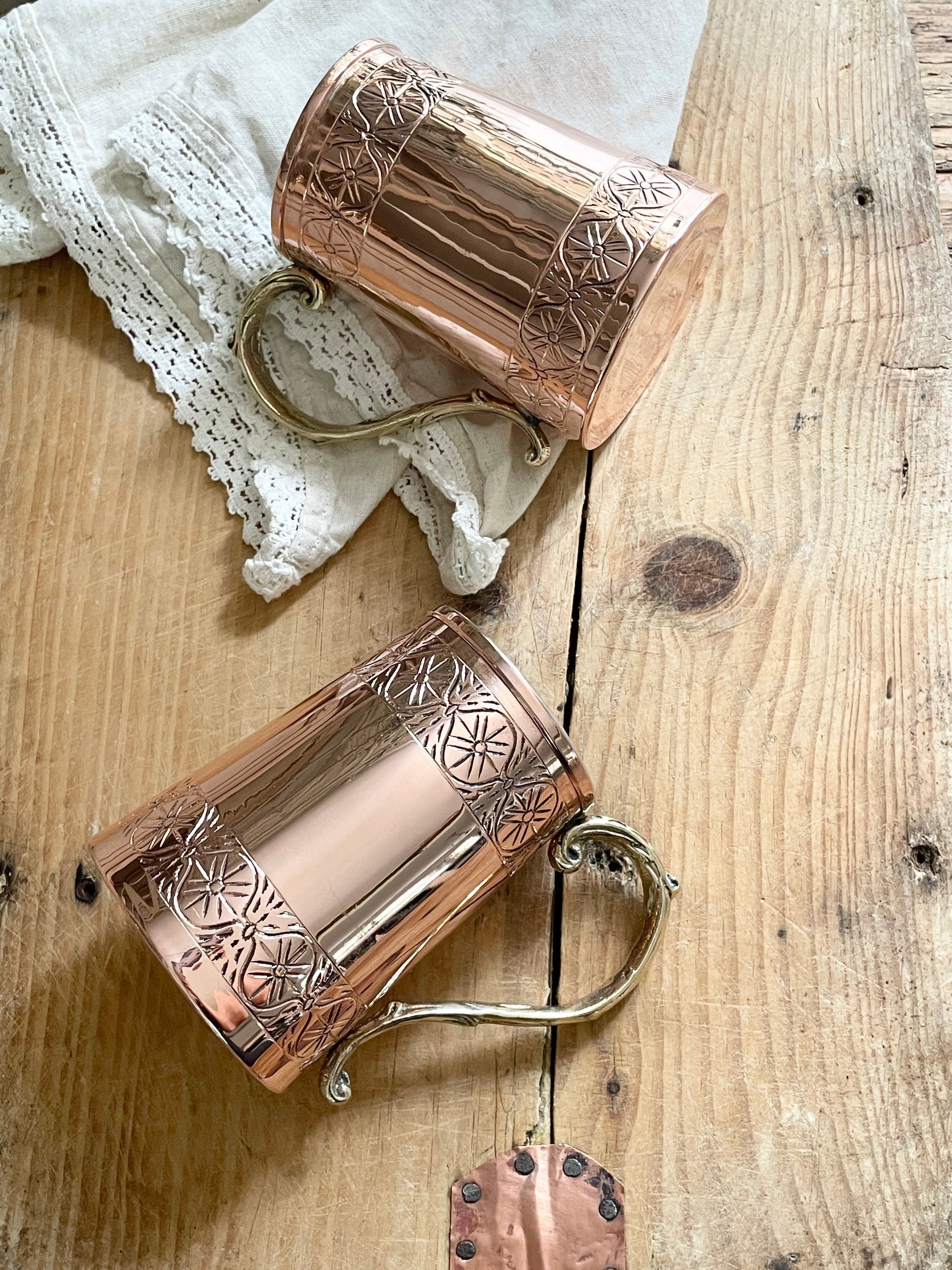 Discover the charm of old-world craftsmanship with our Vintage Inspired Tankard Mug, a creation born from the keen eye and creative spirit of our founder, Beth Ann. Drawing inspiration from an antique stein she encountered in England, Beth Ann reimagined this classic piece with an attention to detail that bridges history with modernity. The tankard features a brass casted handle, meticulously designed for both aesthetic appeal and comfortable grip, alongside a hand-applied pattern adorning the top and bottom, giving it a distinctive look. Made from a heavy gauge copper, this mug is not only a nod to the past but a durable vessel for your drinking pleasure, perfect for enjoying your favorite beer or crafting an artisan cocktail.