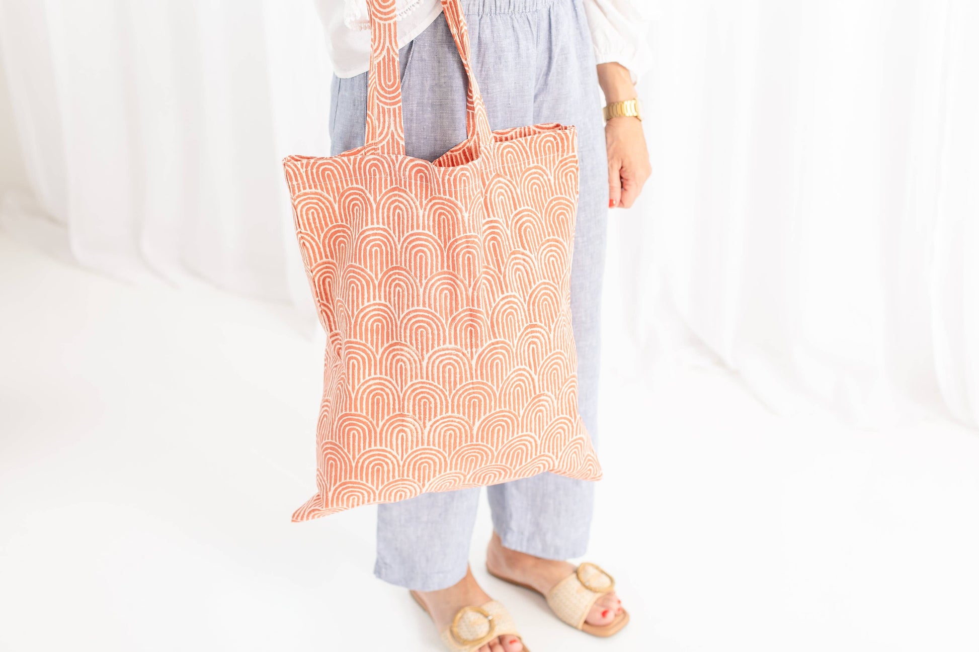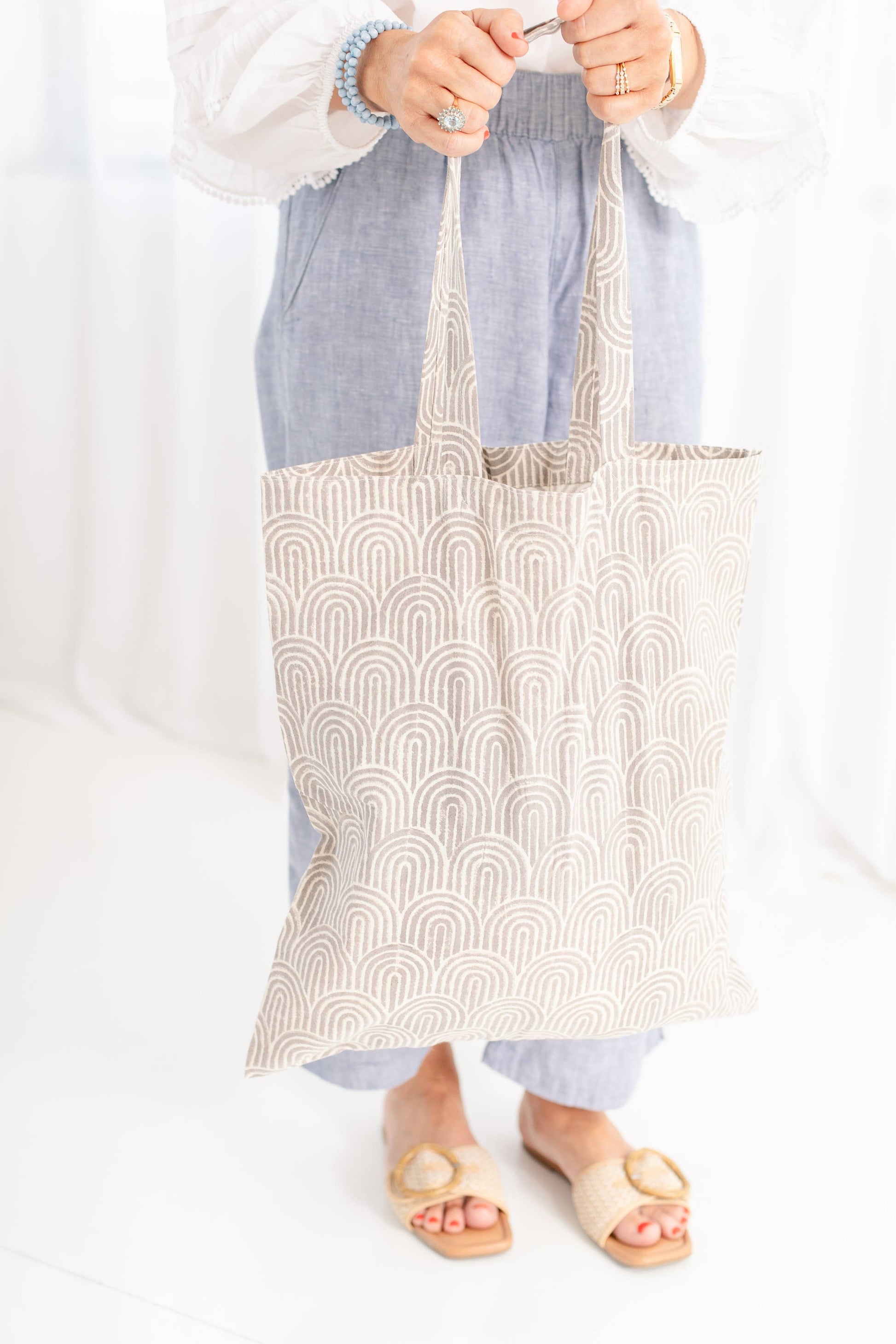 Cotton Block Print Market Tote-Gray, Green, Rust