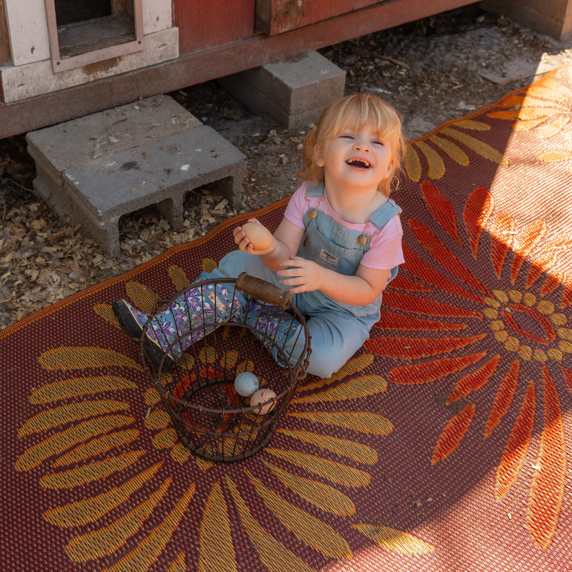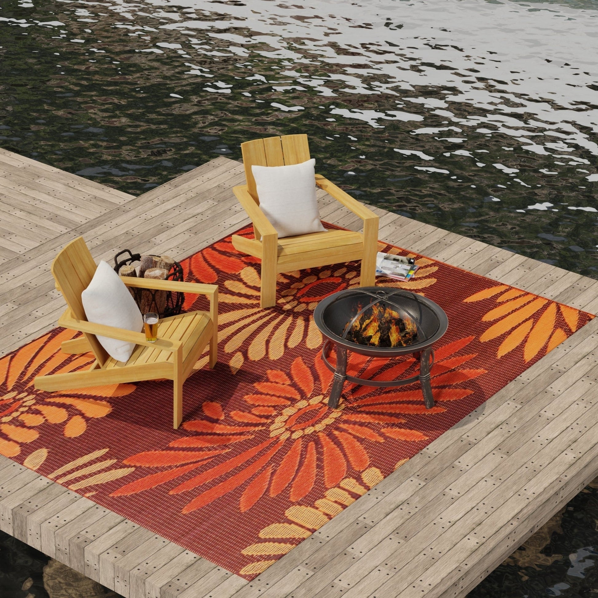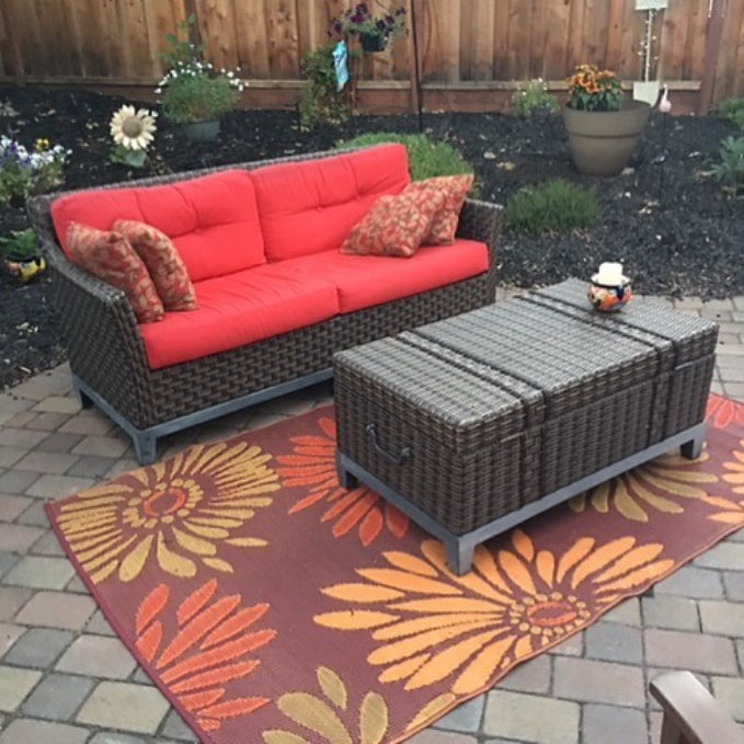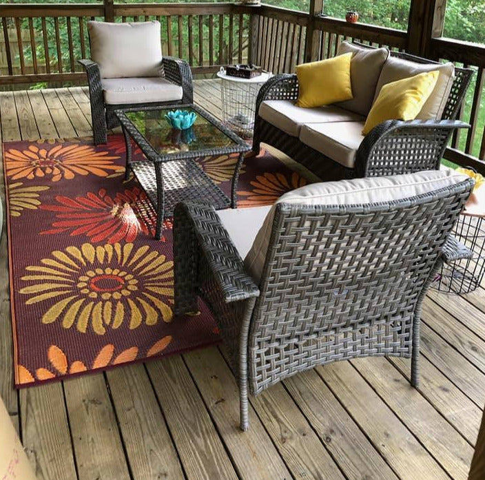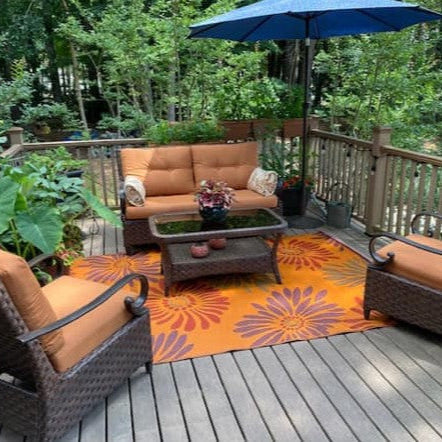 Featuring larger than life flowers against a colorful background, these richly toned, bold rugs are made of recycled plastic for outdoor or indoor use. Mad Mats® are made from 100% recycled plastic, are UV protected and fade-proof, and come with our one-year color guarantee. Because our rugs are handmade, pattern, color and size may vary slightly.