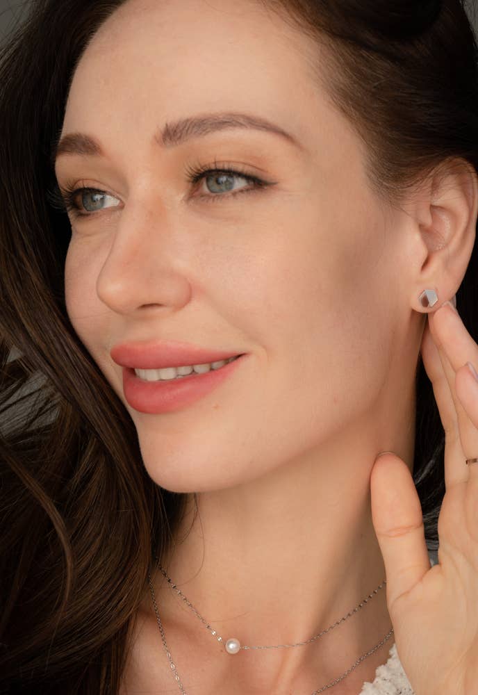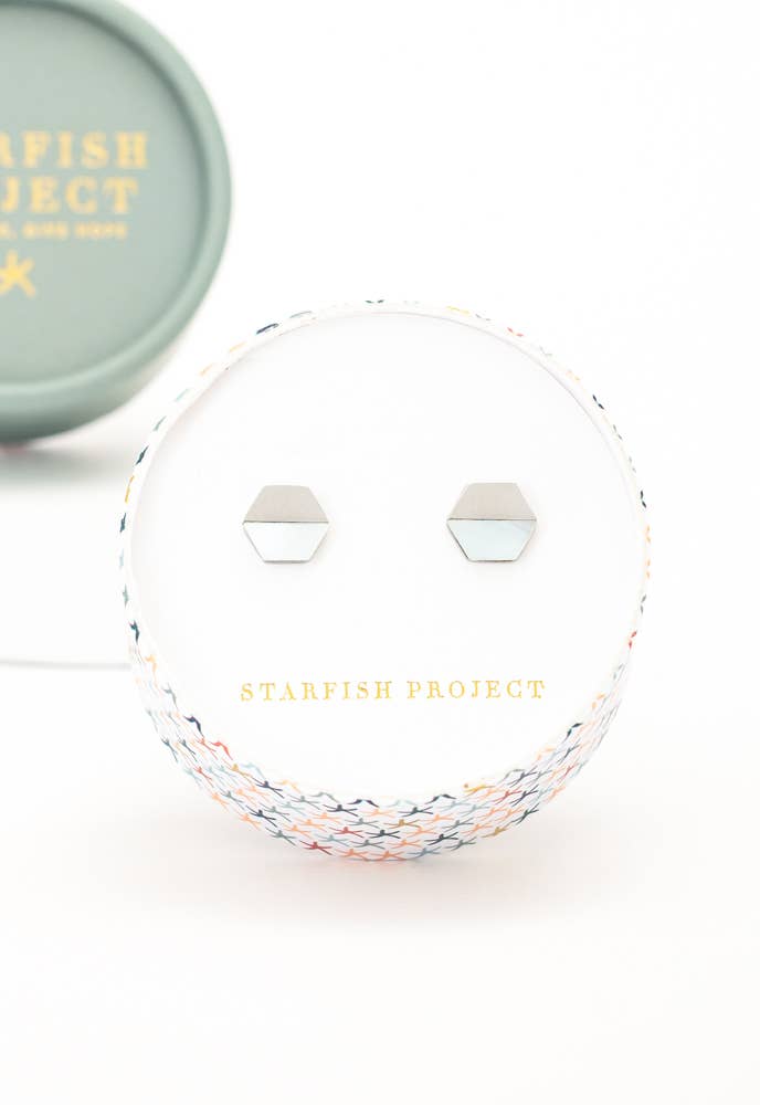 Our Dorothy Studs are minimal enough for everyday wear yet geometric enough to make a delicate statement. The combination of pure white mother-of-pearl and stainless steel speak of the refined beauty we see in the hearts of each woman and girl finding restoration through Starfish Project.