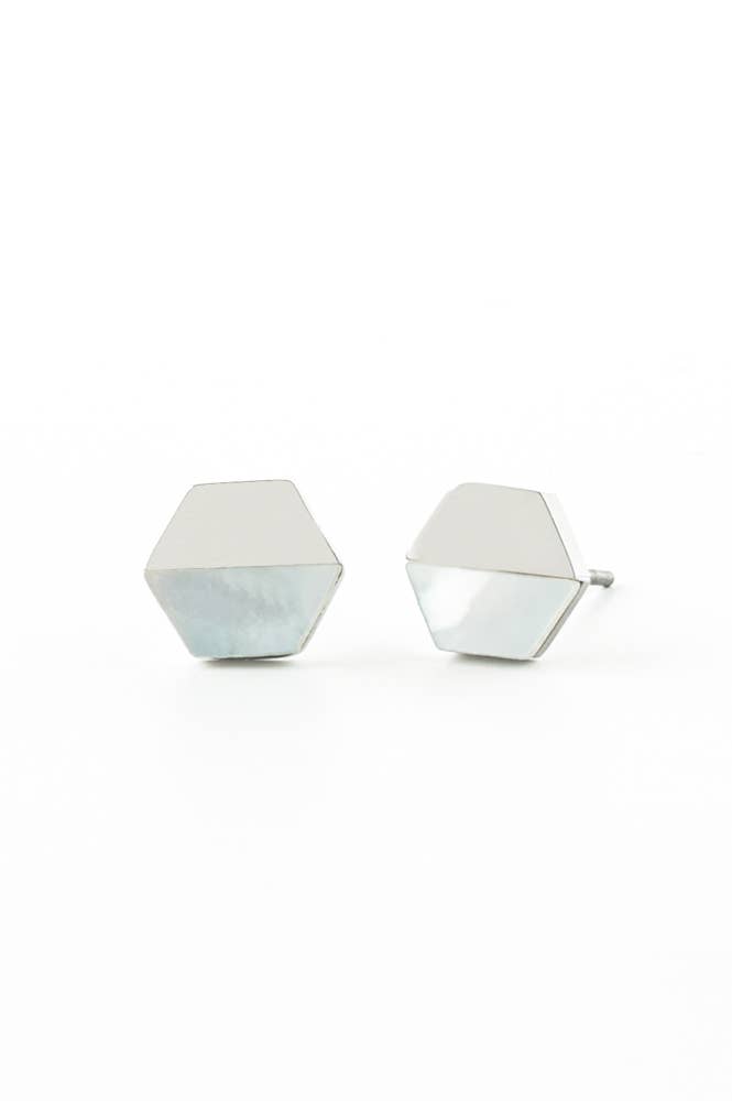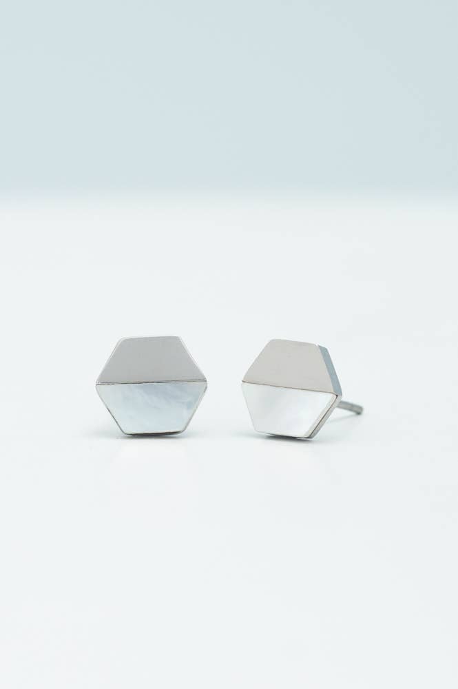Materials: Stainless steel and mother of pearl stud earrings with stainless steel earring posts.