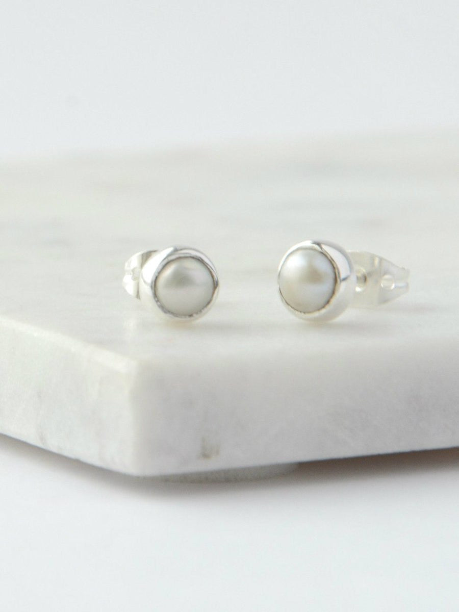 Made from silver-plated metal (nickel-free) and freshwater pearls. Handmade by women in India. Measures . 5cm.