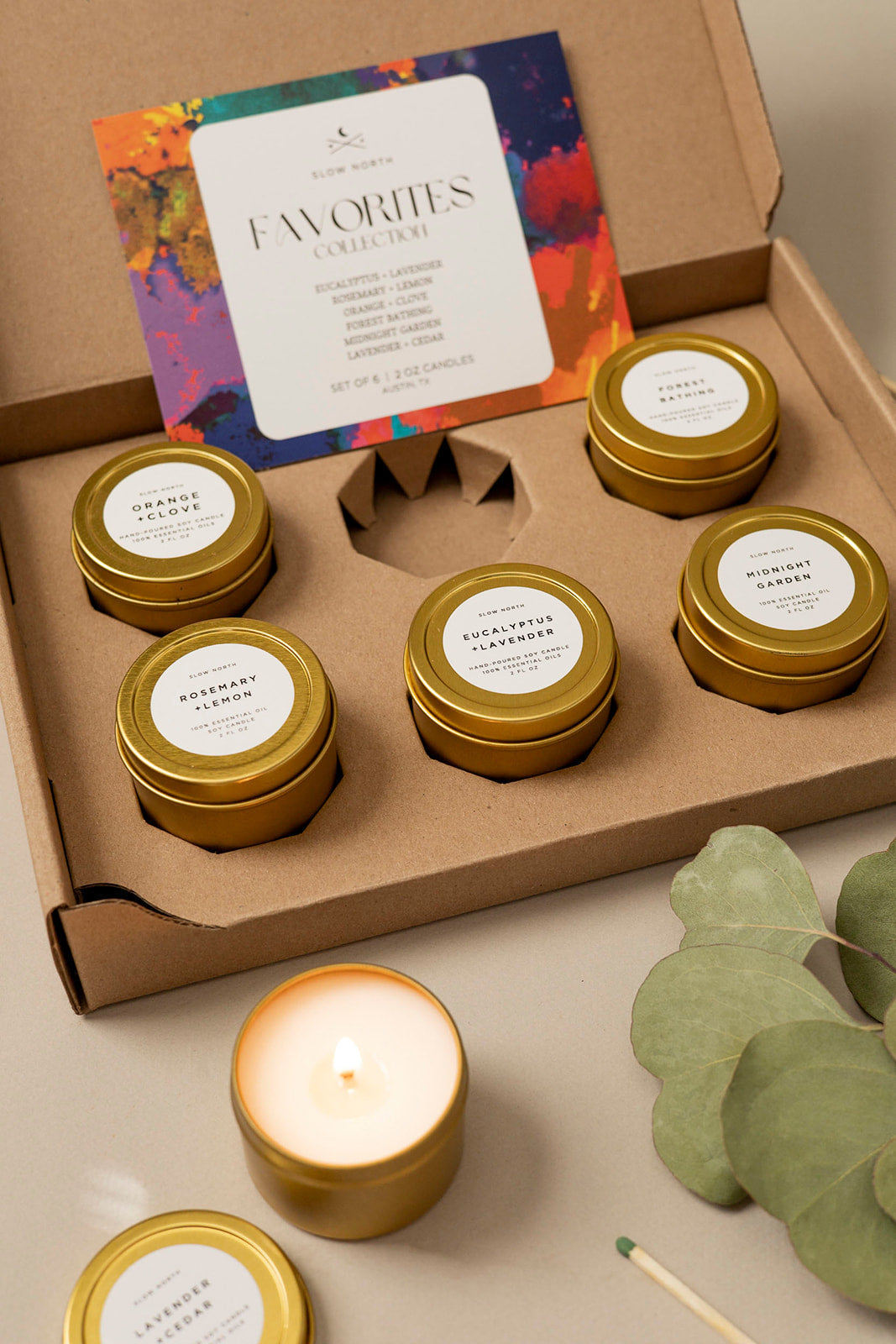 Experience the Favorites Collection, featuring Slow North's best-selling 100% soy wax and pure essential oil scents! This box contains six 2oz mini-candles, each a crowd favorite in its unique way. Our mini candles are perfect for trying out new scents or for taking with you on the go.