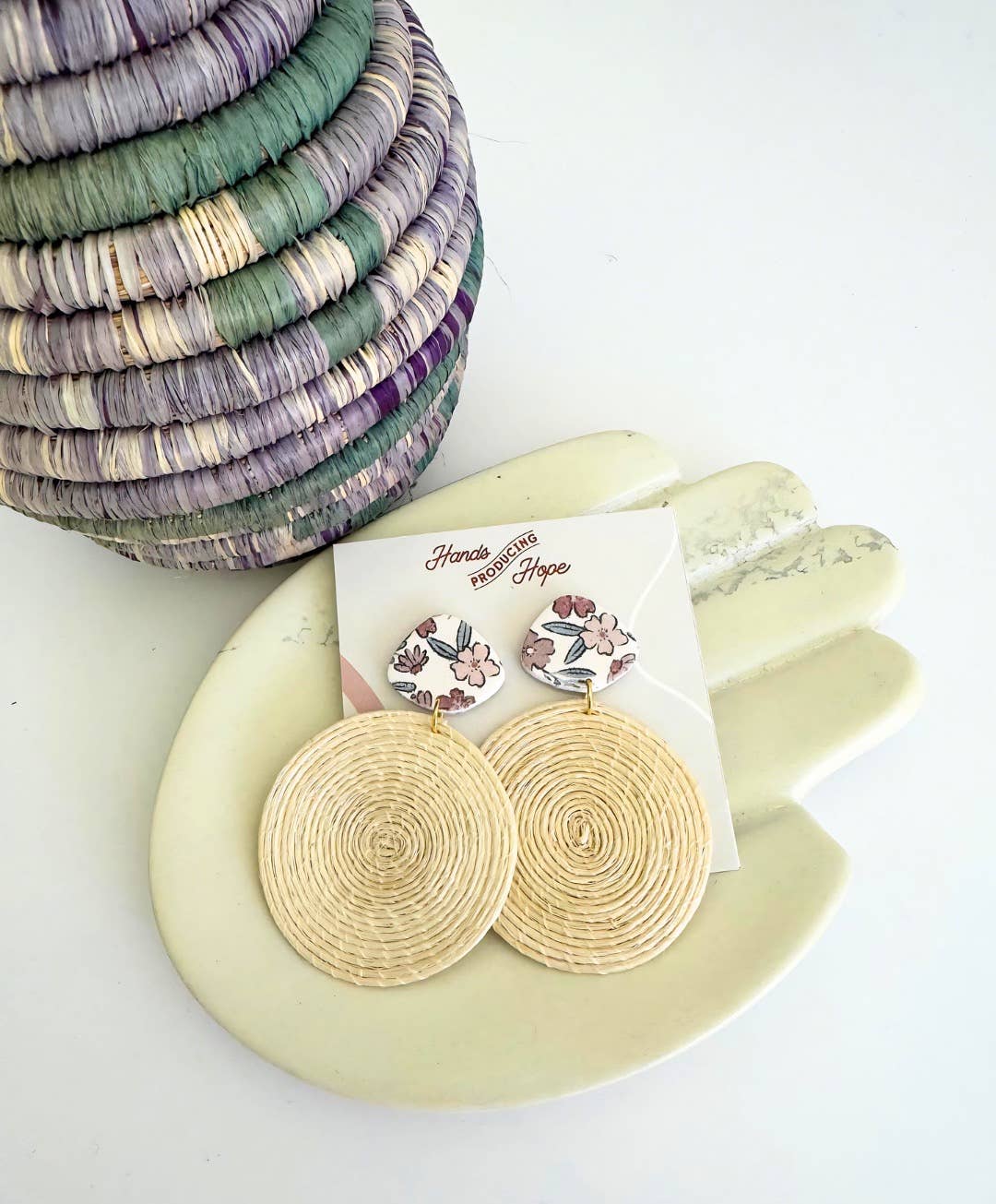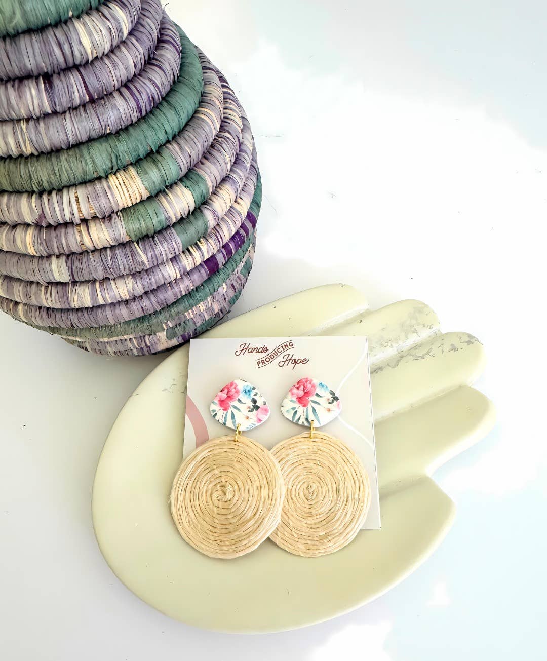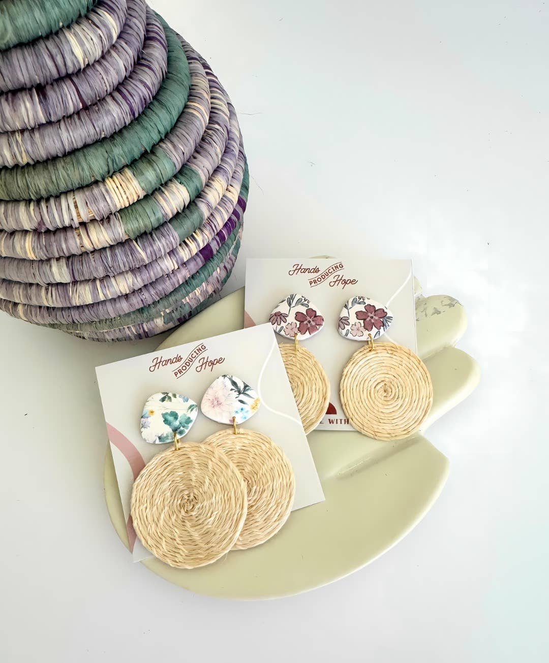 Handwoven by artisans in Rwanda, meets a floral patterned clay piece crafted by refugees in Baton Rouge. This unique blend of cultures creates the perfect accessory, while supporting communities with every wear.