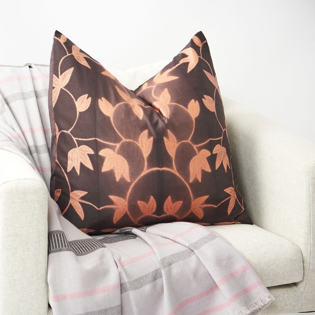 Folio Ebony pillow is luxurious and exquisite with its unique shibori print created by using natural leaves which are used to create stencils to create this handcrafted pattern.As this pillow is 100% handmade from start to finish, each piece is unique and will have a slight variation which is the beauty of the handmade process. In this pillow we have used high quality soft 60 gms silk that enhances this unique shibori pattern. Premium quality of natural dyes made in small batch by expert dyers is used by master shibori artisans in India. This also ensures longevity and makes our pillows sustainable and timeless for luxurious interior spaces. Folio Ebony pillow beautifully combines heritage value and high quality craftsmanship supporting artisanal clusters ethically. Size: 20 inches x 20 inches square pillow (Down filler included in the price) Material: 100% 60 gms silk. Color: Front is Shades of ebony brown with flowers in coral. Back of pillow is dyed solid ebony brown. Origin: Ethically crafted by master artisans in India Wash care: Hand wash with mild detergent and cold water only, hang dry, avoid direct sunlight. What Makes Your Purchase Sustainable ? 100% natural dyes sourced locally. Support ethical employment of women artisans and small artisan clusters. 100% handmade manufacturing process by artisans. Use only 100% natural + biodegradable responsibly sourced materials. Small batch production ensures higher quality & less wastage. Each product comes in a biodegradable recycled pouch.