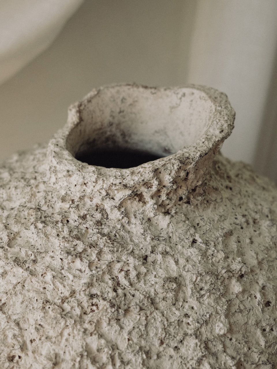 The Textured Gada Vessel from our Flora Collection brings you closer to nature with its raw, high-texture finish and organic, rounded form. Handcrafted by Indonesian artisans, this piece evokes the rugged beauty of the earth, making it feel as if it’s been shaped by natural elements over time. The rich, textured surface invites touch, enhancing its tactile quality and giving it an authentic, vintage-inspired appeal.