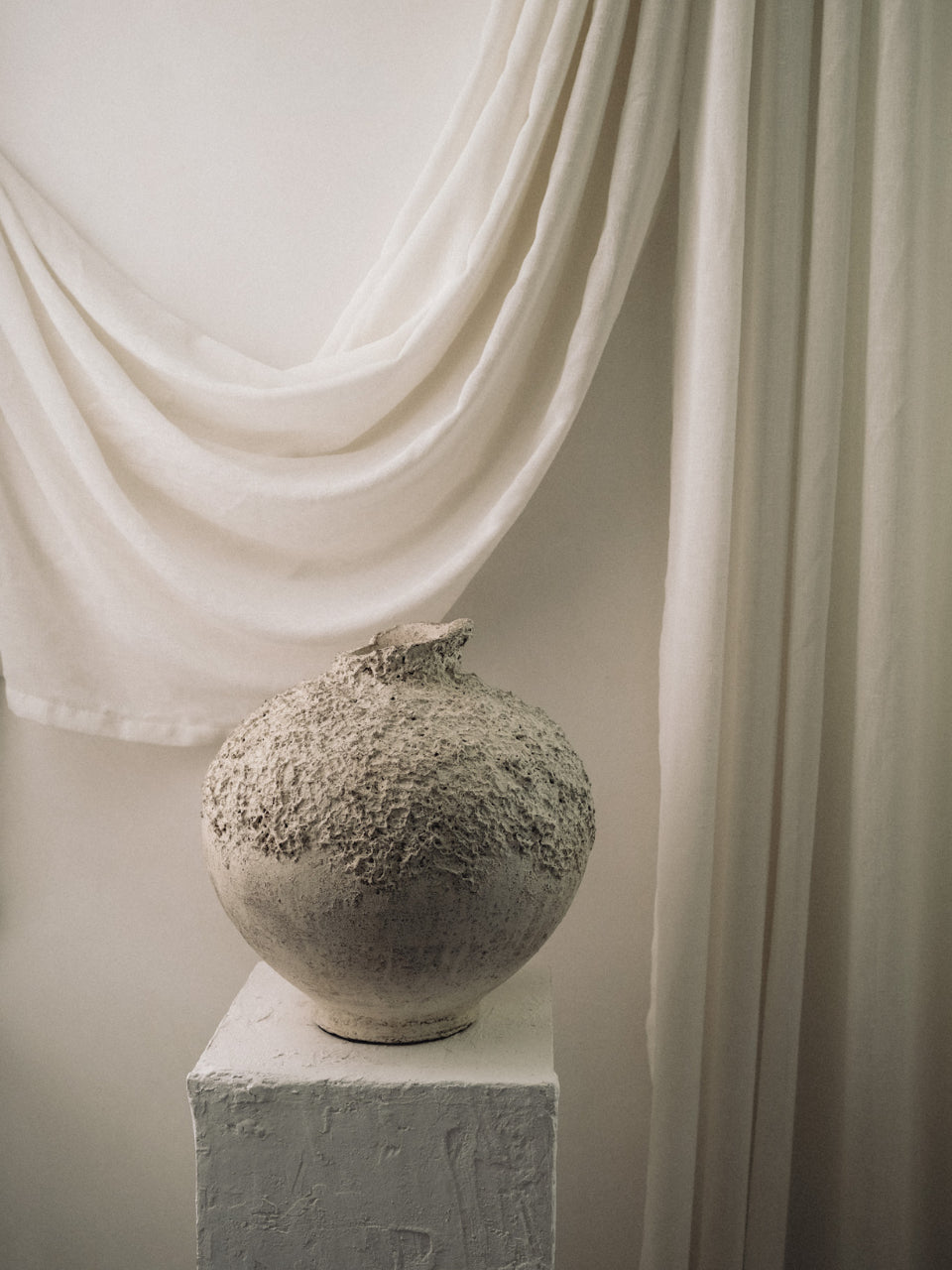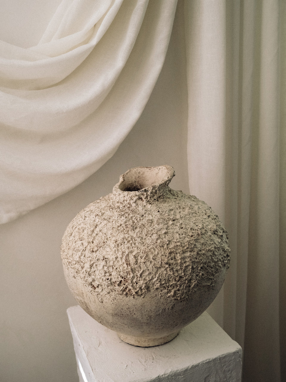 Perfect as a standalone art piece or for displaying dried botanicals, this globe-shaped vessel creates a grounded, earthy presence in any room. Its raw finish and timeless design make it a unique addition to any decor, offering a sense of history and connection to the natural world.