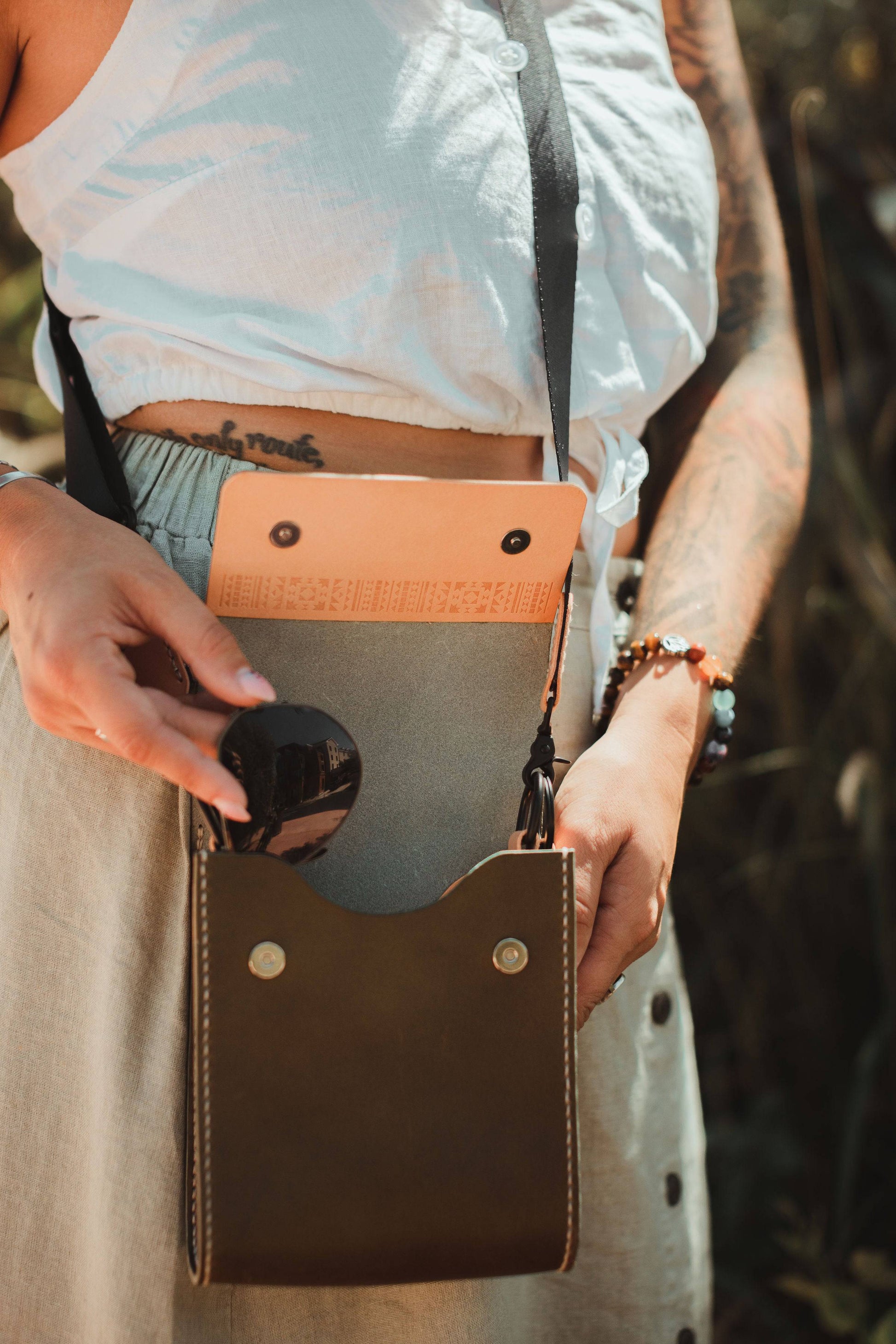 Italian for, Globetrotter, our Giramondo Full Grain Leather Crossbody Bag in Olive / Natural color is a dream come true for any traveler with its clean lines, thoughtful design, compact size, and stunning 2-toned leather combination accented with high-quality matte black hardware.