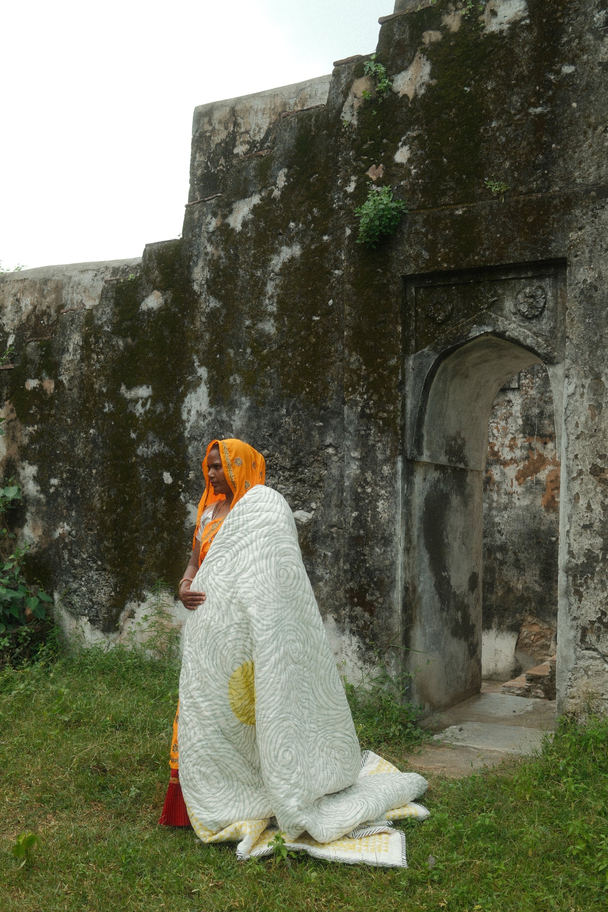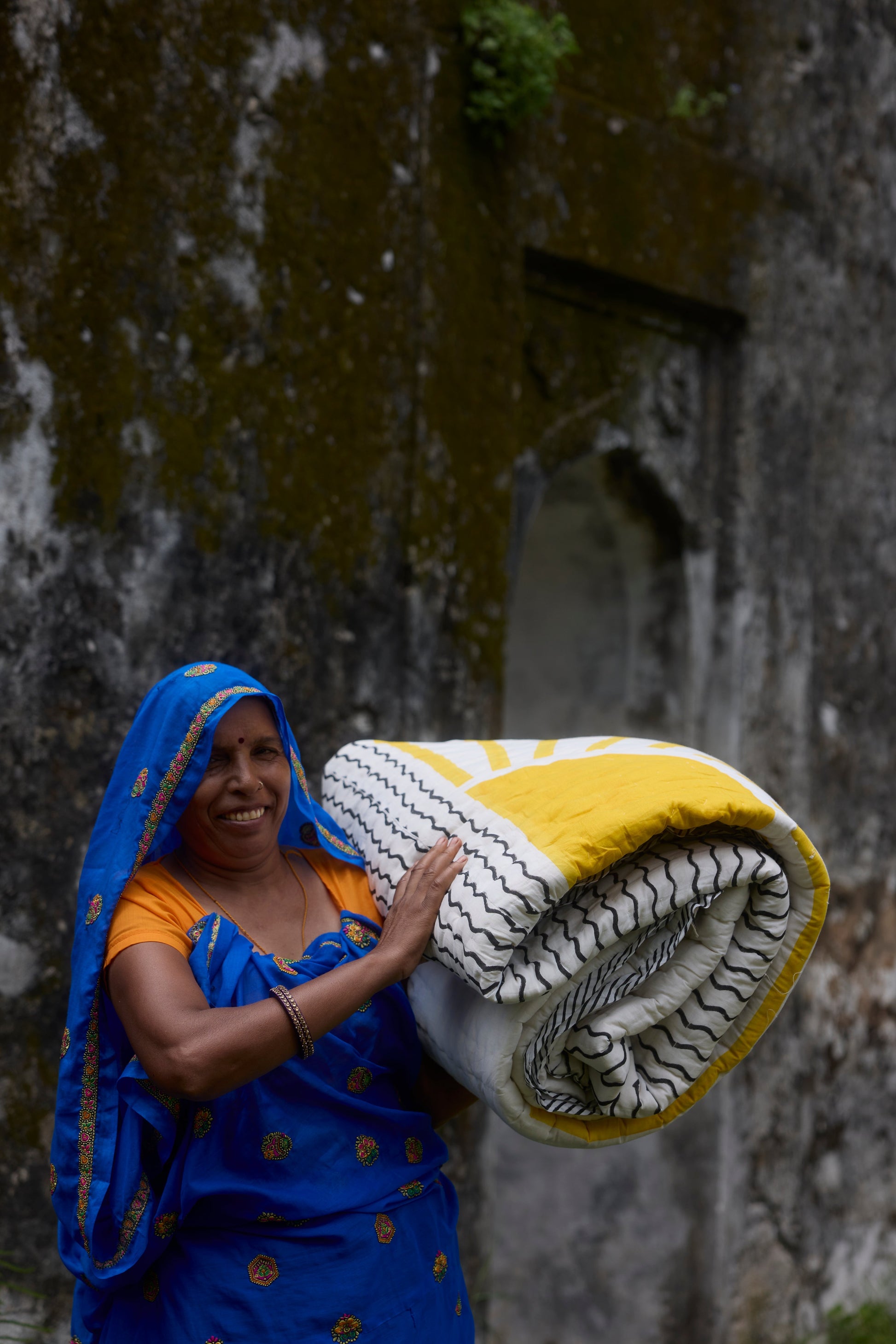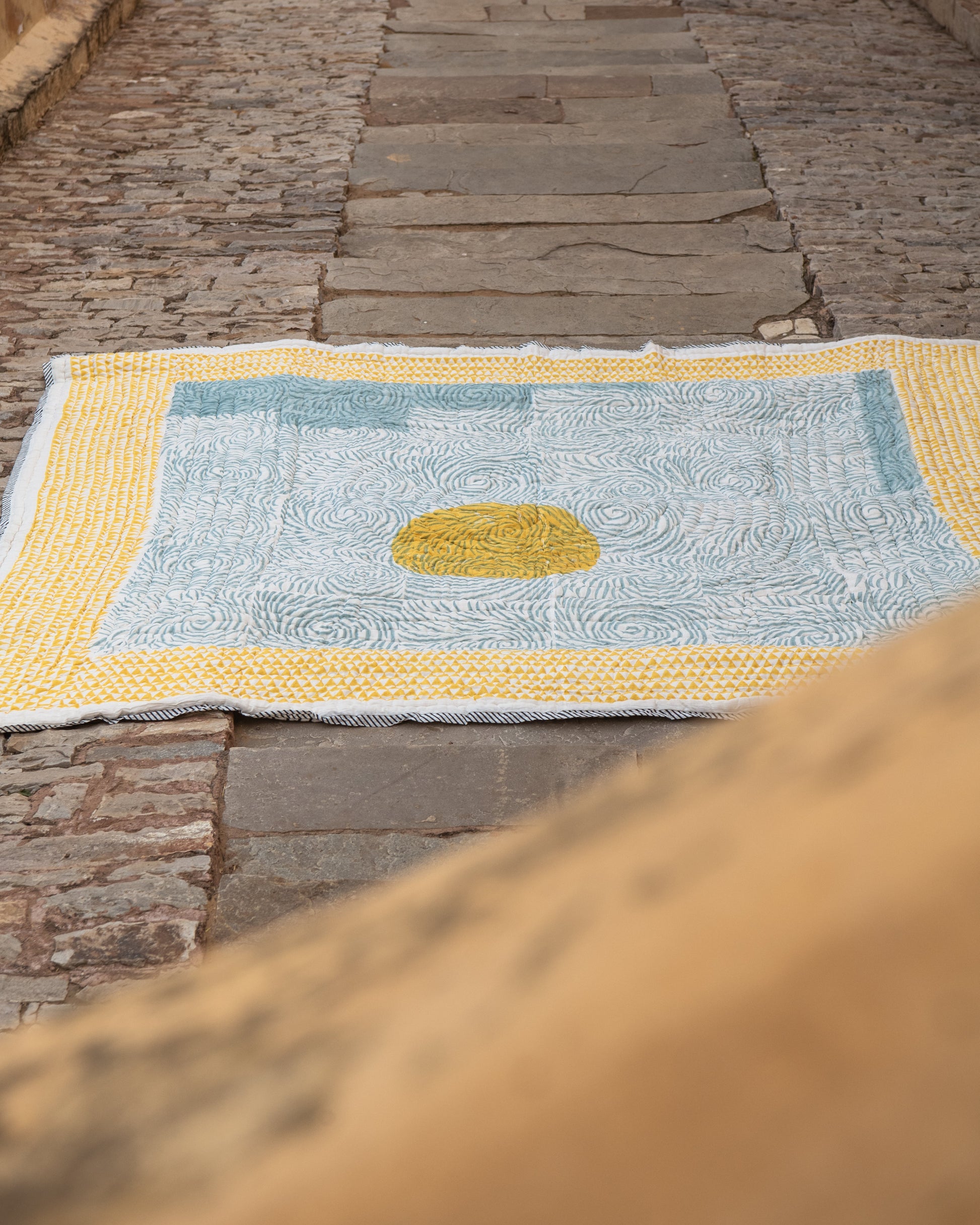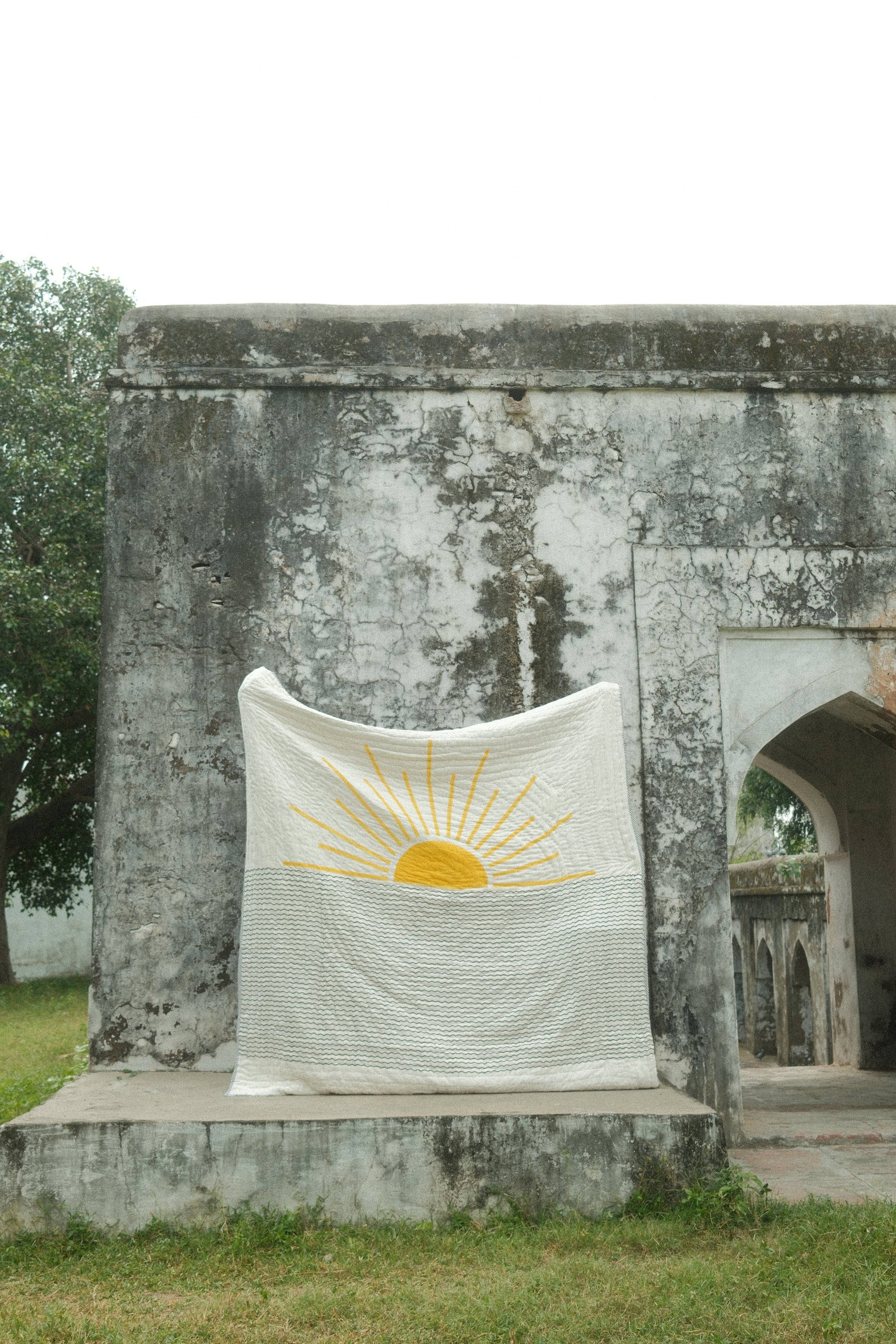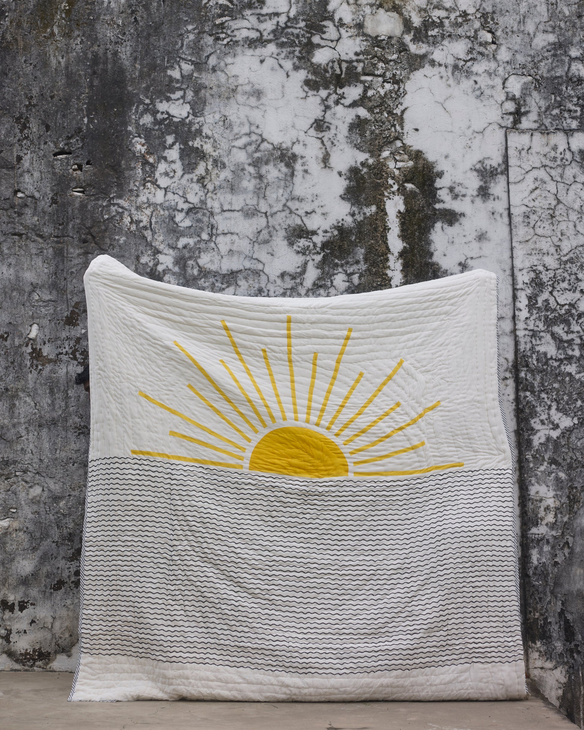 This reversible, hand-printed quilt offers two designs: a bright sun motif on one side and a Van Gogh-inspired starry night on the other. Switch between them for a quick room refresh. Whether it's morning or evening, you've got a design that fits. Each quilt is handmade from 100% cotton and requires attention from four artisans, including wood carvers, block printers, quiltmakers, and dye specialists. The design is hand-pressed onto each quilt using hand-carved wooden blocks dipped in dyes. The printed cotton shells are brought to the homes of quiltmakers, who stuff and stitch the quilts by hand, creating the final product. Our quilts are made in small batches. Due to the handcrafted nature of this item, expect slight variations in the appearance of each unique piece. - 100% cotton voile exterior - 100% cotton stuffing - Made in India - Ships from California - Twin size: 68″ x 86″ - Queen size: 96″ x 96″ - King size: 108″ x 108″ - Sham size: 26″ x 26″