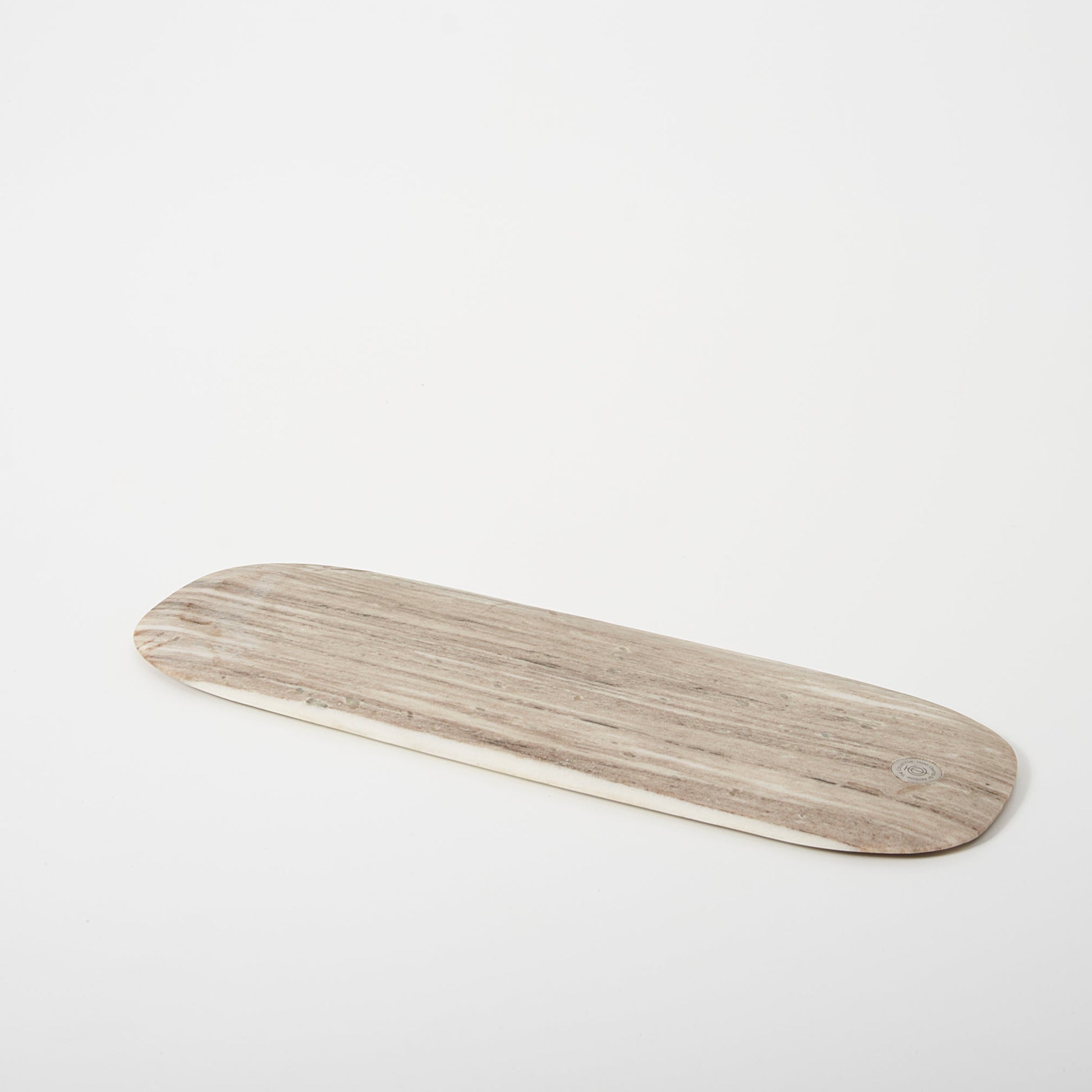 Skilled artisans carve beautiful greyish marble into these rounded, long boards, giving them wide beveled edges and smooth tops. Variations in the natural material ensure each board is unique in coloration and veining. These substantial serving slabs feature our logo medallion for a polished overall look. The medium Long Board provides a striking way to present artisanal breads, cheeses or charcuterie.