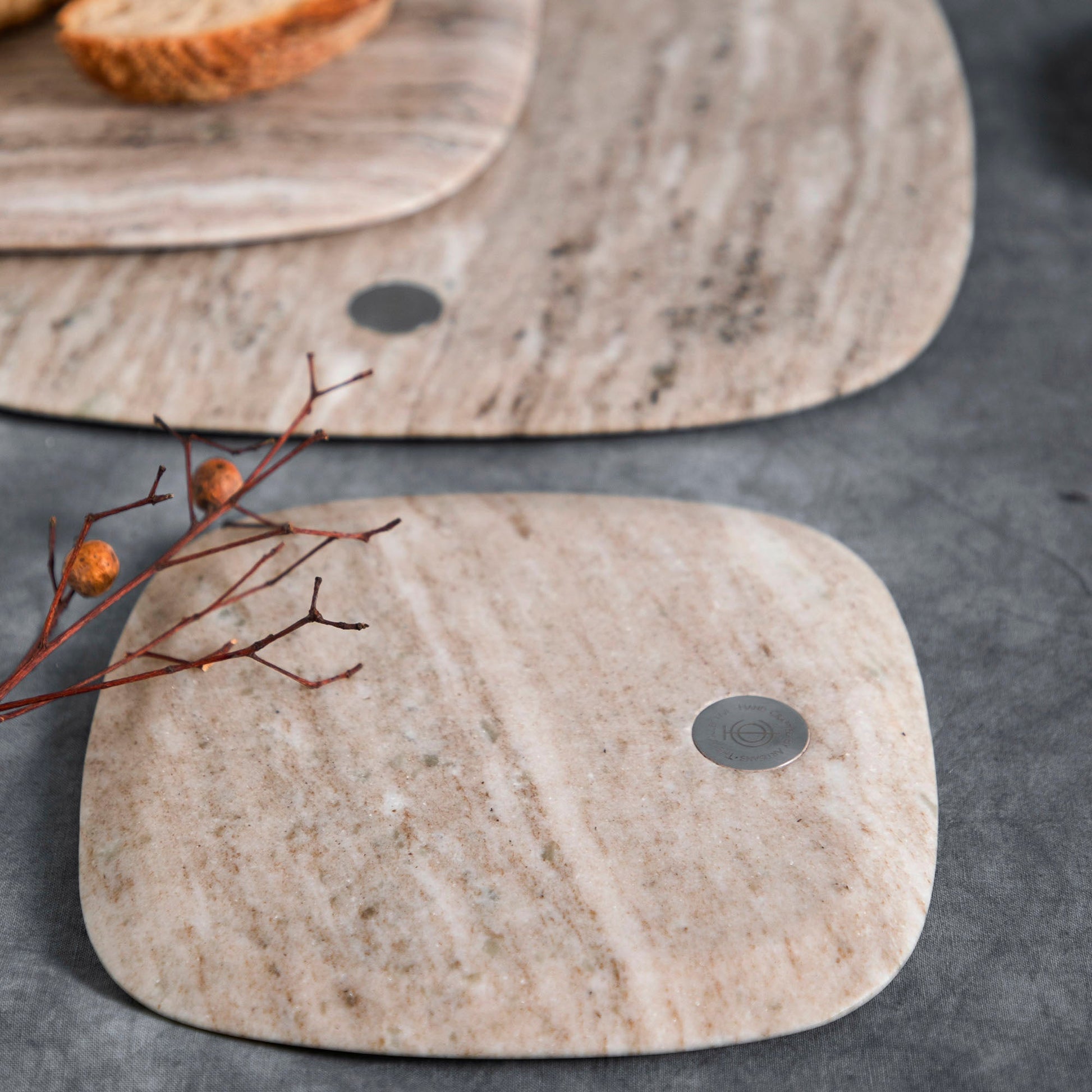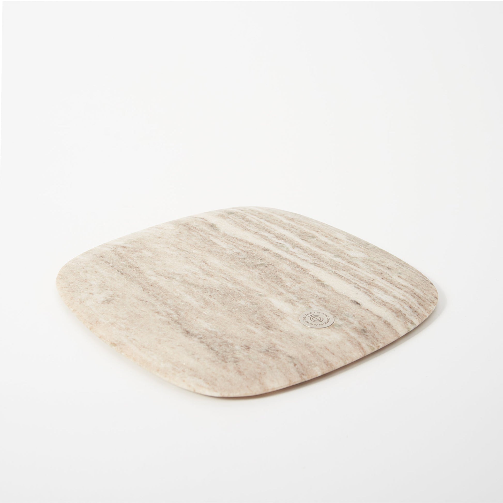 Skilled artisans craft each marble board by hand, shaping it with beveled edges and a smooth top and adding our logo medallion as a finishing touch. The natural material displays thin bands of gray and white within, guaranteeing no two boards look exactly alike. This softly rounded serving piece is roomy enough to fit a cheese assortment and rows of artisanal crackers along with serving utensils.
