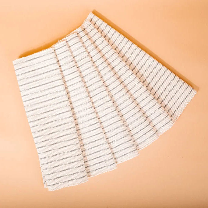 Our Rangi placemats draw on the natural colors we see in the savannah in Kenya. All of our placemats are hand made from 100% cotton which is sourced in from Uganda. The placemats are hand spun on traditional looms, helping create as low of a carbon footprint as possible in their production.