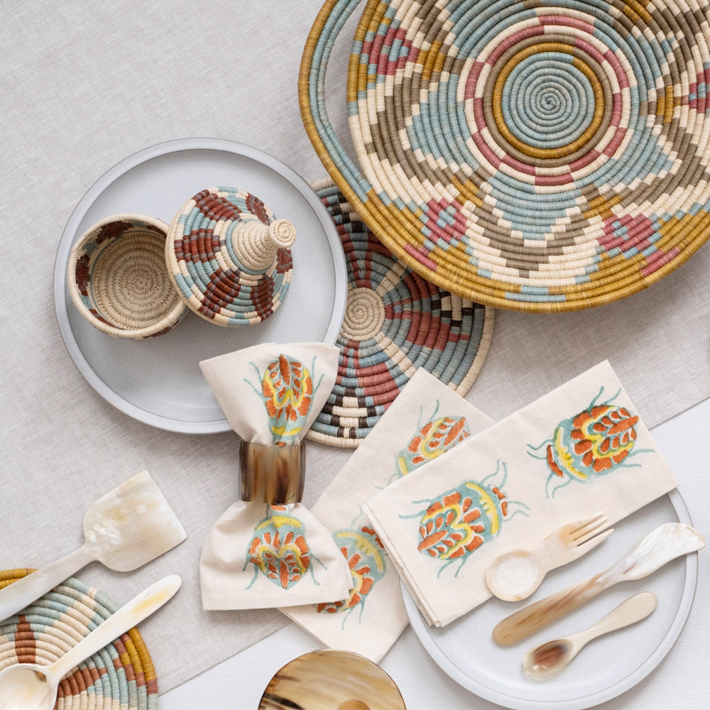 Add a new level of intention to your thoughtfully designed tablescape with these lovely and artfully crafted napkins. Cotton fabric is hand block printed with intricate designs and finished into these colorful table textiles. Brighten the future of both people and the planet by using washable and reusable napkins that are handmade by a team women who have received training through the African Block Project.