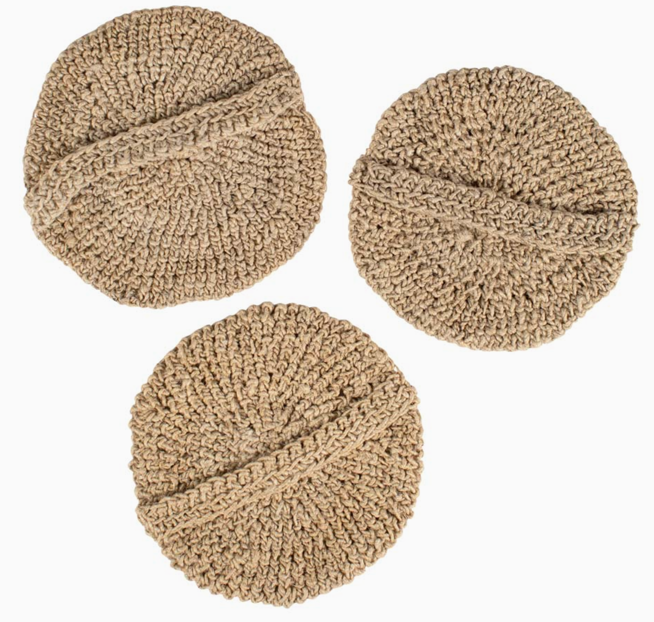 The Hemp Kitchen Scrubber is a must‒have for your eco‒friendly kitchen! This set of three hemp scrubbers is handcrafted by artisans in Bangladesh. In addition to steady, fair wages and safe workplaces, our fair trade partner Prokritee provides training in new techniques to help women expand their skills. Crocheted hemp.