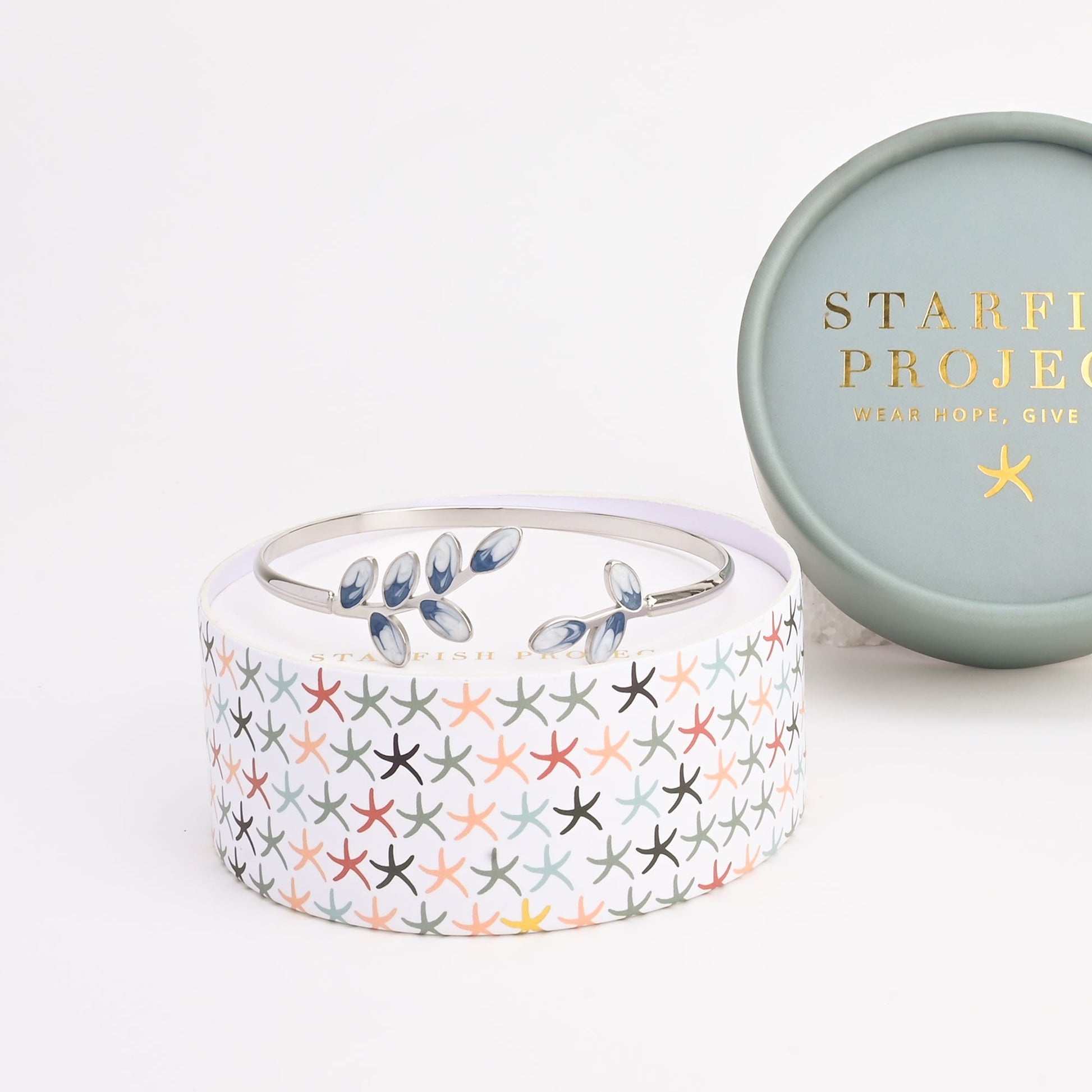 The Hope Grows Cuff tells a story of connection, strength, and resilience. Accented with soft blue enamel, two leaves meet at the center—symbolising growth, unity, and hope taking root. With its open cuff design, this piece offers a comfortable, adjustable fit and makes a meaningful gift or personal reminder of life’s continual unfolding. Every Hope Grows Cuff supports survivors on their journey toward freedom and brighter futures, making each wear a reflection of beauty with purpose.