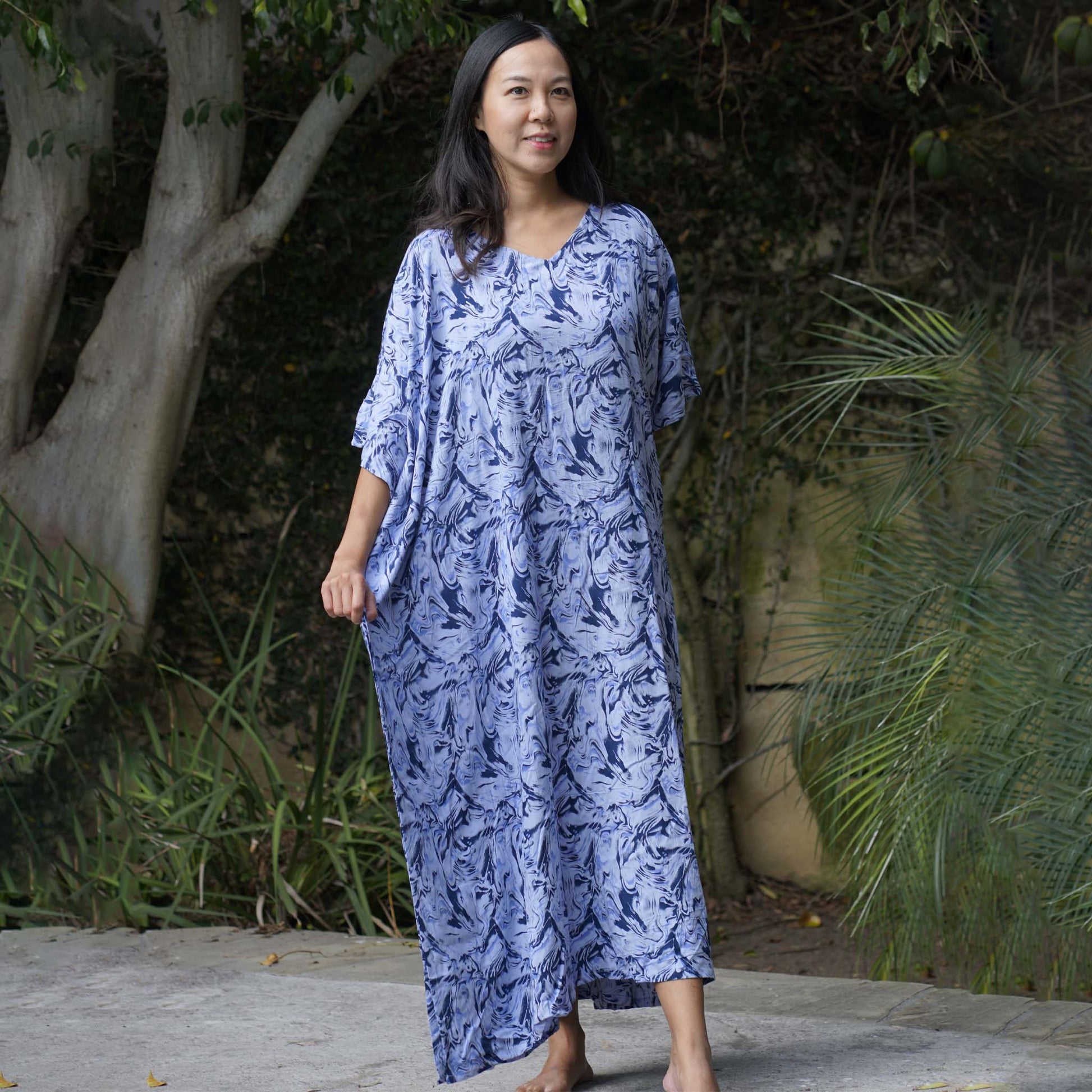 This hand-sewn fun and lightweight rayon dress is made by our artisans in Indonesia. Hand-sewn dress made by skilled artisans in Java, Indonesia There is a belt that can be removed and attached Lightweight and breathable material makes it perfect for any season Size: One Size Easy to care for with machine washable instructions on delicate setting in dryer. By purchasing this dress, you're supporting local artisans and their traditional craftmanship. Material: Rayon Ankle/ calf length dress. Model is 5'5