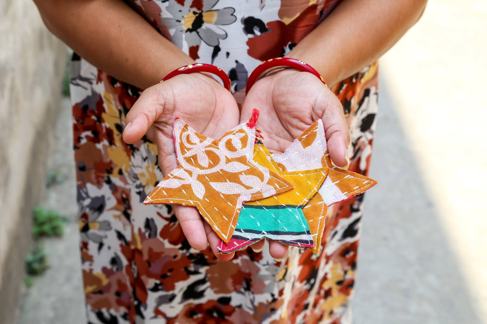 These kantha stitches Christmas Ornaments are the cutest little addition to our 2021 Chrismas product line Each one is colorful, hand stitched, one of a kind and of coarse comes with a tag signed by the beautiful women who made it!