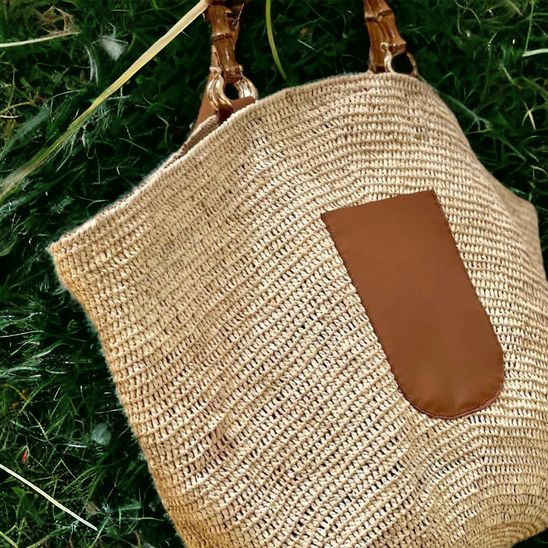 What sets this Raffia Tote apart are its handles - a marriage of nature and craftsmanship. The tote features sturdy bamboo handles and supple leather. carefully handpicked to ensure both durability and aesthetics. The bamboo, with its natural allure, adds a touch of organic elegance to the tote and the leather elevates the tote to a new level of sophistication.