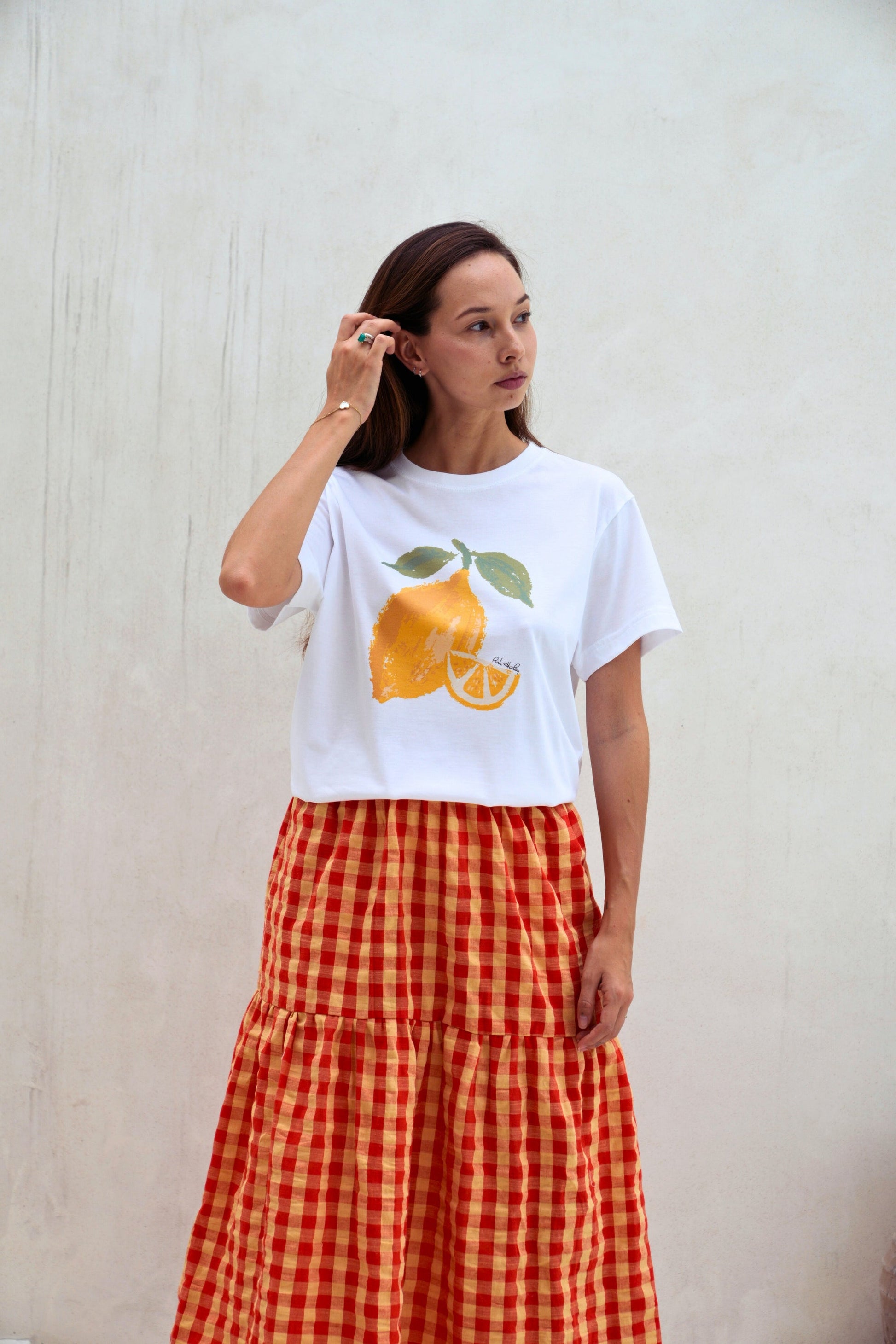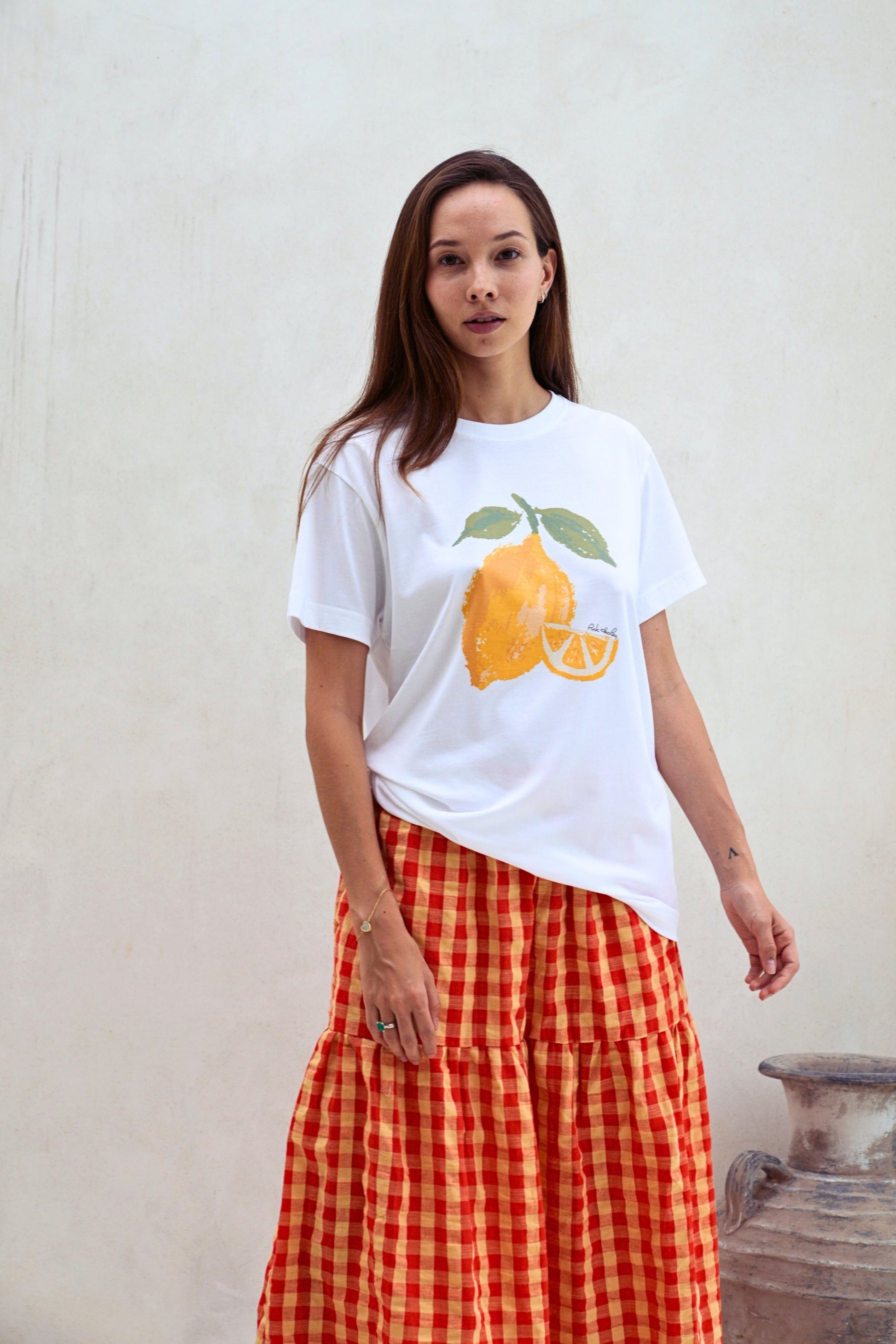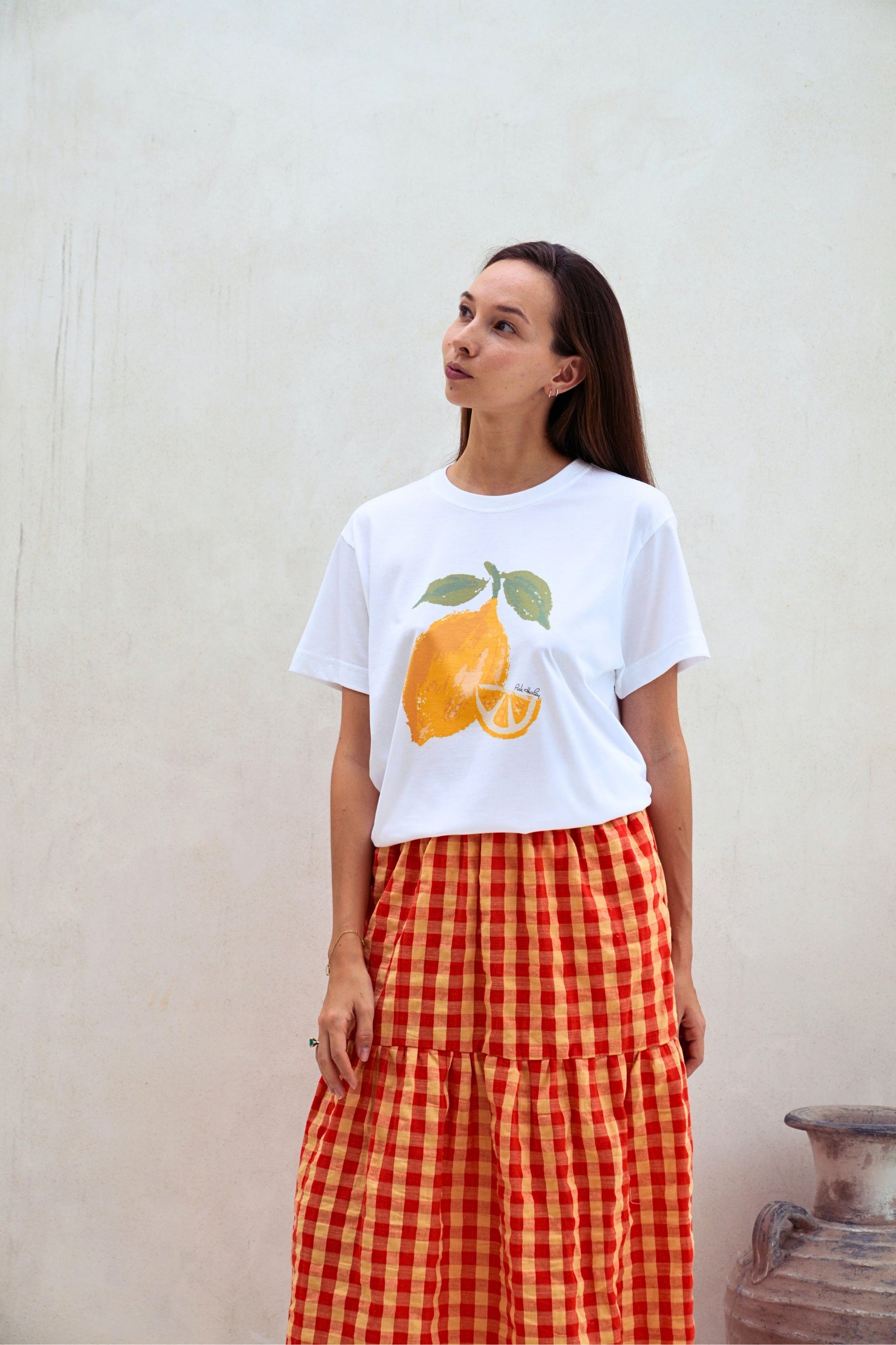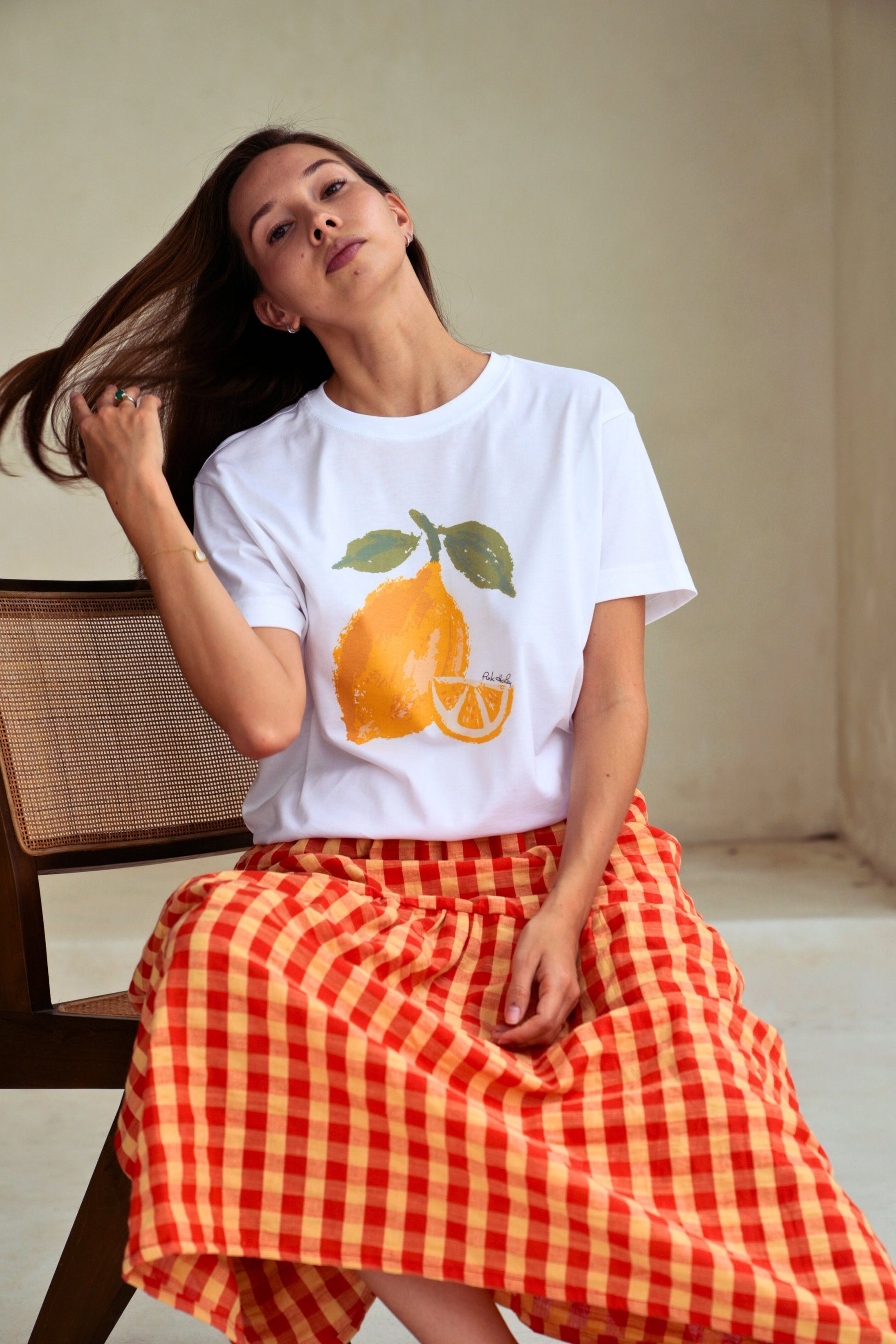 Leave the lemon at home and show off your lively, outspoken side in this lovely soft SUPIMA cotton and fruit illustration printed crewneck T-shirt. Exclusive fruit illustration printed on ultra soft SUPIMA cotton Tee. Our model is 5’7” Size S and is wearing S. Unisex oversized fitted Tee. Crewneck. Short sleeves. Pre-shrunk. 6 oz. 100% American Grown SUPIMA Cotton. Non-toxic water based ink printed graphic. Machine wash cold. Lay flat to dry. Handmade with love in Los Angeles. Shipping & Returns: Return accepted for store credit only. Please see our Shipping & Returns page for more details.