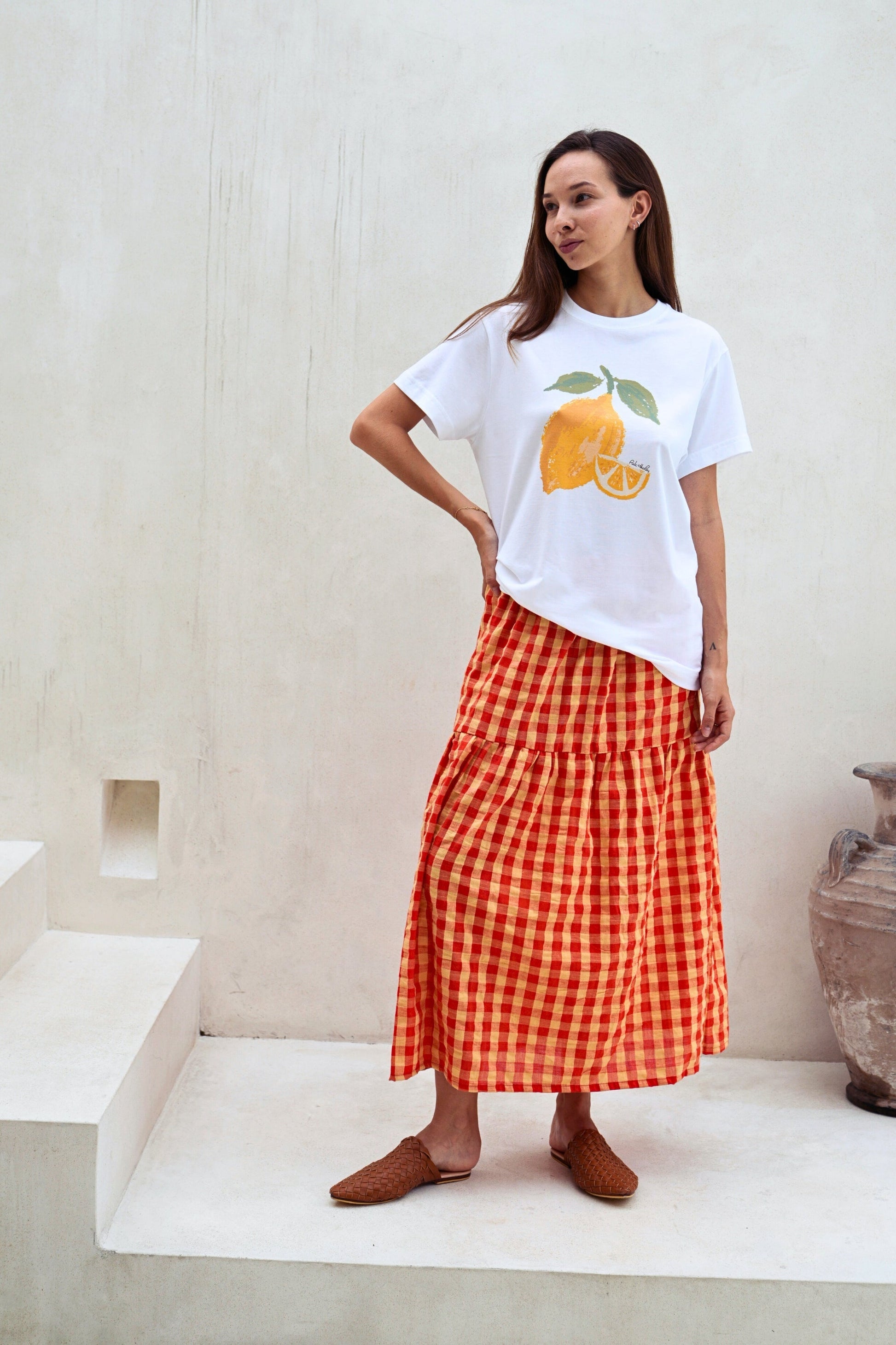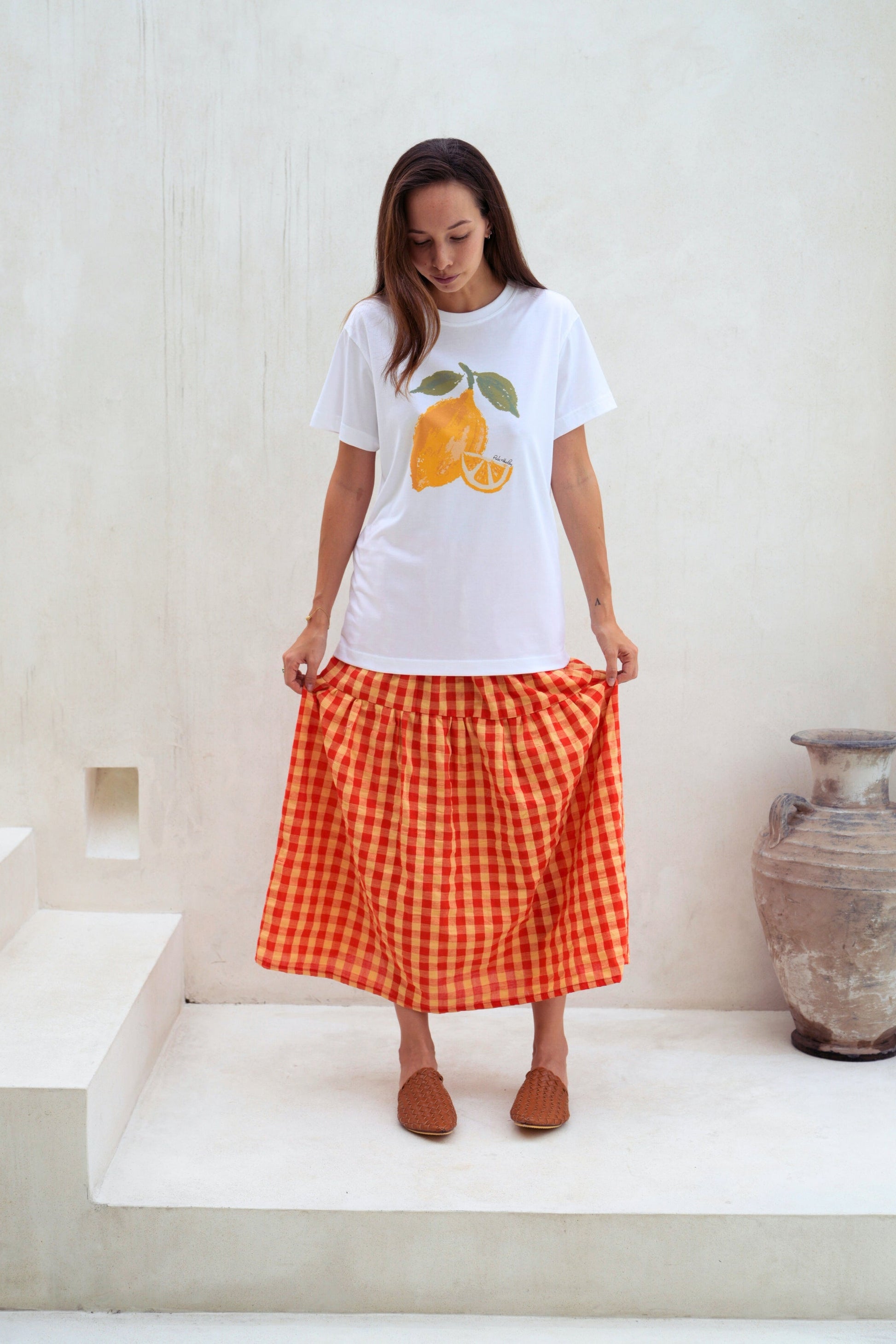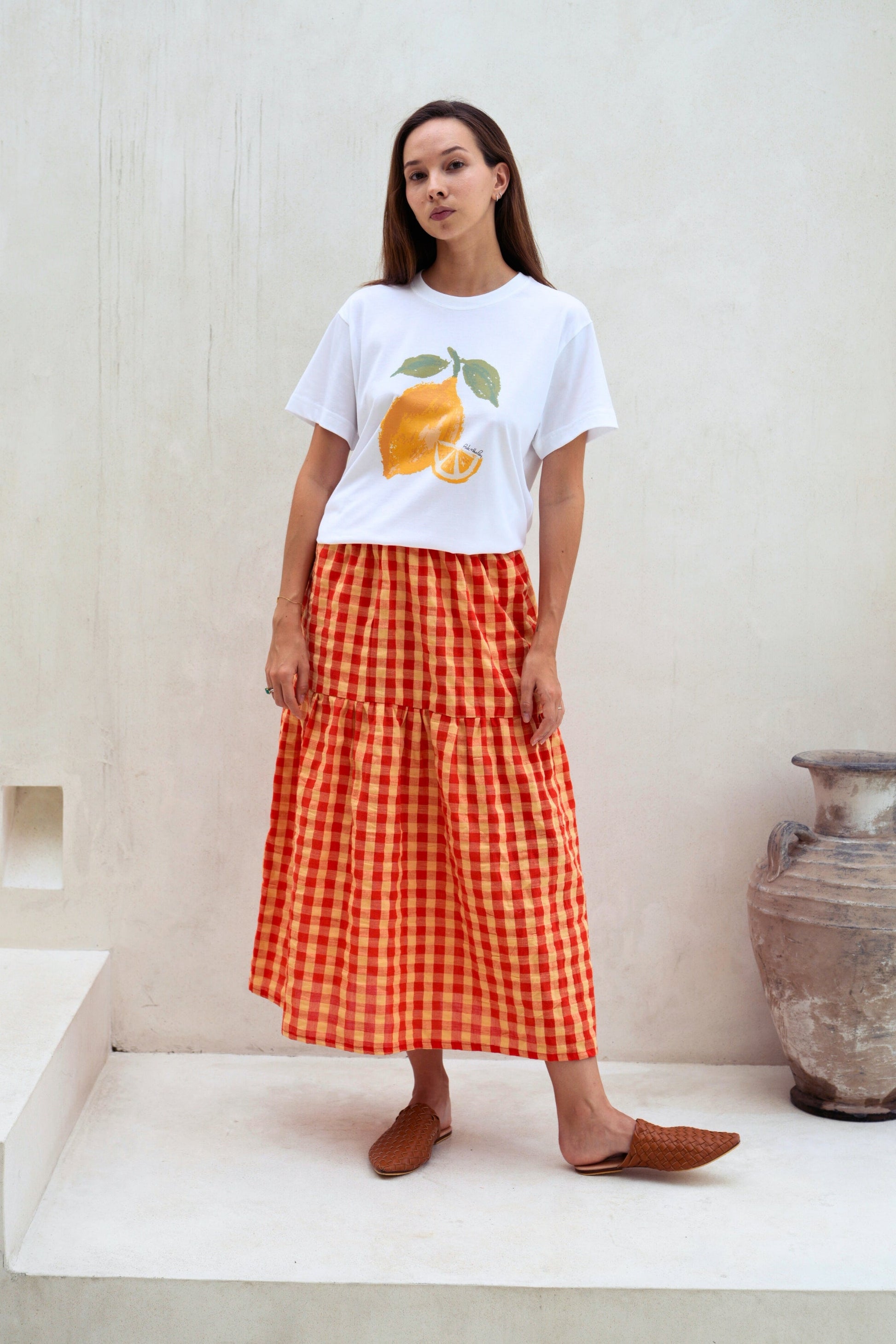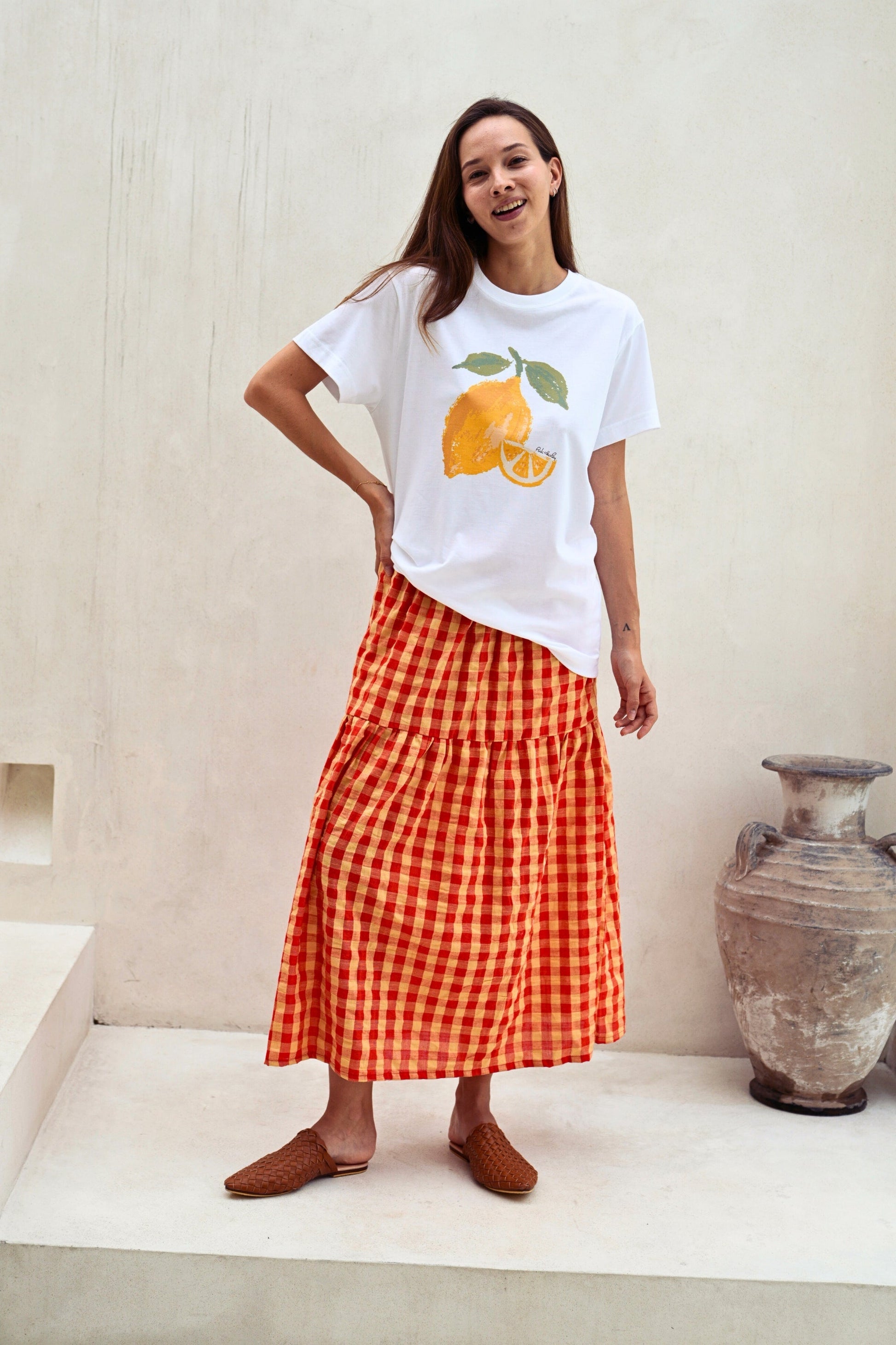 Leave the lemon at home and show off your lively, outspoken side in this lovely soft SUPIMA cotton and fruit illustration printed crewneck T-shirt. Exclusive fruit illustration printed on ultra soft SUPIMA cotton Tee. Our model is 5’7” Size S and is wearing S. Unisex oversized fitted Tee. Crewneck. Short sleeves. Pre-shrunk. 6 oz. 100% American Grown SUPIMA Cotton. Non-toxic water based ink printed graphic. Machine wash cold. Lay flat to dry. Handmade with love in Los Angeles. Shipping & Returns: Return accepted for store credit only. Please see our Shipping & Returns page for more details.