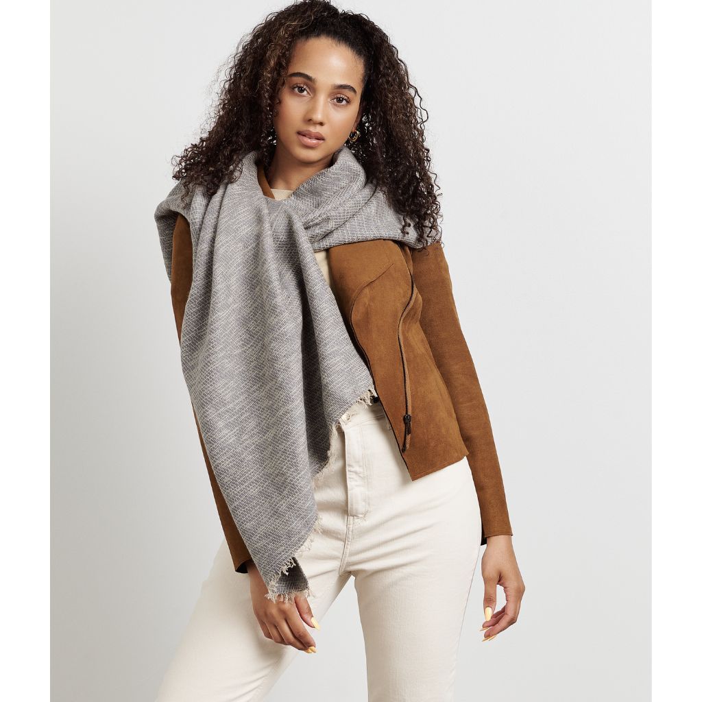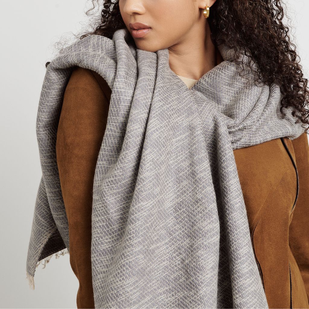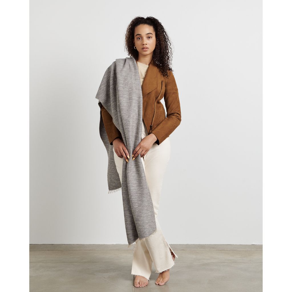 Combining simplicity & elegance with artistic luxury, Limestone Scarf is completely handmade from start to finish making each piece unique. A timeless classic scarf that will complement your outfits and also supports artisan communities ethically. This scarf is a perfect gift or personal wear accessory for work wear, evening wear for indoors, outdoors or travel. So soft in hand feel , you can feel the purity of cashmere & merino in this unique weave all created on handloom. Short fringes give a beautiful raw appeal to make this artisan piece a modern minimal statement piece. Material: 23 % Cashmere 54% Merino 23% Cotton Blend Size: 70 X 200 cm Color: Shades of limestone gray and cream. Artisan Base: Ethically hand woven and hand dyed by artisans in Nepal Wash Care: Gently hand wash with cold water & mild detergents , hang dry or delicately dry clean only. What Makes Your Purchase Sustainable ? Certified Eco Swiss Dyes used. Support employment of women artisans. 100% handmade manufacturing process by artisans. Use only 100% natural + biodegradable responsibly sourced materials. Small batch production ensures higher quality & less wastage. Each product comes in a biodegradable recycled pouch.