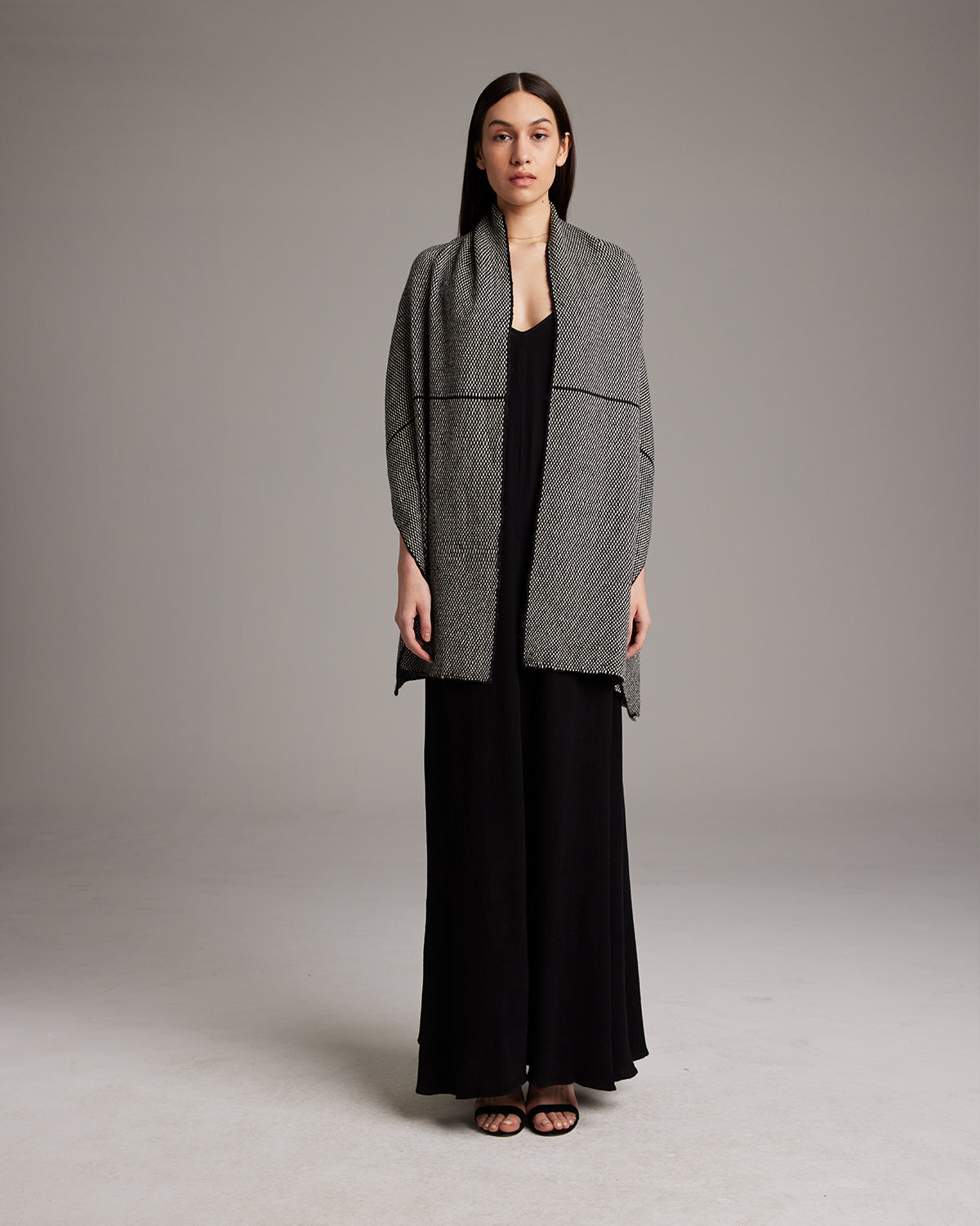 Versatile hand-woven shawl made from Baby Alpaca featuring all-over lineas design. The perfect layer of warmth and chic modernity. 100% alpaca hand-loomed in Chile by Mapuche weavers 200cm x 50cm Product Care: Spot clean with mild cleaning agent, dry clean as needed