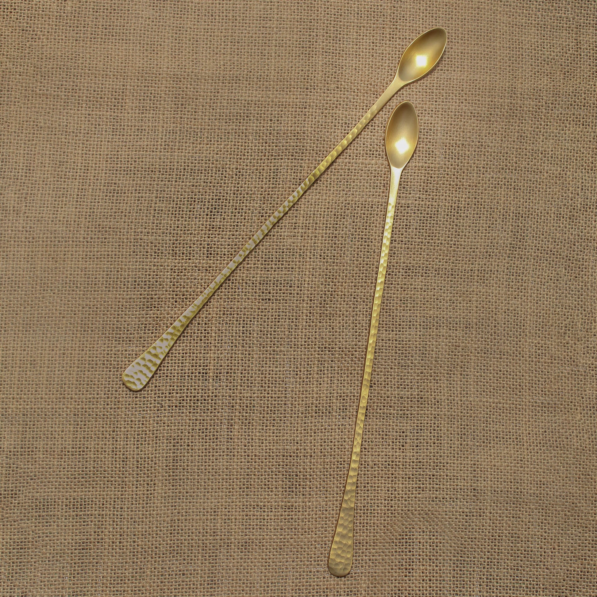 Long brass bar spoons bring modern flair to your bar with their elongated silhouettes, gently hammered texture and matte golden hue. Use them in your tallest glassware and pitchers to guarantee no ingredient gets left behind. Food-safe spoons sold as a set of two. Hand wash only.