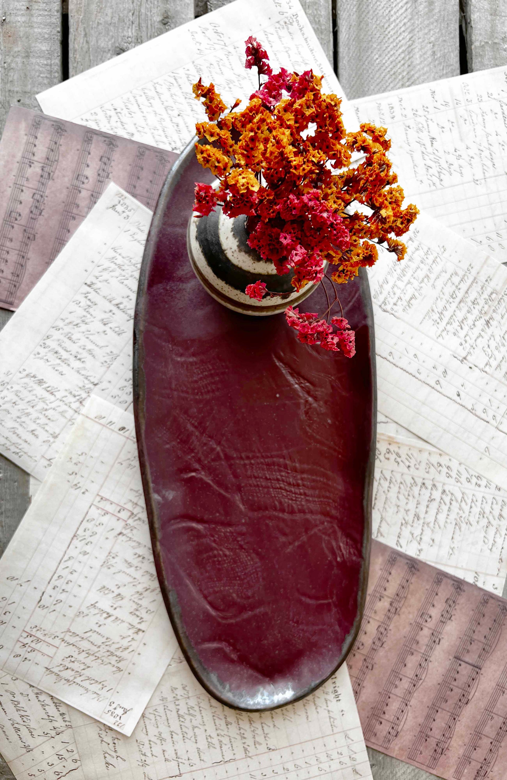 The Luna Collection is meticulously crafted from stoneware clay and adorned with a rich bronze accent at the lip. Each piece is carefully hand built and stamped before being glazed, resulting in a beautifully subtle woven texture. Approximate measurements: 16-17 inches in diameter x 1 inch tall x 6-7 inches wide. Microwave and dishwasher safe however hand washing prolongs the life of your handmade wares. *All of my products are made by hand and will vary. Each glaze firing varies as well. Please keep this and my refund policy in mind when you place your order. Thank you.