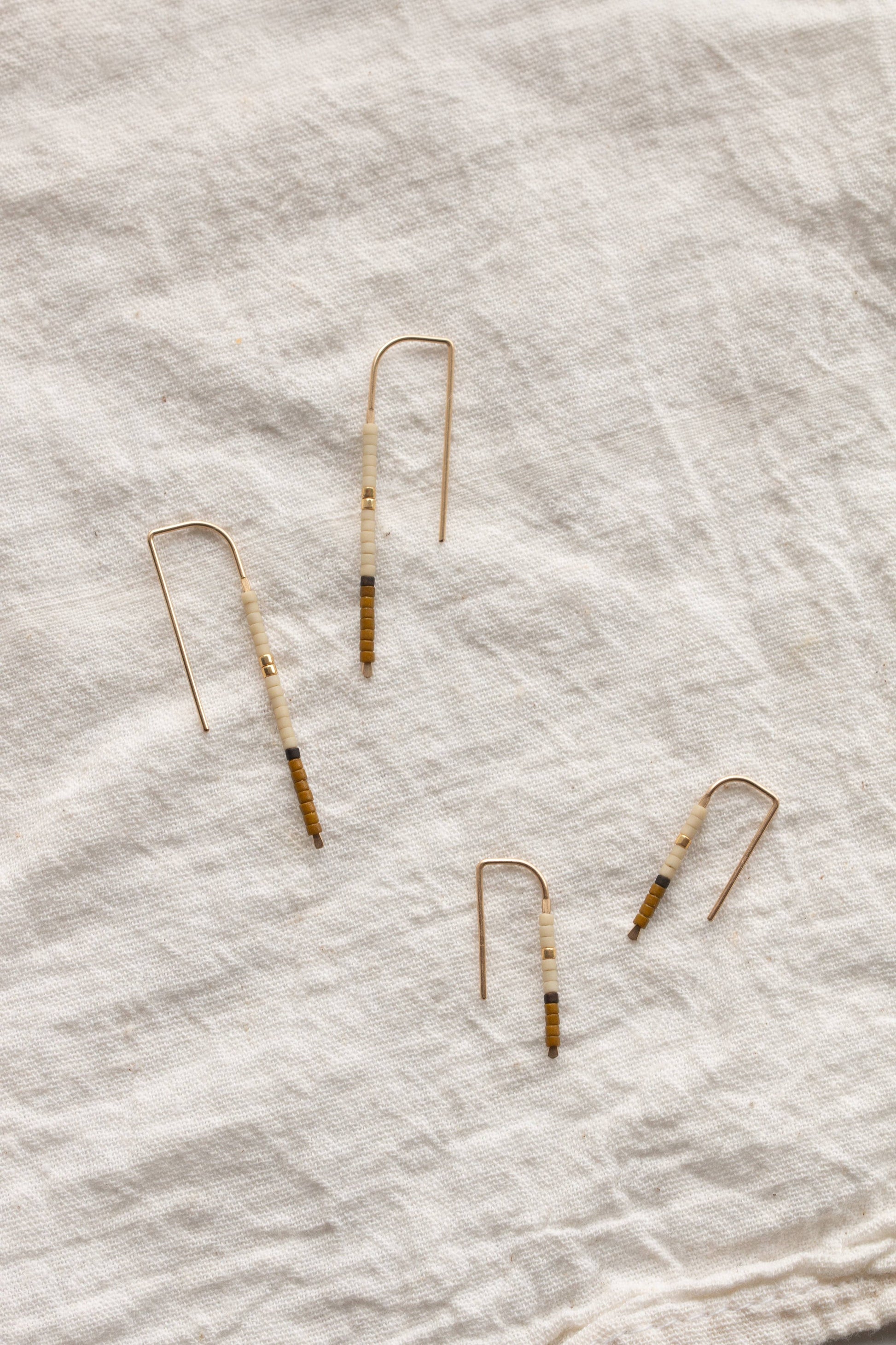 Inspired by a balanced palette of earthen hues accented with charcoal and gold details, the sweet Mala Ear Pins are made from 14k gold-fill wire & Japanese glass beads, perfect for the everyday minimalist.
