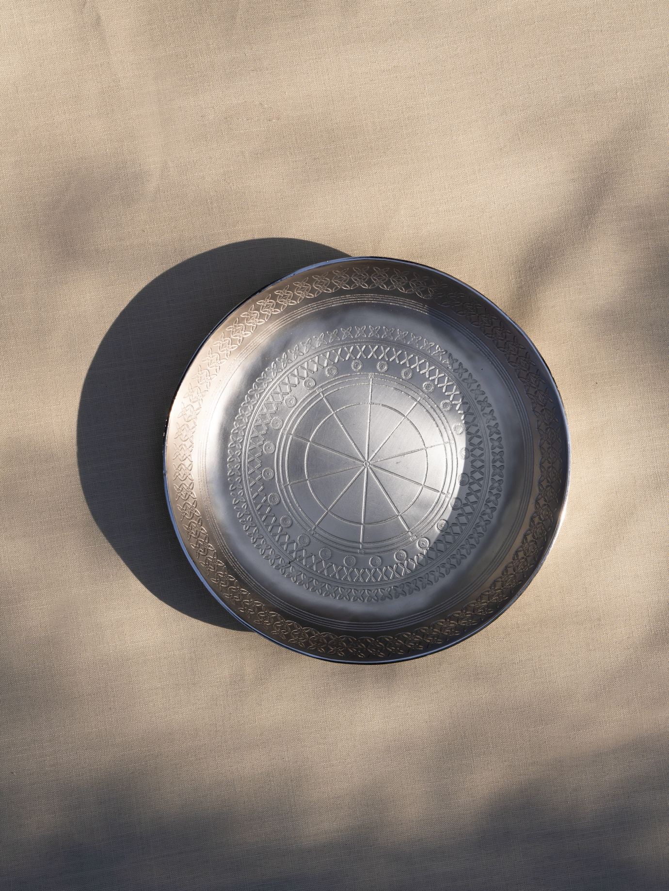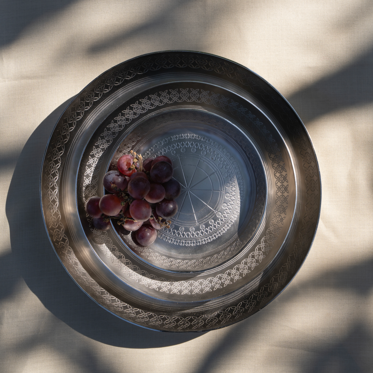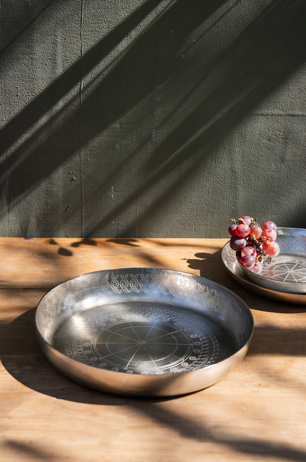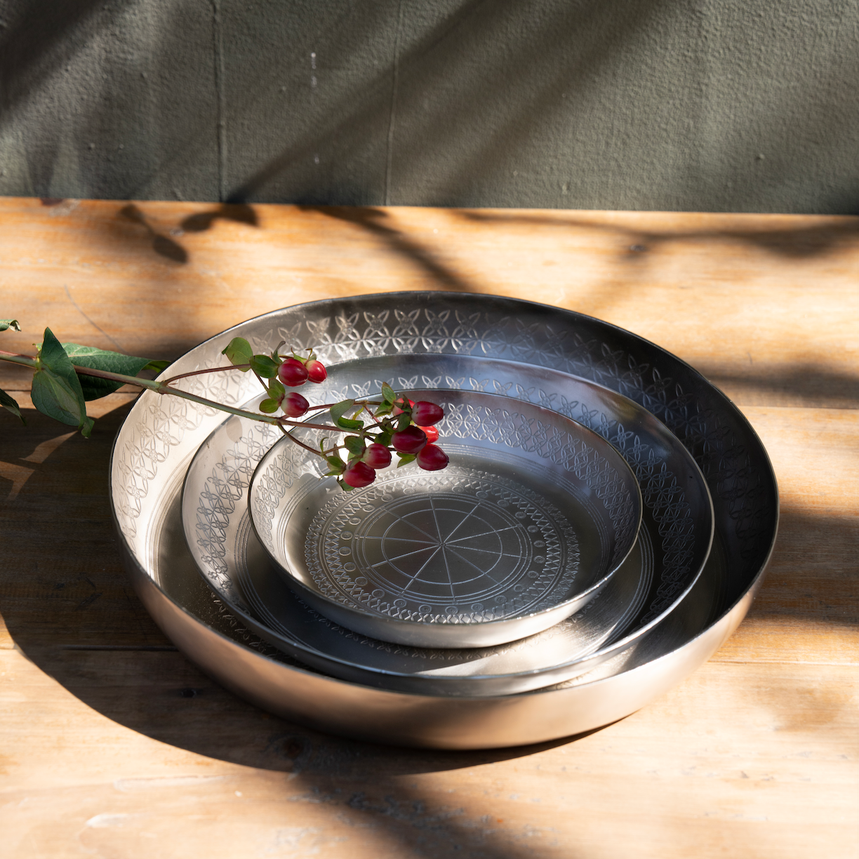 Experienced craftsmen begin with thin sheets of aluminum to create this set of unique nickel-plated serving trays. Each piece is then embellished with intricate patterns etched by hand into its satin finish, creating a focal point. Serving sets are sized in a range for everyday use to hold fruit, deliver drinks, or present snacks.