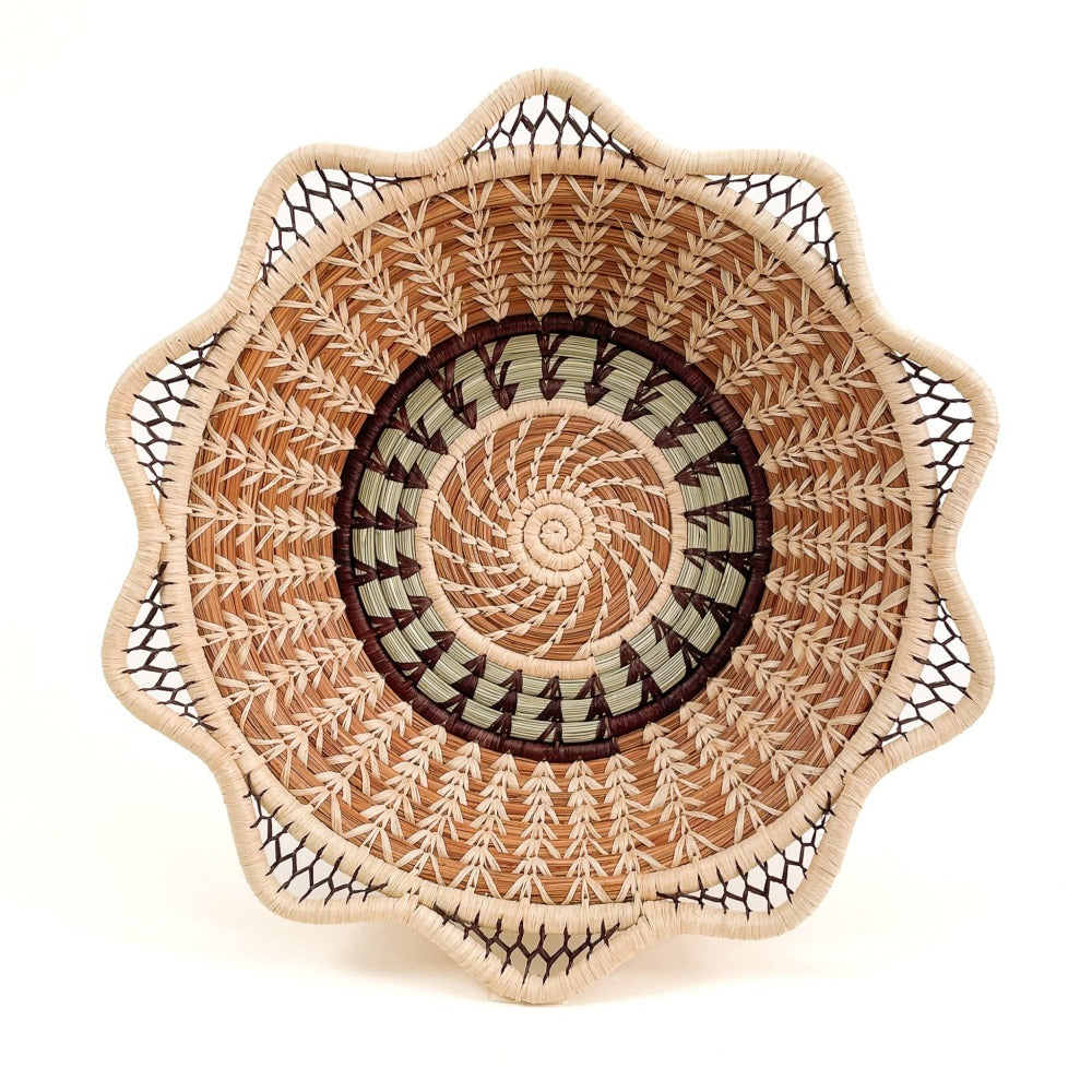 Beautiful Martina Basket is delicately handwoven of pajón, a native grass of the Guatemalan Highlands, and sustainably harvest longleaf pine needles with raffia accents. Designed and handmade by the women of Mayan Hands El Triunfo cooperative, this basket is a wonderful wall or tabletop accent, but was designed to be used! Native grass, pine needles, raffia 11" diameter, 2.25" high