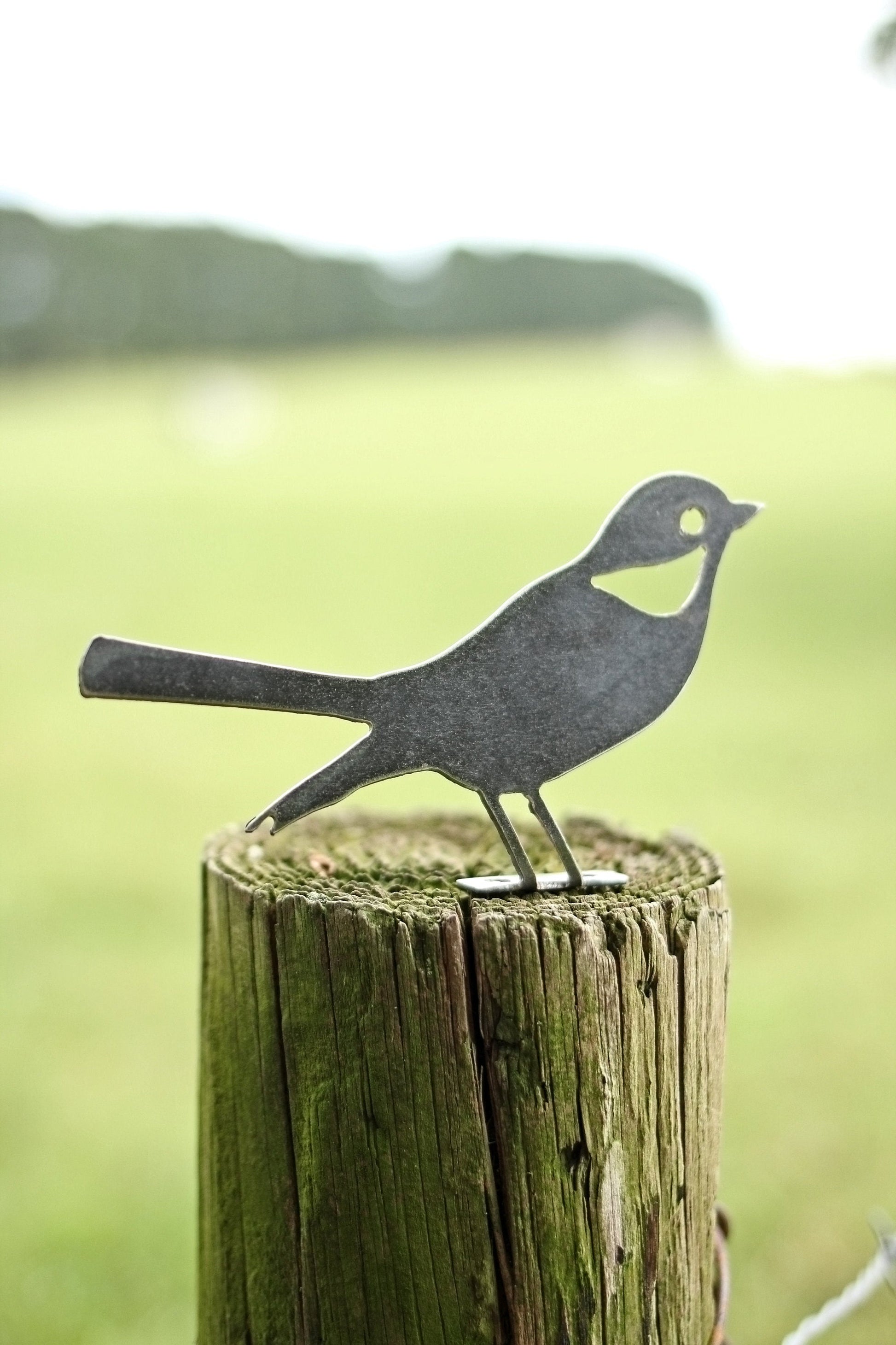Cheerful decoration for your backyard or garden. Use screws (included) to attach this bird to your decking, a fence post or other fixture. Two screw holes are made into the bottom of the piece.