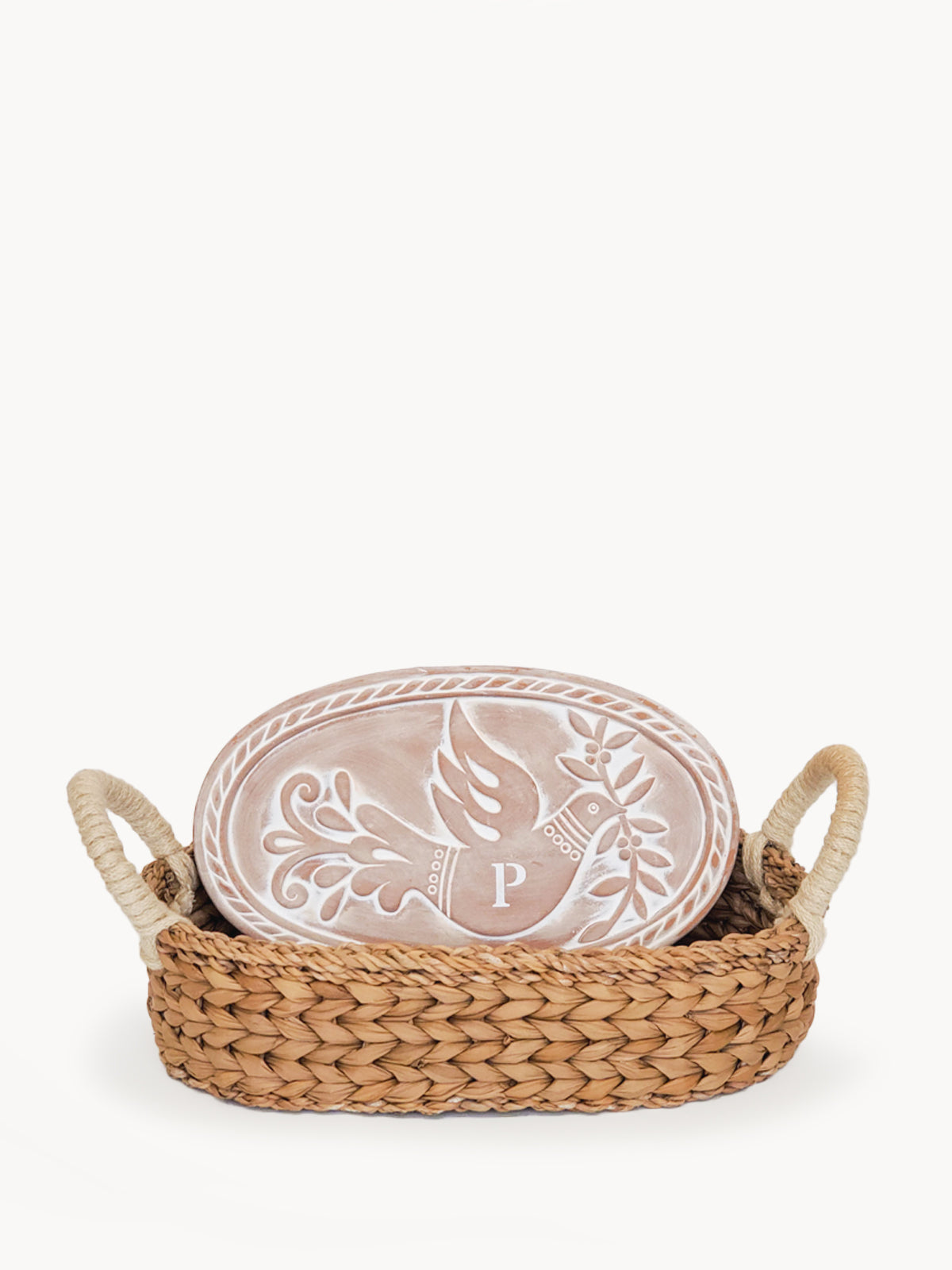 Here, our terracotta plate has been engraved with a bird & leaf design and cut to fit neatly into an oval basket. This special bread warmer is naturally insulating, and the basket itself has been handwoven from sustainably grown seagrass. It’s the best gift item for anyone who loves bread!