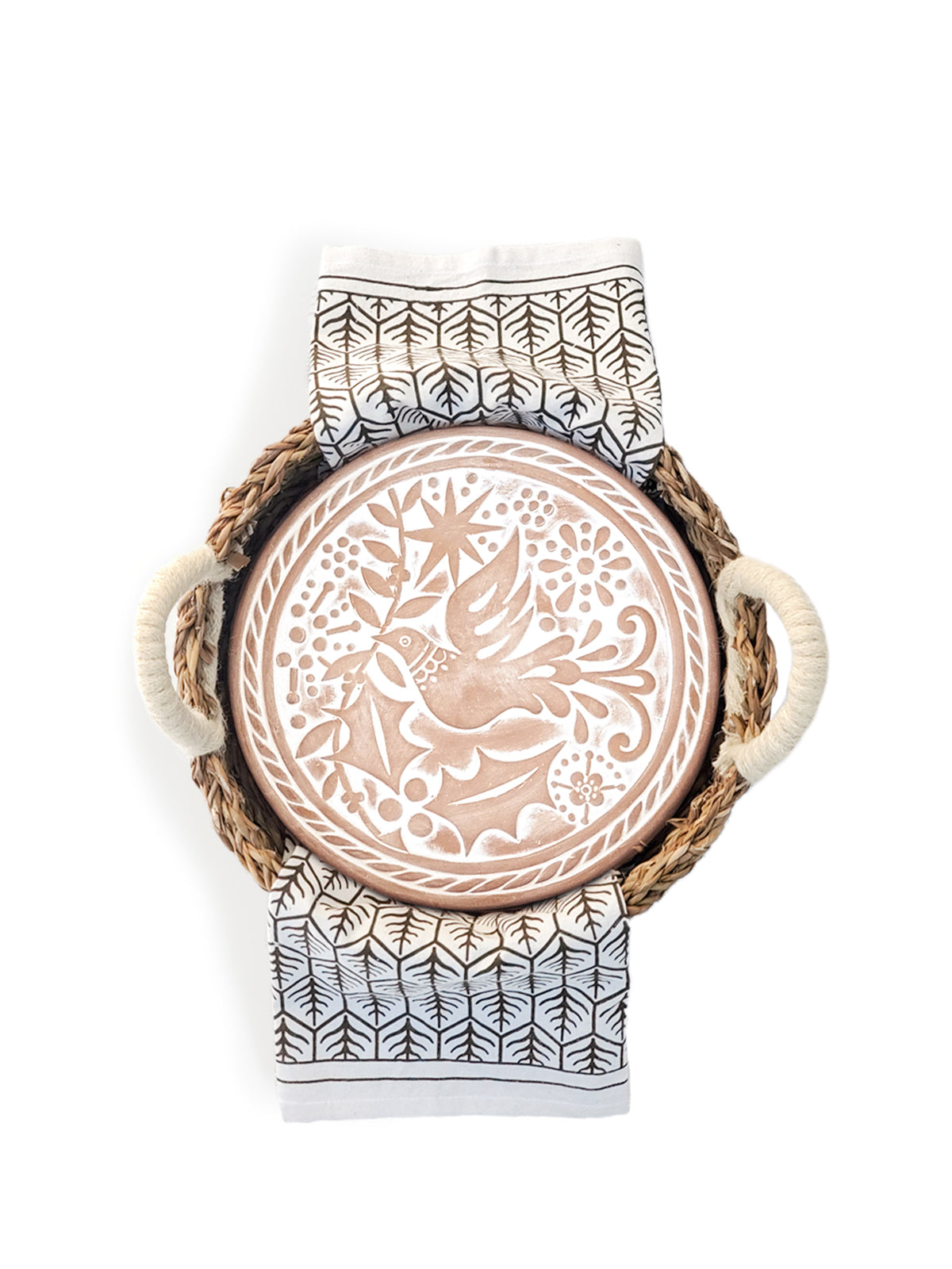 (1) Terracotta Breadwarmer, (1) Seagrass basket and (1) Tea towel of your choice.