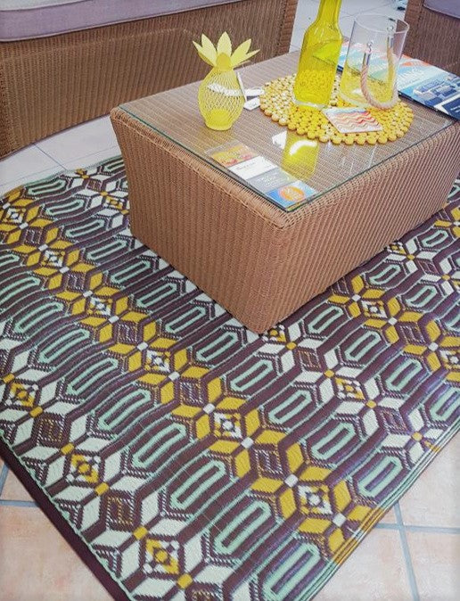Bring home a little North African style with this classic Berber repeat pattern. Simple and elegant, this contemplative design almost begs you and your guests to plop down around the tagine and dip in! Mad Mats® are made from 100% recycled plastic, are UV protected and fade-proof, and come with our one-year color guarantee. Because our rugs are handmade, pattern, color and size may vary slightly.