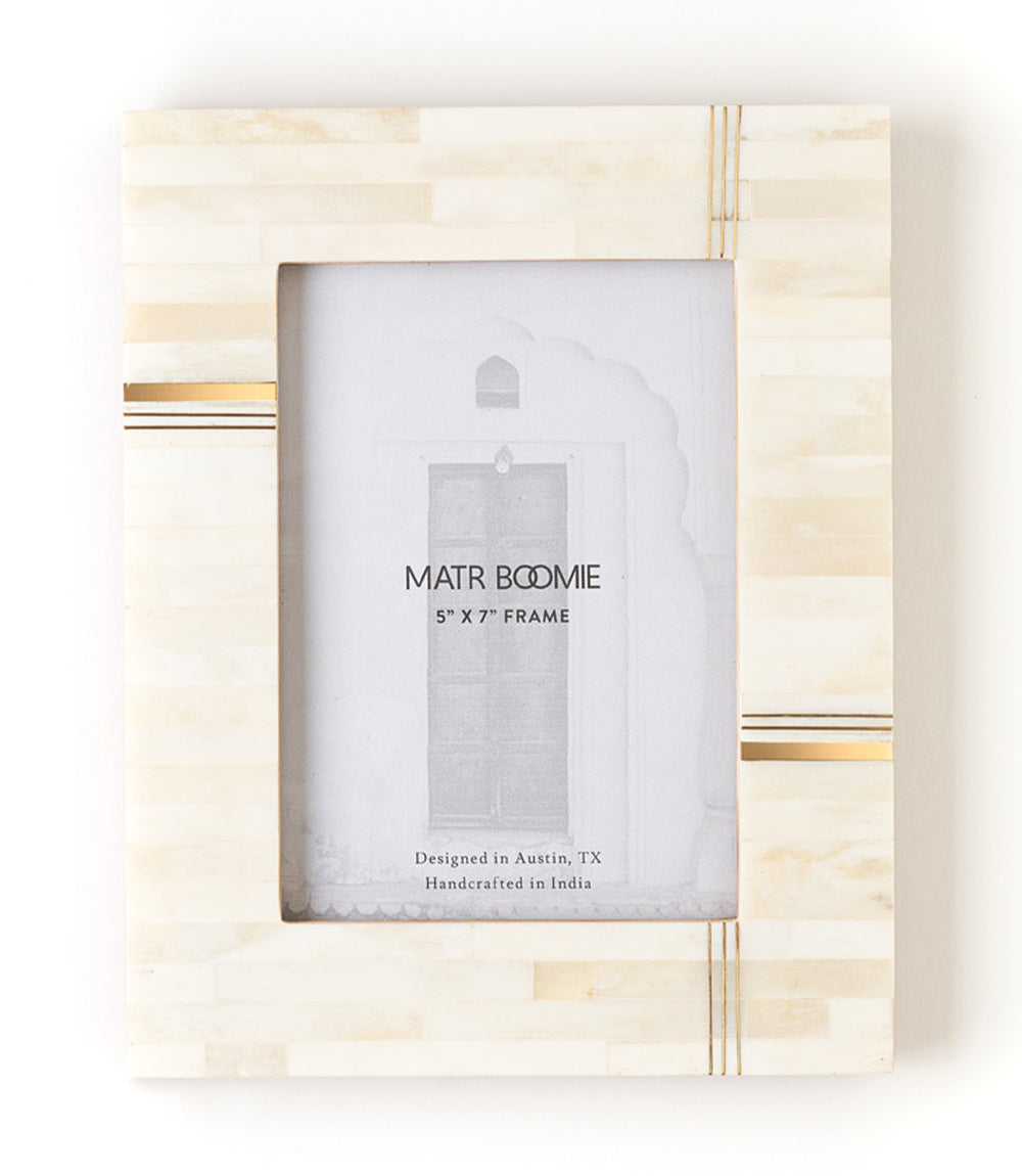 Our Mukhendu Collection incorporates traditional Indian art forms of Old Delhi in modern, grounding designs featuring ethically sourced bone tile and brass accents. This handcrafted photo frame is thoughtfully designed for stylish display with inlaid bone tile and gold finish brass bar accents. For convenient display this picture frame features a two-way table top easel and d-ring for hanging. Frame accommodates 5x7 photo or print, easily accessed with metal swivel tabs and access removable back.