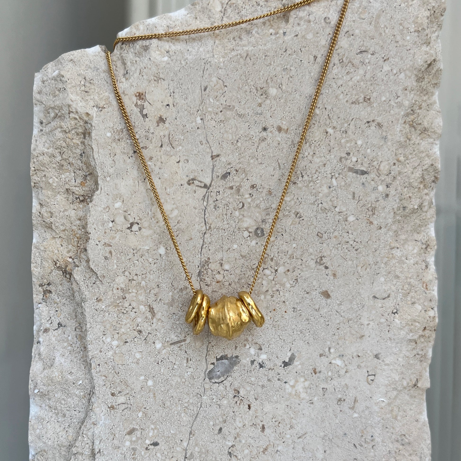Inspired by Neolithic stone beads, these hand formed beads have an amazing weight as they suspend from a classic, slinky curb chain.