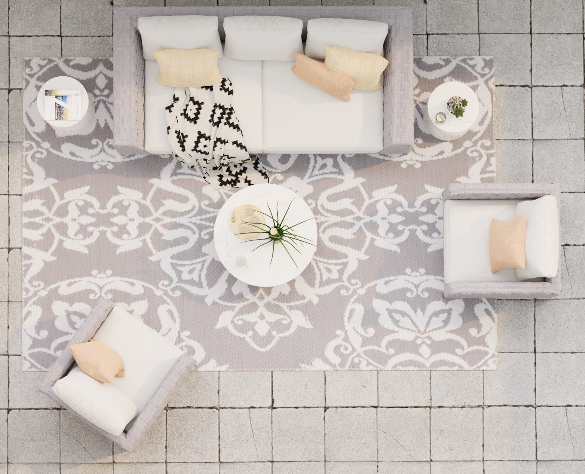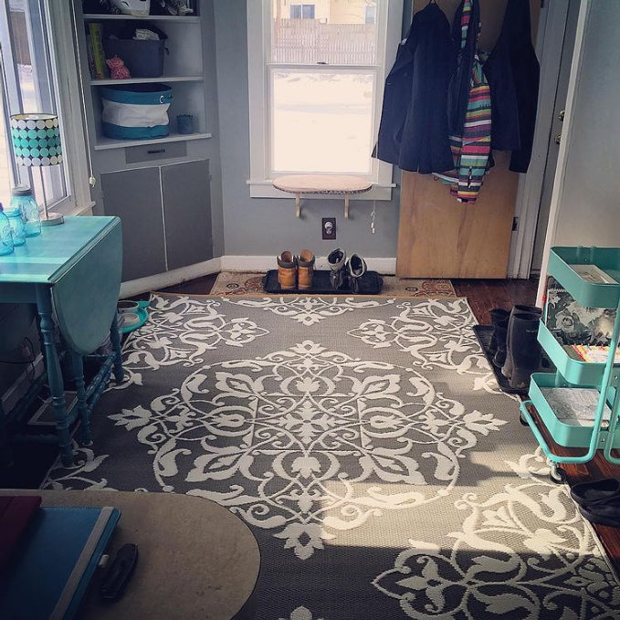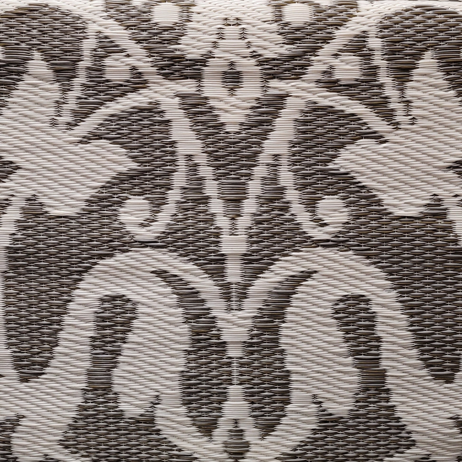 The ornate scroll work of wrought iron outdoor furnishings and grilles has dressed-up patios, balconies and back yards since the 17th century. Fully weather proof, they look great on patios, decks, and poolside. And as all our products, these mats are utterly carefree and easily cleaned with garden friendly soap and a hose. Mad Mats® are made from 100% recycled plastic, are UV protected and fade-proof, and come with our one-year color guarantee. Because our rugs are handmade, pattern, color and size may vary slightly.
