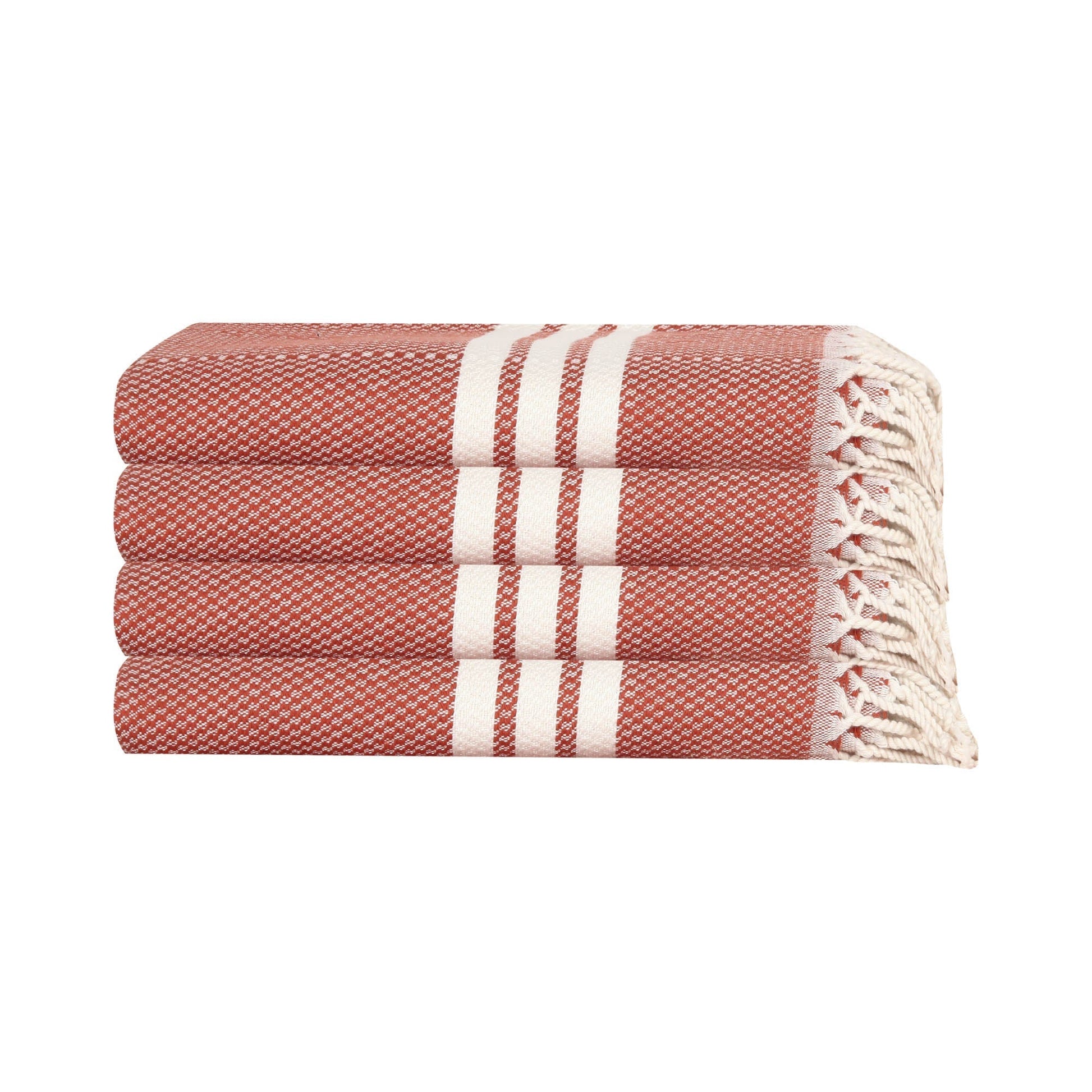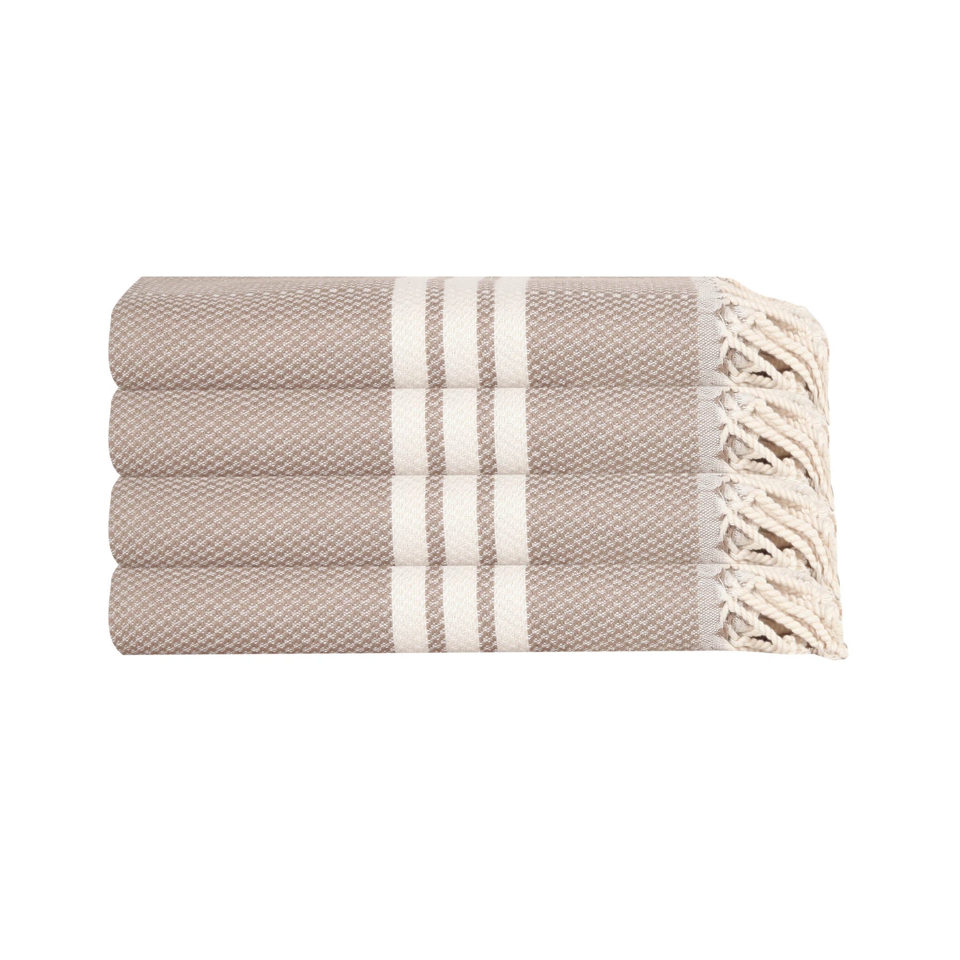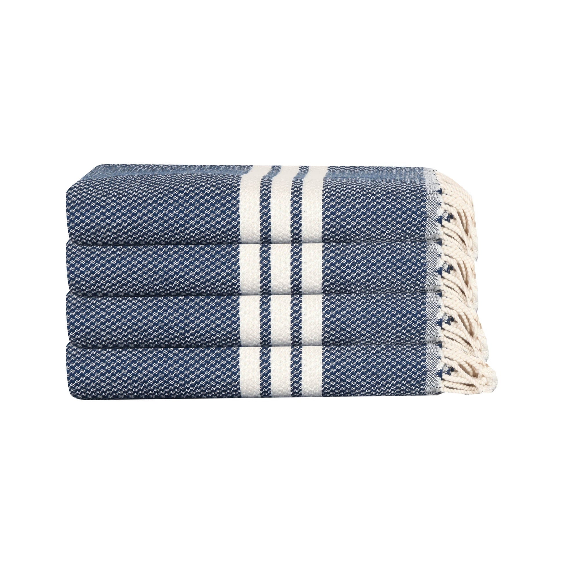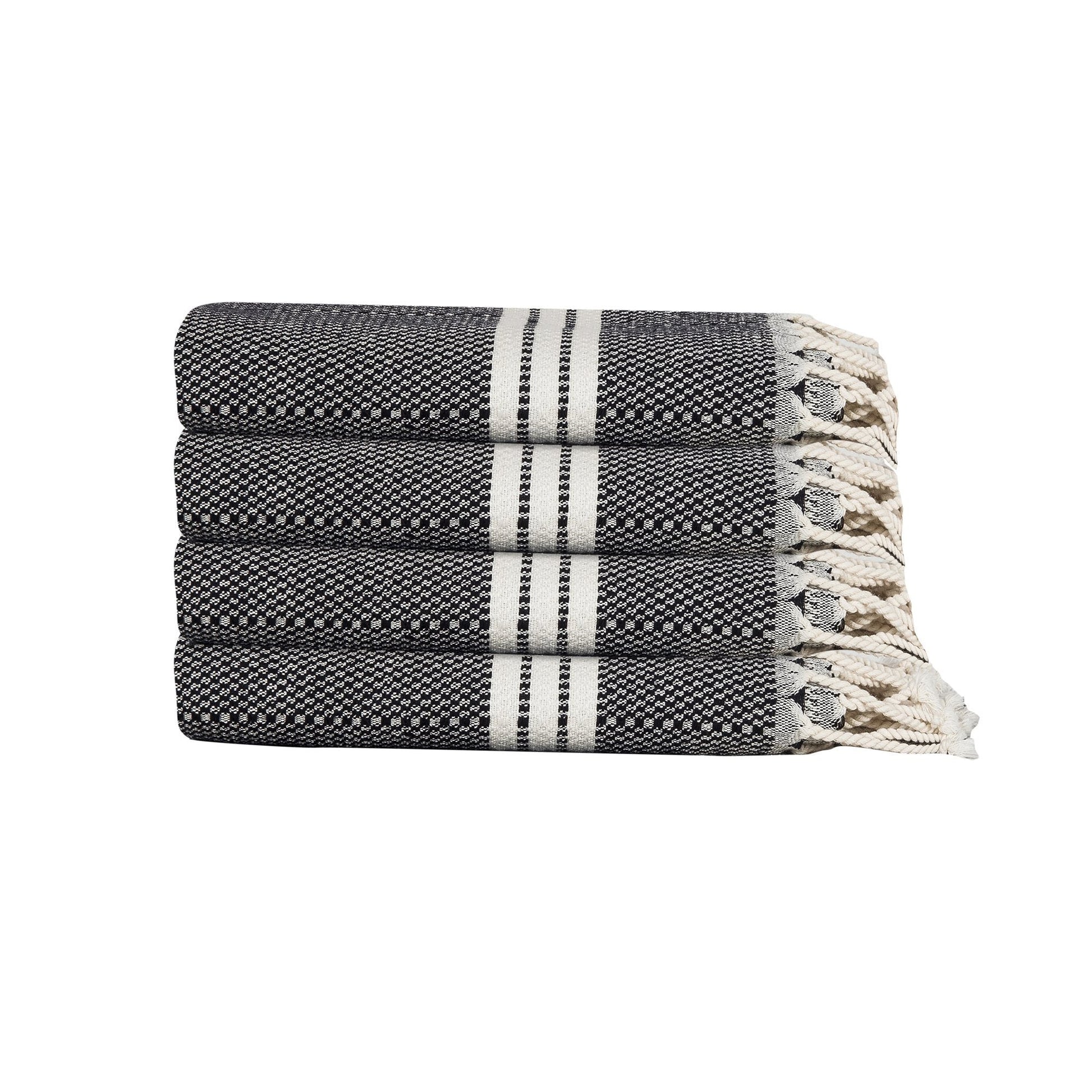 The Newport Turkish Hand / Kitchen Towel Bundle is handwoven from the finest Turkish cotton fibers. It has black dots on natural cotton color. The fringes are all hand tied with exposed threads adding to the heirloom appeal of this towel. Towel Bundle includes: 4 x Hand Towels Save 14% vs. buying separately! Each towel in the bundle is individually packaged making them perfect for gifting Loomed from yarn died, 100% long-staple Premium Turkish Cotton Elegant yet super durable and functional Lightweight, soft, absorbent and quick drying Finished with hand-knotted fringe Free of harmful chemicals and dies Made in Turkey ______________________________________________ Materials: 100% Premium Turkish Cotton Size: 20"x40" Weight: 146g/5.15oz Care: Machine wash cold or up to 30℃ in gentle cycle. Avoid fabric softeners, dryer sheets and bleach. Air Dry or Tumble Dry low heat in gentle cycle. We recommend Air Dry as Turkish towels air dry quickly, so you may hang them to dry. Fringes of Turkish Towels are handcrafted. They are very nice and durable but, sometimes may come untied. There is a simple process to fix untied fringes on a Turkish Towel. Learn how here⇒ How to Easily Fix Untied Fringes on Turkish Towels Handcrafted by Olive and Linen ______________________________________________