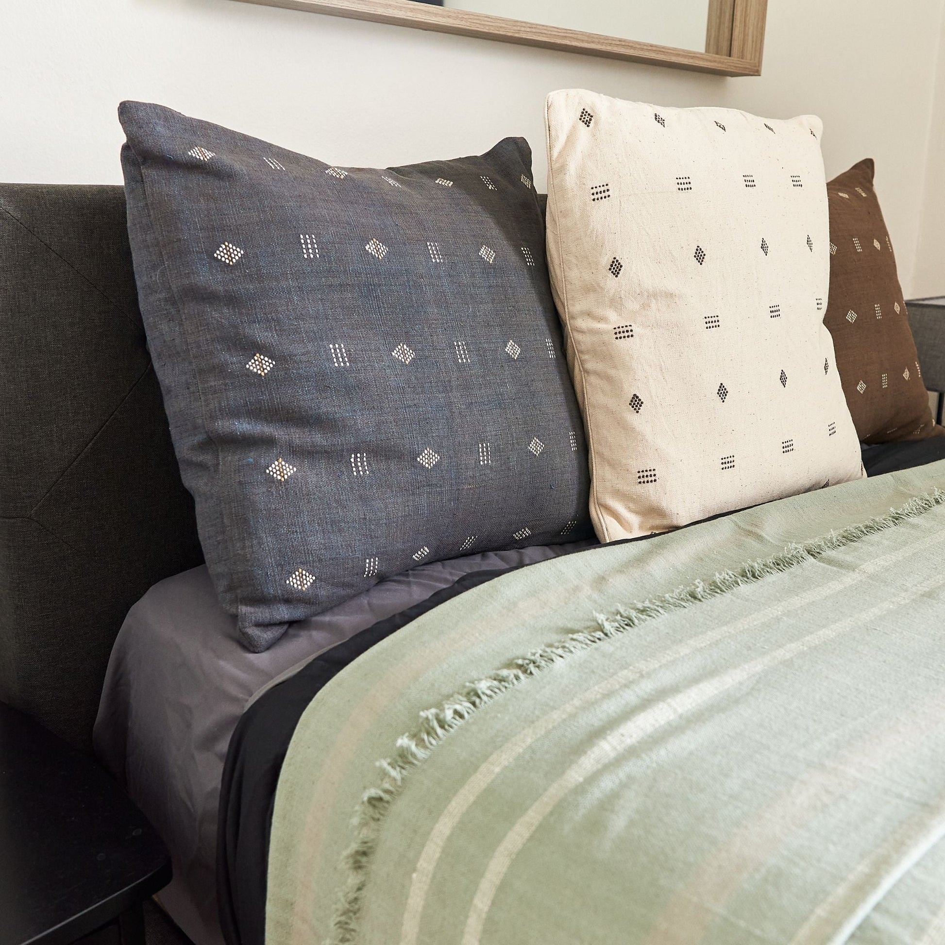 Nira White Pillow is a slightly textured handwoven pillow where our artisans have skillfully created a classic pattern using an ancient weaving technique. Undyed yarn is used with the black design elements that minimally stand out The dyes are completely natural made by using flowers & herbs. The beauty of this pillow is in its pure design that stands out with also the use of undyed yarns left in its natural state. We are using a 700 year old weaving technique, which only this specific artisan cluster is known to using. As this pillow is 100% handmade from start to finish, each piece is unique and will have a slight variation which is the beauty of the handmade process. Requiring attention to detail and finishing, It takes an incredibly skillful master artisan to make this special piece which is unique to the artisan cluster it originates from. Pillow Size: 20" X 20" ( Down filler included in this price ) Material: 100% Rain-fed Organic Cotton Color: White (undyed and both yarns in its natural form ) and black for the motifs. Artisan Base: Ethically hand woven by artisans in India Wash care: Gently hand wash with cold water and hang dry or delicately dry clean only. What Makes Your Purchase Sustainable? 100% natural hand-sun yarns used. Support employment of women artisans & local farmers. 100% handmade manufacturing process by artisans. Low carbon foot print as the cotton is 100% rain-fed. Use only 100% natural + biodegradable responsibly sourced materials. Small batch production ensures higher quality & less wastage. Each product comes in a biodegradable recycled pouch.