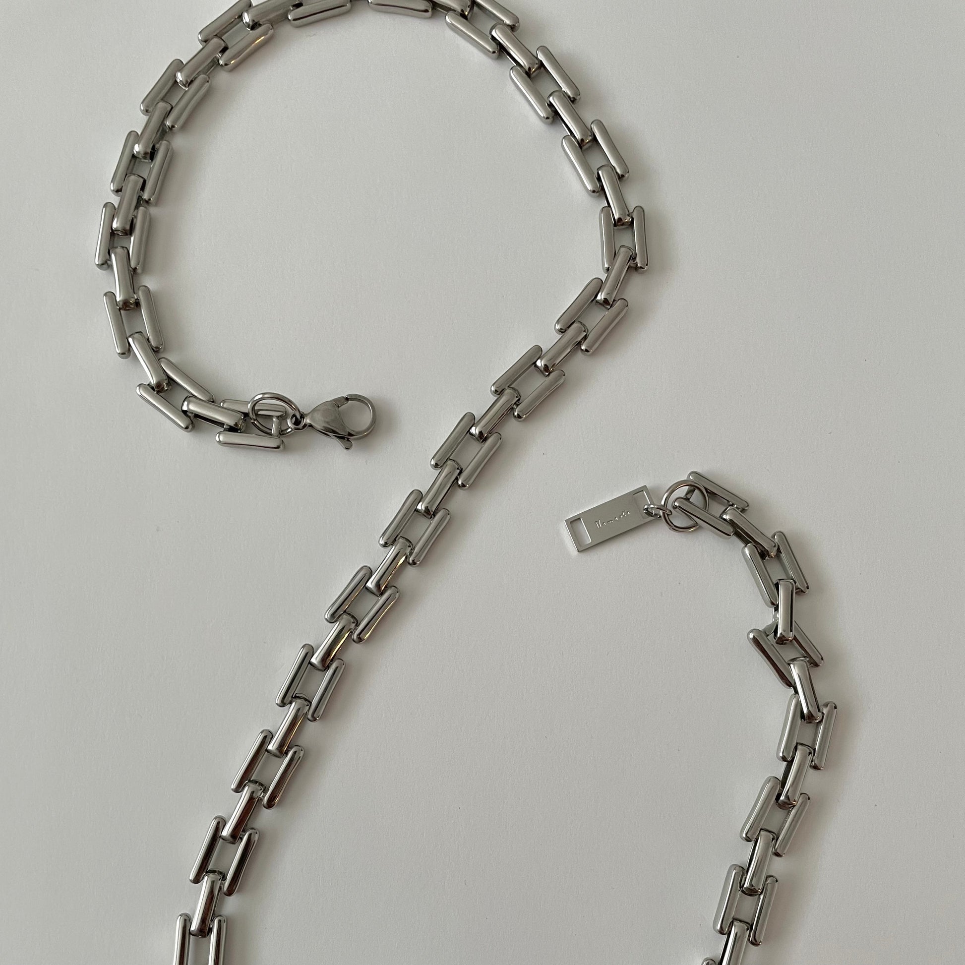 A long chunky unisex necklace featuring rectangular links with a polished steel look.